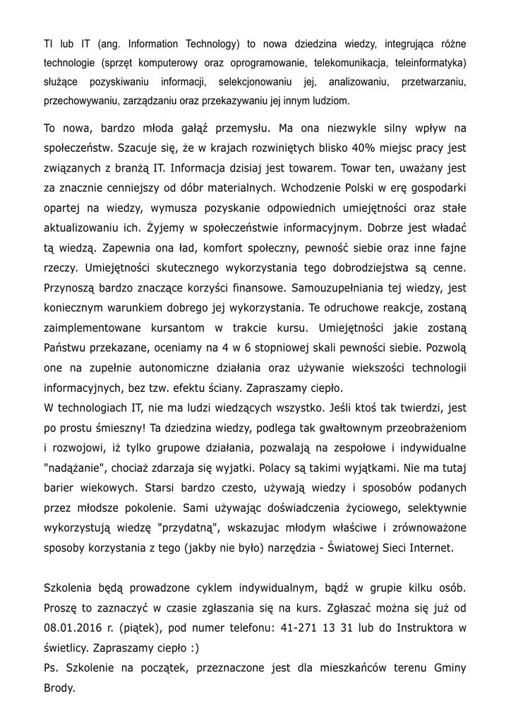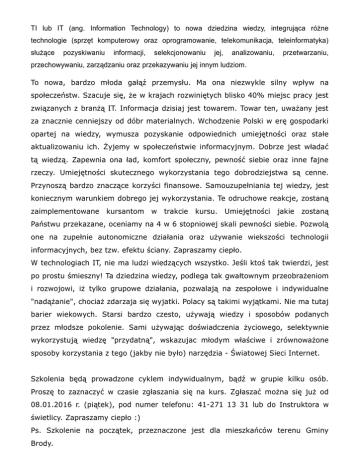 TI lub IT (ang. Information Technology) to nowa dziedzina wiedzy, integrująca różne technologie (sprzęt komputerowy oraz oprogramowanie, telekomunikacja, teleinformatyka) służące pozyskiwaniu informacji, selekcjonowaniu jej, analizowaniu, przetwarzaniu, przechowywaniu, zarządzaniu oraz przekazywaniu jej innym ludziom. To nowa, bardzo młoda gałąź przemysłu. Ma ona niezwykle silny wpływ na społeczeństw. Szacuje się, że w krajach rozwiniętych blisko 40% miejsc pracy jest związanych z branżą IT. Informacja dzisiaj jest towarem. Towar ten, uważany jest za znacznie cenniejszy od dóbr materialnych. Wchodzenie Polski w erę gospodarki opartej na wiedzy, wymusza pozyskanie odpowiednich umiejętności oraz stałe aktualizowaniu ich. Żyjemy w społeczeństwie informacyjnym. Dobrze jest władać tą wiedzą. Zapewnia ona ład, komfort społeczny, pewność siebie oraz inne fajne rzeczy. Umiejętności skutecznego wykorzystania tego dobrodziejstwa są cenne. Przynoszą bardzo znaczące korzyści finansowe. Samouzupełniania tej wiedzy, jest koniecznym warunkiem dobrego jej wykorzystania. Te odruchowe reakcje, zostaną zaimplementowane kursantom w trakcie kursu. Umiejętności jakie zostaną Państwu przekazane, oceniamy na 4 w 6 stopniowej skali pewności siebie. Pozwolą one na zupełnie autonomiczne działania oraz używanie wiekszości technologii informacyjnych, bez tzw. efektu ściany. Zapraszamy ciepło. W technologiach IT, nie ma ludzi wiedzących wszystko. Jeśli ktoś tak twierdzi, jest po prostu śmieszny! Ta dziedzina wiedzy, podlega tak gwałtownym przeobrażeniom i rozwojowi, iż tylko grupowe działania, pozwalają na zespołowe i indywidualne "nadążanie", chociaż zdarzaja się wyjatki. Polacy są takimi wyjątkami. Nie ma tutaj barier wiekowych. Starsi bardzo czesto, używają wiedzy i sposobów podanych przez młodsze pokolenie. Sami używając doświadczenia życiowego, selektywnie wykorzystują wiedzę "przydatną", wskazujac młodym właściwe i zrównoważone sposoby korzystania z tego (jakby nie było) narzędzia - Światowej Sieci Internet. Szkolenia będą prowadzone cyklem indywidualnym, bądź w grupie kilku osób. Proszę to zaznaczyć w czasie zgłaszania się na kurs. Zgłaszać można się już od 08.01.2016 r. (piątek), pod numer telefonu: 41-271 13 31 lub do Instruktora w świetlicy. Zapraszamy ciepło :) Ps. Szkolenie na początek, przeznaczone jest dla mieszkańców terenu Gminy Brody.