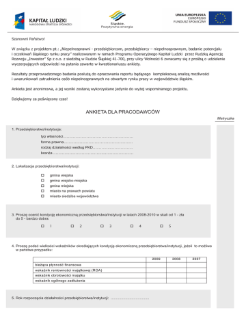 Szanowni Pañstwo! W zwi¹zku z projektem pt.: „Niepe³nosprawni - przedsiêbiorcom, przedsiêbiorcy – niepe³nosprawnym, badanie potencja³u i oczekiwañ œl¹skiego rynku pracy” realizowanym w ramach Programu Operacyjnego Kapita³ Ludzki przez Rudzk¹ Agencjê Rozwoju „Inwestor” Sp z o.o. z siedzib¹ w Rudzie Œl¹skiej 41-700, przy ulicy Wolnoœci 6 zwracamy siê z proœb¹ o udzielenie wyczerpuj¹cych odpowiedzi na pytania zawarte w kwestionariuszu ankiety. Rezultaty przeprowadzonego badania pos³u¿¹ do opracowania raportu bêd¹cego kompleksow¹ analiz¹ mo¿liwoœci i uwarunkowañ zatrudnienia osób niepe³nosprawnych na otwartym rynku pracy w województwie œl¹skim. Ankieta jest anonimowa, a jej wyniki zostan¹ wykorzystane jedynie do wy¿ej wspominanego projektu. Dziêkujemy za poœwiêcony czas! ANKIETA DLA PRACODAWCÓW Metryczka 1. Przedsiêbiorstwo/instytucja: typ w³asnoœci………………………………..………………. forma prawna……………………………….………………. rodzaj dzia³alnoœci wed³ug PKD…………...……………… bran¿a …………………………………..…………………… 2. Lokalizacja przedsiêbiorstwa/instytucji: gmina wiejska o gmina wiejsko-miejska o gmina miejska o miasto na prawach powiatu o miasto siedziba województwa o 3. Proszê oceniæ kondycjê ekonomiczn¹ przedsiêbiorstwa/instytucji w latach 2008-2010 w skali od 1 - z³a do 5 - bardzo dobra: o 1 o 2 o 3 o 4 o 5 4. Proszê podaæ wielkoœci wskaŸników okreœlaj¹cych kondycjê ekonomiczn¹ przedsiêbiorstwa/instytucji, je¿eli to mo¿liwe w pañstwa przypadku: 2009 bie¿¹ca p³ynnoœæ finansowa wskaŸnik rentownoœci maj¹tkowej (ROA) wskaŸnik obrotowoœci maj¹tku wskaŸnik ogólnego zad³u¿enia 5. Rok rozpoczêcia dzia³alnoœci przedsiêbiorstwa/instytucji: ..................................... 2008 2007 Diagnoza 6. Formy zatrudnienia – podaj aktualn¹ liczbê zatrudnionych osób: OGÓ£EM NIEPE£NOSPRAWNI zatrudnienie pracownicze (umowne stosunki pracy) - um owa o pracê: na czas nieokreœlony na czas okreœlony okres próbny na zastêpstwo na czas wykonywania okreœlonej pracy - wymiar czasu pracy: pe³ny etat 3/4 etatu 1/2 etatu 1/3 etatu 1/4 etatu zatrudnienie niepracownicze (typ cywilnoprawny) umowa zlecenia um owa o dzie³o umowa agencyjna kontrakt mened¿erski inne: praca tymczasowa praca nak³adcza telepraca praca sezonowa praca tylko w weekendy samozatrudnienie zatrudnienie subsydiowane z Urzêdu Pracy praca z pomoc¹ asystenta osoby niepe³nosprawnej wolontariat 7. Liczba zatrudnionych wed³ug typu i stopnia niepe³nosprawnoœci: lekki stopieñ niepe³nosprawnoœci umiarkowany znaczny narz¹du ruchu narz¹du s³uchu narz¹du wzroku choroby somatyczne choroby psychiczne intelektualna sprzê¿ona inne RAZEM 8. Zatrudnienie osób niepe³nosprawnych wed³ug grup zawodów – liczba osób: 2 wyszczególnienie przedstawiciele w³adz publicznych, wy¿si urzêdnicy i kierownicy specjaliœci technicy i inny œredni personel pracownicy biurowi pracownicy us³ug osobistych i sprzedawcy rolnicy, ogrodnicy, leœnicy i rybacy robotnicy przemys³owi i rzemieœlnicy operatorzy i monterzy maszyn i urz¹dzeñ pracownicy przy pracach prostych si³y zbrojne inne …………………………………………………………………….. 2009 2010 9. Charakterystyka zatrudnionych osób niepe³nosprawnych – liczba osób: wed³ug p³ci: K …....…. M …....…. wed³ug wieku : 15-24 …………….. 25-34 …………….. 35-44 …………….. 45-54 …………….. 55-64 …………….. 18-60/65 …………….. wed³ug wykszta³cenia: wy¿sze magisterskie …………….. wy¿sze zawodowe …………….. policealne …………….. œrednie zawodowe …………….. œrednie ogólnokszta³c¹ce …………….. zasadnicze zawodowe …………….. gimnazjalne i poni¿ej …………….. wed³ug sta¿u pracy: do 1 roku …..…. od 1 roku do 3 lat …..…. powy¿ej 3 lat …..…. 10. Przyjêcia/zwolnienia – w tym liczba osób niepe³nosprawnych – w latach 2008-2010( na dzieñ badania) ogó³em w tym niepe³nosprawnych przyjêcia: z inicjatywy pracodawcy z inicjatywy osoby niepe³nosprawnej na podstawie skierowania zwolnienia: z przyczyn le¿¹cych po stronie pracodawcy z przyczyn le¿¹cych po stronie pracownika 11. Op³acanie sk³adek na PFRON a zatrudnienie osób niepe³nosprawnych: o zatrudniamy odpowiedni¹ liczbê osób niepe³nosprawnych i nie op³acamy sk³adki o zatrudniamy osoby niepe³nosprawne ale poni¿ej wymaganego wskaŸnika i op³acamy sk³adkê o nie zatrudniamy osób niepe³nosprawnych i p³acimy sk³adkê w pe³nej wysokoœci o jesteœmy zwolnieni z op³acania sk³adki, na podstawie ………..............................................……. 12. Powody zatrudniania osób niepe³nosprawnych: ekonomiczne: o zwi¹zane z dynamicznym rozwojem firmy o wynikaj¹ce z systemu kwotowego (wspieranie zatrudnienia i sk³adka na PFRON) o brak pracowników pe³nosprawnych gotowych podj¹æ oferowana pracê o finansowe formy wpieraj¹ce zatrudnienie osób niepe³nosprawnych o inne, jakie ………...............................................................................................……….. pozaekonomiczne: o wizerunek firmy o kultura organizacji o misja o inne, jakie …………...................................................................................……………… 3 13. Dzia³alnoœæ na rzecz zatrudnienia osób niepe³nosprawnych: dotycz¹ca kwalifikacji zawodowych o przyuczenie do zawodu o przekwalifikowanie o podnoszenie kwalifikacji zawodowych pracowników o inne, jakie …………..............................................................................................…….. o nie dotycz¹ca kwalifikacji zawodowych: o poprawa warunków pracy o wypoczynek o inne, jakie ………….................................................................................