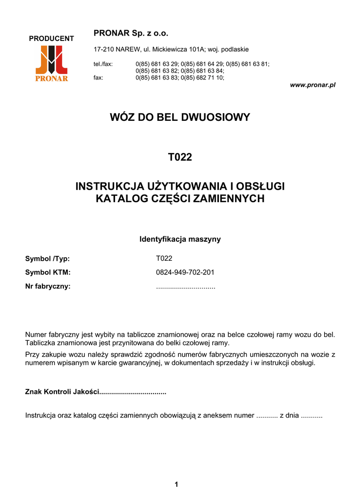 PRODUCENT PRONAR Sp. z o.o. 17-210 NAREW, ul. Mickiewicza 101A; woj. podlaskie tel./fax: fax: 0(85) 681 63 29; 0(85) 681 64 29; 0(85) 681 63 81; 0(85) 681 63 82; 0(85) 681 63 84; 0(85) 681 63 83; 0(85) 682 71 10; www.pronar.pl WÓZ DO BEL DWUOSIOWY T022 INSTRUKCJA UŻYTKOWANIA I OBSŁUGI KATALOG CZĘŚCI ZAMIENNYCH Identyfikacja maszyny Symbol /Typ: T022 Symbol KTM: 0824-949-702-201 Nr fabryczny: .............................. Numer fabryczny jest wybity na tabliczce znamionowej oraz na belce czołowej ramy wozu do bel. Tabliczka znamionowa jest przynitowana do belki czołowej ramy. Przy zakupie wozu należy sprawdzić zgodność numerów fabrycznych umieszczonych na wozie z numerem wpisanym w karcie gwarancyjnej, w dokumentach sprzedaży i w instrukcji obsługi. Znak Kontroli Jakości.................................. Instrukcja oraz katalog części zamiennych obowiązują z aneksem numer ........... z dnia ........... 1 Producent zastrzega sobie prawo wprowadzania w produkowanych maszynach zmian konstrukcyjnych, ułatwiających obsługę oraz poprawiających jakość ich pracy. Uwagi oraz spostrzeżenia na temat konstrukcji i działania maszyny prosimy przesłać pod adres producenta. Informacje te pozwolą obiektywnie ocenić wytwarzane maszyny oraz posłużą jako wskazówki przy dalszej ich modernizacji. UWAGA! Instrukcja użytkowania i obsługi stanowi podstawowe wyposażenie maszyny Przed przystąpieniem do eksploatacji użytkownik musi zapoznać się z treścią niniejszej instrukcji i przestrzegać wszystkich zawartych w niej zaleceń. Zagwarantuje to bezpieczną obsługę oraz zapewni bezawaryjną pracę maszyny. Maszynę skonstruowano zgodnie z obowiązującymi normami, dokumentami i przepisami prawnymi aktualnie obowiązującymi. 2 SPIS TREŚCI 1 2 WPROWADZENIE .................................................................................................... 5 1.1 Informacje podstawowe................................................................................ 5 1.2 Przeznaczenie wozu ...................................................................................... 5 BEZPIECZEŃSTWO UŻYTKOWANIA ..................................................................... 6 2.1 3 4 INFORMACJE DODATKOWE..................................................................................9 3.1 Wyposażenie wozu........................................................................................9 3.2 Warunki gwarancji......................................................................................... 9 3.3 Transport........................................................................................................ 9 3.4 Kasacja wozu............................................................................................... 10 INFORMACJE DOTYCZĄCE UŻYTKOWANIA ..................................................... 11 4.1 Charakterystyka techniczna ....................................................................... 11 4.2 Budowa i zasada działania ......................................................................... 11 4.2.1 4.2.2 4.2.3 4.3 4.3.1 4.3.2 4.3.3 4.3.4 4.3.5 4.3.6 4.3.7 5 Zasady poruszania się po drogach publicznych ........................................ 8 Podwozie ............................................................................................................... 11 Układ hamulcowy .................................................................................................. 12 Instalacja elektryczna, oświetlenie, sygnalizacja................................................... 15 Zasady użytkowania wozu do bel .............................................................. 17 Łączenie z ciągnikiem ........................................................................................... 17 Przygotowanie do pracy ........................................................................................ 18 Załadunek.............................................................................................................. 18 Instrukcja użytkowania opon. ................................................................................ 19 Rozładunek............................................................................................................ 20 Odłączanie od ciągnika ......................................................................................... 20 Usterki i niesprawności działania........................................................................... 20 INSTRUKCJE OBSŁUGIWANIA ............................................................................ 21 5.1 Regulacja łożysk kół jezdnych ................................................................... 21 5.2 Regulacja hamulców ................................................................................... 23 5.3 Obsługa instalacji pneumatycznej ............................................................. 24 5.4 Smarowanie ................................................................................................. 24 5.5 Obsługa układu resorowego ...................................................................... 25 5.6 Przechowywanie i konserwacja ................................................................. 25 3 Rys. 1. Wóz do bel T022 4 1 WPROWADZENIE 1.1 INFORMACJE PODSTAWOWE Instrukcja opisuje podstawowe zasady bezpiecznego użytkowania i obsługi wozu do bel. Jeśli zawarte w instrukcji informacje okażą się nie w pełni zrozumiałe należy zwrócić się o pomoc do punktu sprzedaży w którym wóz do bel został zakupiony, lub do producenta. Szczególnie ważne informacje i zalecenia których przestrzeganie jest bezwzględnie konieczne są w tekście wyróżnione poprzez wytłuszczenie tekstu lub poprzedzone słowem „UWAGA". Informacje, opisy zagrożeń i środków ostrożności oraz polecenia i nakazy związane z bezpieczeństwem użytkowania w treści instrukcji są wyróżnione znakiem: oraz wymi