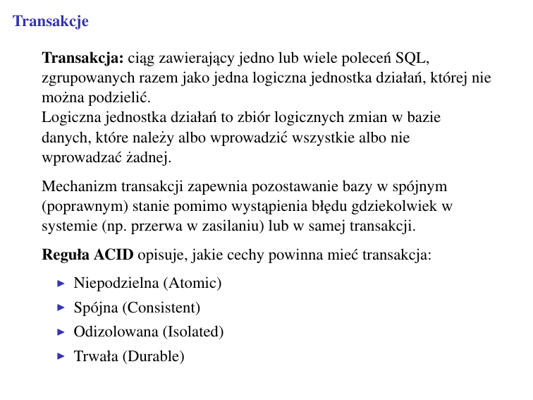 Transakcje Transakcja: ciag ˛ zawierajacy ˛ jedno lub wiele poleceń SQL, zgrupowanych razem jako jedna logiczna jednostka działań, której nie można podzielić. Logiczna jednostka działań to zbiór logicznych zmian w bazie danych, które należy albo wprowadzić wszystkie albo nie wprowadzać żadnej. Mechanizm transakcji zapewnia pozostawanie bazy w spójnym (poprawnym) stanie pomimo wystapienia ˛ bł˛edu gdziekolwiek w systemie (np. przerwa w zasilaniu) lub w samej transakcji. Reguła ACID opisuje, jakie cechy powinna mieć transakcja: I Niepodzielna (Atomic) I Spójna (Consistent) I Odizolowana (Isolated) I Trwała (Durable) DB2 zamiast nazwy "transakcja" używa poj˛ecia "jednostka pracy" (unit of work). Na wykładzie b˛edziemy tradycyjnie używali poj˛ecia transakcji. DB2 zamiast nazwy "transakcja" używa poj˛ecia "jednostka pracy" (unit of work). Na wykładzie b˛edziemy tradycyjnie używali poj˛ecia transakcji. W DB2 transakcja jest rozpoczynana niejawnie, w momencie wykonania pierwszego polecenia SQL. Transakcja jest zatwierdzana i kończy si˛e w chwili wykonania instrukcji COMMIT. Wówczas wszystkie modyfikacje danych zostaja˛ zapisane w bazie. Uwaga. Edytory SQL maja˛ cz˛esto ustawiona˛ domyślnie opcj˛e autocommit. Transakcje w takim wypadku zatwiedzane sa˛ bez wykonania przez nas instrukcji COMMIT, tylko automatycznie po wykonaniu każdej instrukcji SQL. Instrukcja ROLLBACK wycofuje wszystkie modyfikacje danych w ramach jednej transakcji. Możemy ja˛ zastosować jeśli si˛e np. pomylimy. Ta instrukcja nie zadziała, jeśli wcześniej wykonamy COMMIT. Transakcja w takim wypadku została już zakończona. I Dowolna transakcja w bazie danych powinna być odizolowana od wszystkich pozostałych transakcji, które sa˛ wykonywane w tym samym czasie. I W idealnej sytuacji każda transakcja zachowuje si˛e tak, jakby posiadała wyłaczny ˛ dost˛ep do bazy danych. I Niestety, realia zwiazane ˛ z wymaganiem osiagni˛ ˛ ecia dobrej wydajności wymuszaja˛ poszukiwanie kompromisów (pomi˛edzy izolowaniem transakcji a wydajnościa˛ bazy). Dane zatwierdzone (committed) i niezatwierdzone (uncommitted) Dane zatwierdzone (committed data) charakteryzuja˛ si˛e tym, że I sa˛ spójne w bazie danych; I zostały zatwierdzone za pomoca˛ polecenia COMMIT (wydanego w sposób jawny lub nie); I zatwierdzone zmiany moga˛ zostać wycofane (usuni˛ ete) jedynie za pomoca kolejnego polecenia (lub kilku poleceń) SQL, w nowej transakcji; I sa˛ widoczne i dost˛ epne dla wszystkich użytkowników i aplikacji. Dane niezatwierdzone (uncommitted data) charakteryzuja˛ si˛e tym, że I moga˛ nie być spójne w bazie danych; I sa to zmiany, które zostały wprowadzone w bieżacej ˛ transakcji, zanim zostało wydane polecenie COMMIT; I moga˛ zostać wycofane za pomoca kolejnego polecenia ROLLBACK; I nie sa˛ widoczne ani dost˛ epne dla innych użytkowników i aplikacji (od tej zasady sa˛ wyjatki). Współbieżność w DB2 W sytuacji, gdy wielu użytkowników (aplikacji) jednocześnie uzyskuje dost˛ep do tych samych zasobów, mówimy o współbieżnym dost˛epie. Jeżeli w danym momencie dost˛ep do danych uzyskuje wiele transakcji, może to prowadzić do niepożadanych ˛ zjawisk, wśród których wyróżniamy: I Utracone aktualizacje (Lost Update); I Brudny odczyt (Uncommitted Read); I Odczyty nie dajace ˛ si˛e powtórzyć (Non-repeatable Read); I Odczyty widmo (Phantom Read). Wynika stad ˛ konieczność kontroli nad stopniem współbieżności danych, aby zachować I odpowiednia˛ stabilność danych; I nie tracac ˛ wymaganej wydajności. Niepożadane ˛ zjawiska zwiazane ˛ z problemem współbieżnego dost˛epu: I Utracone aktualizacje (Lost Update) - zachodzi gdy dwie transakcje odczytuja˛ te same dane i obie próbuja˛ je zmodyfikować, co skutkuje utrata˛ zmian wprowadzonych przez jedna˛ z nich, np. transakcja nr 1 i transakcja nr 2 odczytuja˛ ten sam wiersz danych i obliczaja˛ nowe wartości danych, na podstawie tego, jakie wartości aktualnie si˛e w tym wierszu znajduja; ˛ transakcja nr 1 aktualizuje wiersz za pomoca˛ wyliczonej wartości, nast˛epnie to samo robi transakcja nr 2; zmiana wprowadzona przez transakcj˛e nr 1 jest utracona. Niepożadane ˛ zjawiska zwiazane ˛ z problemem współbieżnego dost˛epu: I Utracone aktualizacje (Lost Update) - zachodzi gdy dwie transakcje odczytuja˛ te same dane i obie próbuja˛ je zmodyfikować, co skutkuje utrata˛ zmian wprowadzonych przez jedna˛ z nich, np. transakcja nr 1 i transakcja nr 2 odczytuja˛ ten sam wiersz danych i obliczaja˛ nowe wartości danych, na podstawie tego, jakie wartości aktualnie si˛e w tym wierszu znajduja; ˛ transakcja nr 1 aktualizuje wiersz za pomoca˛ wyliczonej wartości, nast˛epnie to samo robi transakcja nr 2; zmiana wprowadzona przez transakcj˛e nr 1 jest utracona. I Brudny odczyt (Uncommitted Read) - ma miejsce wtedy, gdy pewne instrukcje SQL wewnatrz ˛ jednej transakcji odczytuja˛ dane, które zostały zmienione przez inna˛ transakcj˛e, ale nie zatwierdzone jeszcze poleceniem COMMIT; jeżeli pierwsza transakcja zostanie wycofana poleceniem ROLLBACK, druga transakcja odczytała dane, które nigdy tak naprawd˛e nie były zapisane w bazie. I Odczyty nie dajace ˛ si˛e powtórzyć (Non-repeatable Read) zachodzi wtedy, gdy transakcja odczytuje zbiór danych, nast˛epnie czyta dane ponownie i okazuje si˛e, że dane nie sa˛ identyczne, np. transakcja nr 1 odczytuje wiersz danych, potem transakcja nr 2 zmienia albo usuwa ten wiersz i zatwierdza zmiany COMMIT; kiedy transakcja nr 1 ponownie odczytuje ten sam wiersz, otrzymuje inne dane (jeżeli wiersz został zmodyfikowany) lub okazuje si˛e, że takiego wiersza nie ma (został usuni˛ety). I Odczyty nie dajace ˛ si˛e powtórzyć (Non-repeatable Read) zachodzi wtedy, gdy transakcja odczytuje zbiór danych, nast˛epnie czyta dane ponownie i okazuje si˛e, że dane nie sa˛ identyczne, np. transakcja nr 1 odczytuje 