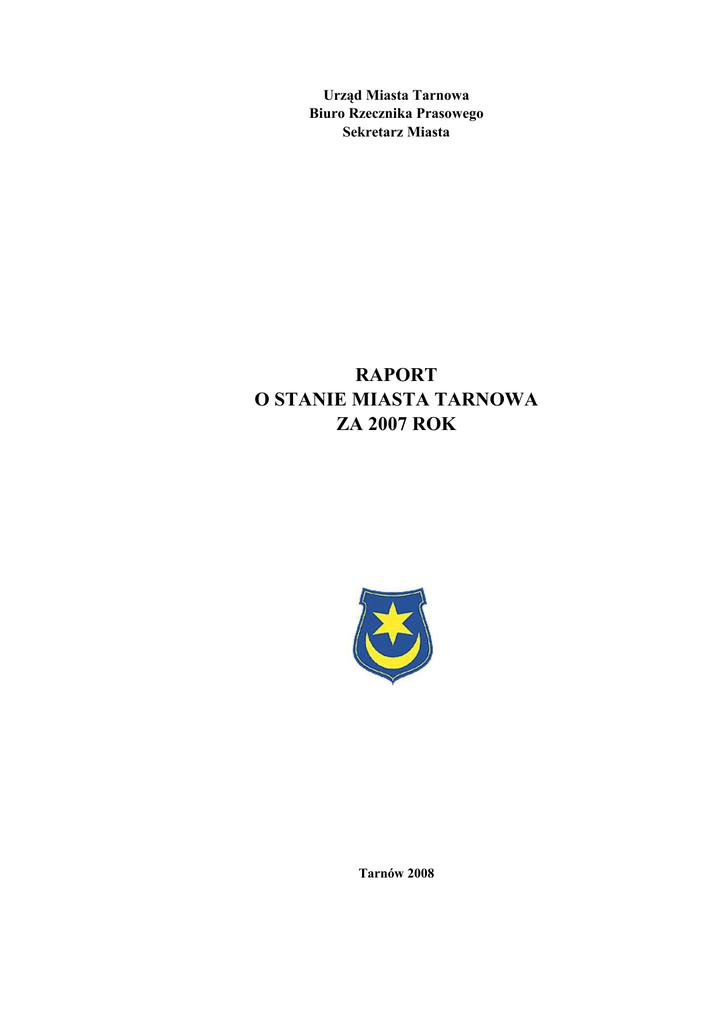 Urząd Miasta Tarnowa Biuro Rzecznika Prasowego Sekretarz Miasta RAPORT O STANIE MIASTA TARNOWA ZA 2007 ROK Tarnów 2008 Raport o stanie miasta Tarnowa za 2007 rok 2 Raport o stanie miasta Tarnowa za 2007 rok WSTĘP .......................................................................................................................................5 1. DEMOGRAFIA ......................................................................................................................6 1.1. Liczba ludności .................................................................................................................6 1.2. Gęstość zaludnienia ..........................................................................................................6 1.3. Przyrost naturalny .............................................................................................................7 1.4. Migracje ............................................................................................................................7 2. STRATEGIA ROZWOJU MIASTA ......................................................................................8 3. GOSPODARKA ...................................................................................................................11 3.1. Największe przedsiębiorstwa i firmy .............................................................................11 3.2. Prywatna przedsiębiorczość i kapitał zagraniczny w Tarnowie .....................................13 3.3. Instytucje otoczenia biznesu ...........................................................................................13 3.4. Zezwolenia na prowadzenie działalności gospodarczej .................................................13 4. RYNEK PRACY ..................................................................................................................14 4.1. Poziom i struktura bezrobocia ........................................................................................14 4.2. Zatrudnienie ....................................................................................................................17 4.3. Działania na rzecz bezrobotnych ....................................................................................19 5. INWESTYCJE ......................................................................................................................21 5.1. Klimat dla inwestowania ................................................................................................21 5.2. Inwestycje realizowane przez Urząd Miasta Tarnowa ...................................................23 5.3. Inwestycje spółek miejskich ...........................................................................................23 5.4. Inwestycje drogowe ........................................................................................................26 5.5. Gospodarka wodno-ściekowa .........................................................................................27 5.6. Gospodarka odpadami i oczyszczanie miasta ................................................................27 5.7. Zieleń miejska ................................................................................................................27 5.8. Oświetlenie ulic, placów i dróg ......................................................................................28 5.9. SłuŜba zdrowia ...............................................................................................................28 5.10. Pomoc społeczna ..........................................................................................................29 5.11. Tarnowski Ośrodek Sportu i Rekreacji ........................................................................30 6. KOMUNIKACJA I TRANSPORT ......................................................................................31 6.1. Organizacja ruchu ...........................................................................................................31 6.2. Parkingi...........................................................................................................................32 6.3. ŚcieŜki rowerowe ...........................................................................................................32 6.4. Stan motoryzacji .............................................................................................................32 7. GOSPODARKA KOMUNALNA ........................................................................................34 7.1. Gospodarka odpadami ....................................................................................................34 7.2. Działalność jednostek związanych z gospodarką komunalną ........................................34 8. ŚRODOWISKO NATURALNE ..........................................................................................36 8.1. Stan środowiska ..............................................................................................................36 8.2. Edukacja ekologiczna .....................................................................................................37 9. MIESZKALNICTWO ..........................................................................................................38 9.1. Zasoby lokalowe gminy .................................................................................................38 9.2. Dodatki mieszkaniowe ...................................................................................................39 10. EDUKACJA .......................................................................................................................40 10.1. Ogólna charakterystyka ................................................................................................40 10.2. Oferta edukacyjna Tarnowa .........................................................................................42 10.3. Szkolnictwo specjalne .............