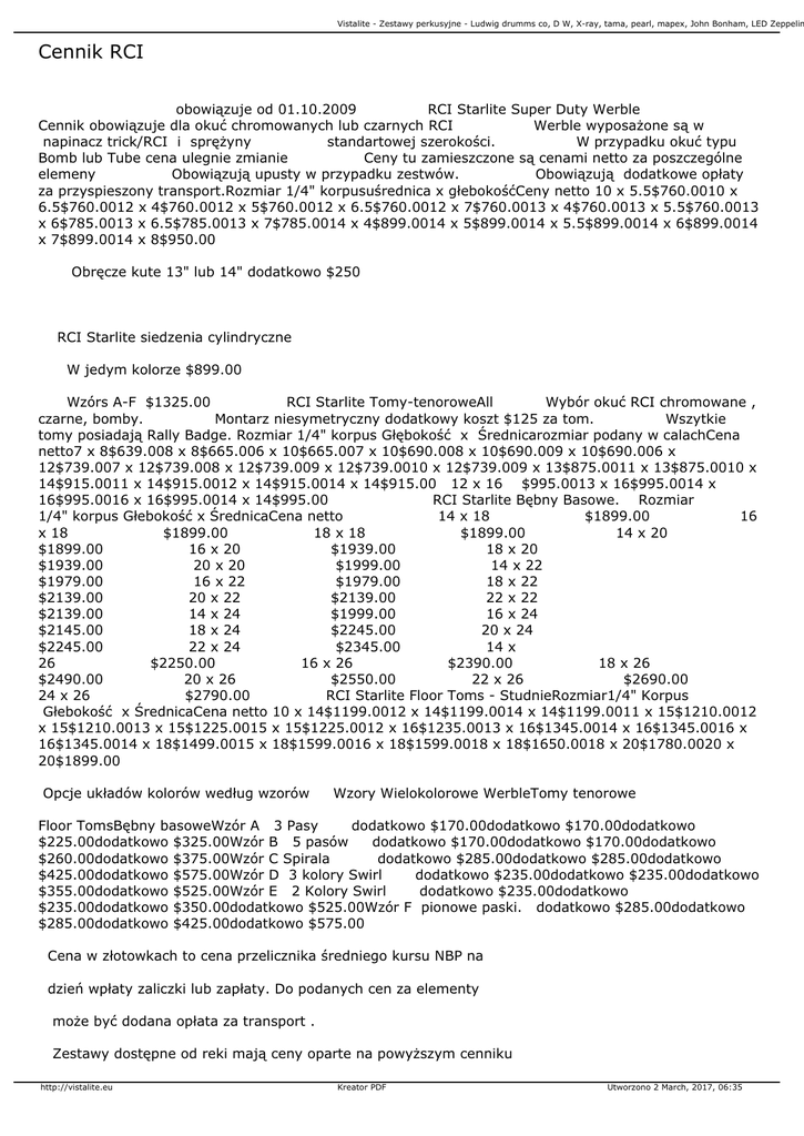 Vistalite - Zestawy perkusyjne - Ludwig drumms co, D W, X-ray, tama, pearl, mapex, John Bonham, LED Zeppelin Cennik RCI obowiązuje od 01.10.2009 RCI Starlite Super Duty Werble Cennik obowiązuje dla okuć chromowanych lub czarnych RCI Werble wyposażone są w napinacz trick/RCI i sprężyny standartowej szerokości. W przypadku okuć typu Bomb lub Tube cena ulegnie zmianie Ceny tu zamieszczone są cenami netto za poszczególne elemeny Obowiązują upusty w przypadku zestwów. Obowiązują dodatkowe opłaty za przyspieszony transport.Rozmiar 1/4" korpusuśrednica x głebokośćCeny netto 10 x 5.5$760.0010 x 6.5$760.0012 x 4$760.0012 x 5$760.0012 x 6.5$760.0012 x 7$760.0013 x 4$760.0013 x 5.5$760.0013 x 6$785.0013 x 6.5$785.0013 x 7$785.0014 x 4$899.0014 x 5$899.0014 x 5.5$899.0014 x 6$899.0014 x 7$899.0014 x 8$950.00 Obręcze kute 13" lub 14" dodatkowo $250 RCI Starlite siedzenia cylindryczne W jedym kolorze $899.00 Wzórs A-F $1325.00 RCI Starlite Tomy-tenoroweAll Wybór okuć RCI chromowane , czarne, bomby. Montarz niesymetryczny dodatkowy koszt $125 za tom. Wszytkie tomy posiadają Rally Badge. Rozmiar 1/4" korpus Głębokość x Średnicarozmiar podany w calachCena netto7 x 8$639.008 x 8$665.006 x 10$665.007 x 10$690.008 x 10$690.009 x 10$690.006 x 12$739.007 x 12$739.008 x 12$739.009 x 12$739.0010 x 12$739.009 x 13$875.0011 x 13$875.0010 x 14$915.0011 x 14$915.0012 x 14$915.0014 x 14$915.00 12 x 16 $995.0013 x 16$995.0014 x 16$995.0016 x 16$995.0014 x 14$995.00 RCI Starlite Bębny Basowe. Rozmiar 1/4" korpus Głebokość x ŚrednicaCena netto 14 x 18 $1899.00 16 x 18 $1899.00 18 x 18 $1899.00 14 x 20 $1899.00 16 x 20 $1939.00 18 x 20 $1939.00 20 x 20 $1999.00 14 x 22 $1979.00 16 x 22 $1979.00 18 x 22 $2139.00 20 x 22 $2139.00 22 x 22 $2139.00 14 x 24 $1999.00 16 x 24 $2145.00 18 x 24 $2245.00 20 x 24 $2245.00 22 x 24 $2345.00 14 x 26 $2250.00 16 x 26 $2390.00 18 x 26 $2490.00 20 x 26 $2550.00 22 x 26 $2690.00 24 x 26 $2790.00 RCI Starlite Floor Toms - StudnieRozmiar1/4" Korpus Głebokość x ŚrednicaCena netto 10 x 14$1199.0012 x 14$1199.0014 x 14$1199.0011 x 15$1210.0012 x 15$1210.0013 x 15$1225.0015 x 15$1225.0012 x 16$1235.0013 x 16$1345.0014 x 16$1345.0016 x 16$1345.0014 x 18$1499.0015 x 18$1599.0016 x 18$1599.0018 x 18$1650.0018 x 20$1780.0020 x 20$1899.00 Opcje układów kolorów według wzorów Wzory Wielokolorowe WerbleTomy tenorowe Floor TomsBębny basoweWzór A 3 Pasy dodatkowo $170.00dodatkowo $170.00dodatkowo $225.00dodatkowo $325.00Wzór B 5 pasów dodatkowo $170.00dodatkowo $170.00dodatkowo $260.00dodatkowo $375.00Wzór C Spirala dodatkowo $285.00dodatkowo $285.00dodatkowo $425.00dodatkowo $575.00Wzór D 3 kolory Swirl dodatkowo $235.00dodatkowo $235.00dodatkowo $355.00dodatkowo $525.00Wzór E 2 Kolory Swirl dodatkowo $235.00dodatkowo $235.00dodatkowo $350.00dodatkowo $525.00Wzór F pionowe paski. dodatkowo $285.00dodatkowo $285.00dodatkowo $425.00dodatkowo $575.00 Cena w złotowkach to cena przelicznika średniego kursu NBP na dzień wpłaty zaliczki lub zapłaty. Do podanych cen za elementy może być dodana opłata za transport . Zestawy dostępne od reki mają ceny oparte na powyższym cenniku http://vistalite.eu Kreator PDF Utworzono 2 March, 2017, 06:35 Vistalite - Zestawy perkusyjne - Ludwig drumms co, D W, X-ray, tama, pearl, mapex, John Bonham, LED Zeppelin ale mogą uwzględniać promocje. Do uzyskanej wartości w złotówkach należy zawsze dodać 22% Proszę się zapoznać z przykladowymi zestawami. http://vistalite.eu Kreator PDF Utworzono 2 March, 2017, 06:35