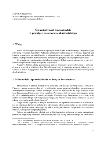 Marcin Czajkowski Wyższe Metropolitalne Seminarium Duchowne, Łódź e-mail: [email protected] Sprawiedliwość i miłosierdzie w praktyce nauczyciela akademickiego 1. Wstęp Wiele z rozlicznych problemów etycznych środowiska akademickiego związanych jest z kwestią oceniania studentów. Jednym z dylematów jakie mogą się wówczas pojawić jest kwestia pogodzenia sprawiedliwości z miłosierdziem w sytuacji gdy student odwołuje się wprost, bądź pośrednio do miłosierdzia nauczyciela, pragnąc uniknąć sprawiedliwości. W niniejszym wystąpieniu, chciałbym postawić kilka pytań związanych z tym problemem i spróbować zarysować próbę odpowiedzi. Najpierw krótko ukażę pojmowanie relacji pomiędzy sprawiedliwością i miłosierdziem w kontekście biblijnym i w filozofii starożytnej, a następnie spróbuję zobaczyć, czy wnioski z analiz mogą pomóc rozjaśnić wspomniane wyżej dylematy moralne nauczyciela akademickiego. 2. Miłosierdzie i sprawiedliwość w Starym Testamencie Miłosierdzie w Starym Testamencie określane jest na ogół słowami hesed i rahamim. Pierwszy termin oznacza dobroć i życzliwość, mając zarazem charakter wewnętrznego zobowiązania moralnego a także prawnego. Hesed w odniesieniu do Boga oznacza wierność Przymierzu, które zawarł On z Izraelem. Przymierze to było oczywiście darem i łaską, ale także zobowiązaniem w sensie prawnym. Złamanie tego Przymierza przez Izrael formalnie zwalniało Boga z obowiązku prawnego, ale właśnie wtedy hesed ukazywał się jako miłość potężniejsza niż zdrada i grzech1. Drugi termin używany w Starym Testamencie na wyrażenie miłosierdzia to rahamim. Ma on charakter darmowej miłości i w odróżnieniu od hesed odwołuje się do cech bardziej kobiecych [rehem=łono], odsyłając do takich uczuć jak: dobroć, cierpliwość oraz wyrozumiałość, czyli gotowość przebaczania2. Pojęcie sprawiedliwości z kolei, jest w Biblii pojęciem wtórnym, co może zaskakiwać, ponieważ zwykliśmy rozumieć miłosierdzie jako coś raczej nabudowanego na sprawiedliPor. A. Świderkówna, Rozmowy o Biblii, PWN, Warszawa 1995, s. 164 n, 176. Por. J. Cambier, X.L. Dufour, Miłosierdzie, [w:] Słownik Teologii Biblijnej, X.L. Dufour (red.), Pallotinum, Poznań 1990, s. 478–483, s. 479; por. także: Jan Paweł II, Dives in Misericordia, Pallotinum, przypis 52. 1 2 21 wości, czy też ewentualnie ją przekraczającego. Stary Testament jednak podkreśla, że to właśnie miłość jest pierwsza i podstawowa, i że to ona niejako warunkuje sprawiedliwość, która z kolei służy miłości. Termin sprawiedliwość oznacza często po prostu zbawienie dokonane przez miłosierdzie Boga, które jest pierwotne. Warto też zauważyć, że sprawiedliwość w Starym Testamencie nie tyle jest sprawiedliwością karzącą, lecz raczej wiernością Boga jego przymierzu w czym zbliża się do miłosierdzia w sensie heses 3. 3. Miłosierdzie i sprawiedliwość w Nowym Testamencie Jeśli chodzi o Nowy Testament, to miłosierdzie i sprawiedliwość pojawiają się wielokrotnie w różnorakich kontekstach. Tutaj krótko chciałbym spojrzeć na klasyczną przypowieść poruszającą tę problematykę, mianowicie na historię Syna marnotrawnego. Charakterystyczne, że owym tekście nie zauważymy ani słowa sprawiedliwość, ani słowa miłosierdzie. Niemniej jednak relacja między nimi zostaje precyzyjnie ukazana. Syn marnotrawny stracił wszystko, cały majątek raniąc i obrażając ojca swoim postępowaniem. Nie stało się to przez przypadek, ale dlatego ponieważ „żył rozrzutnie”, a więc wina jego została udowodniona. Sprawiedliwość domaga się więc, by po powrocie zapracował na swoje dobra służąc ojcu. Wydaje się, że jego status nie może być już taki sam jak poprzednio 4. Okazuje się jednak, że Ojciec postępuje inaczej, można chyba powiedzieć, że nie postępuje sprawiedliwie; obdarowuje syna w taki sposób, że budzi to nawet sprzeciw starszego brata, które zawsze starał się postępować sprawiedliwie. Dlaczego tak się dzieje? Otóż postępowanie Ojca należy wytłumaczyć jego hesed, czyli jego wiernością samemu sobie i swojemu ojcostwu; jest też ono wynikiem Jego miłości do syna. Ojciec bowiem rozumie, że mimo zmarnowanego majątku ocalało coś o wiele ważniejszego, mianowicie człowieczeństwo syna i jego godność. I to skoncentrowanie na godności człowieka jest tutaj bardzo istotne. Właśnie doświadczenie tej godności sprawia, że syn marnotrawny widzi swoje czyny w prawdzie i jego nawrócenie dokonuje się w pełni. Opowiadanie o Miłosiernym Ojcu pokazuje nam, że miłość staje się miłosierdziem wówczas, gdy przekracza ścisłą miarę sprawiedliwości, która często okazuje się nazbyt wąska. A więc miłosierdzie ukazuje się nam jako swoiste dowartościowanie, wydobycie dobra spod nagromadzonych w człowieku pokładów zła. Taka też była treść orędzia głoszonego przez Chrystusa i przez pokolenia Jego uczniów5. 4. Filozofia starożytna Od Platona i Arystotelesa po Johna Rawlsa i Roberta Nozicka, niewielu filozofów wątpiło w racjonalność czy pożytek zajmowania się tematem sprawiedliwości, zarazem jednak kreślili różne jej rozumienia. Na dyskusje wokół sprawiedliwości często wpływały i wpływają określone wizje prawa, niemniej etyka sprawiedliwości jest ważnym i zupełnie Por. tamże, pkt 5. Por. tamże, pkt 5. 5 Por. tamże, 6. 3 4 22 samodzielnym tematem. Oczywiście, nie jest celem tego krótkiego wystąpienia przedstawienie historii pojęcia sprawiedliwości, lecz raczej ukazanie tytułem przykładu jak może być ona pojmowana w relacji do miłosierdzia. Może tylko warto przypomnieć klasyczny podział sprawiedliwości na dystrybutywną, retrybutywną (karną), korekcyjną (w niektórych przypadkach znaczenia te nakładają się na siebie). Sprawiedliwość dystrybutywa wiąże się z etyką przydzielania odpowiednim osobom na