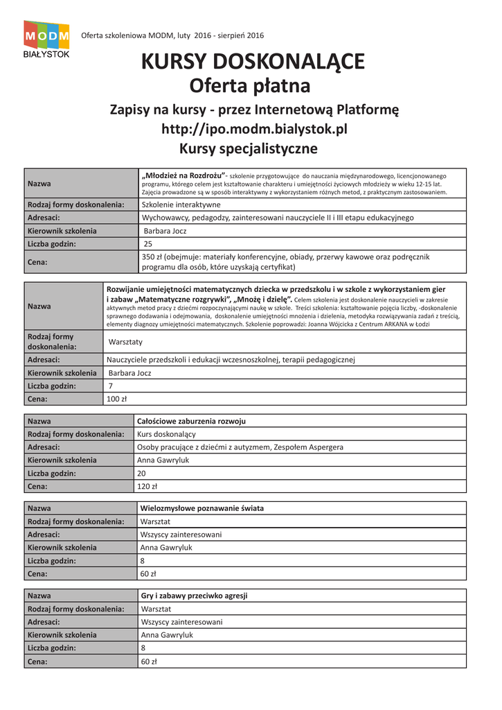 Oferta szkoleniowa MODM, luty 2016 - sierpień 2016 KURSY DOSKONALĄCE Oferta płatna Zapisy na kursy - przez Internetową Platformę http://ipo.modm.bialystok.pl Kursy specjalistyczne „Młodzież na Rozdrożu”- szkolenie przygotowujące do nauczania międzynarodowego, licencjonowanego Nazwa programu, którego celem jest kształtowanie charakteru i umiejętności życiowych młodzieży w wieku 12-15 lat. Zajęcia prowadzone są w sposób interaktywny z wykorzystaniem różnych metod, z praktycznym zastosowaniem. Rodzaj formy doskonalenia: Szkolenie interaktywne Adresaci: Wychowawcy, pedagodzy, zainteresowani nauczyciele II i III etapu edukacyjnego Kierownik szkolenia Barbara Jocz Liczba godzin: 25 Cena: 350 zł (obejmuje: materiały konferencyjne, obiady, przerwy kawowe oraz podręcznik programu dla osób, które uzyskają certyfikat) Nazwa Rozwijanie umiejętności matematycznych dziecka w przedszkolu i w szkole z wykorzystaniem gier i zabaw „Matematyczne rozgrywki”, „Mnożę i dzielę”. Celem szkolenia jest doskonalenie nauczycieli w zakresie aktywnych metod pracy z dziećmi rozpoczynającymi naukę w szkole. Treści szkolenia: kształtowanie pojęcia liczby, -doskonalenie sprawnego dodawania i odejmowania, doskonalenie umiejętności mnożenia i dzielenia, metodyka rozwiązywania zadań z treścią, elementy diagnozy umiejętności matematycznych. Szkolenie poprowadzi: Joanna Wójcicka z Centrum ARKANA w Łodzi Rodzaj formy doskonalenia: Warsztaty Adresaci: Nauczyciele przedszkoli i edukacji wczesnoszkolnej, terapii pedagogicznej Kierownik szkolenia Barbara Jocz Liczba godzin: 7 Cena: 100 zł Nazwa Całościowe zaburzenia rozwoju Rodzaj formy doskonalenia: Kurs doskonalący Adresaci: Osoby pracujące z dziećmi z autyzmem, Zespołem Aspergera Kierownik szkolenia Anna Gawryluk Liczba godzin: 20 Cena: 120 zł Nazwa Wielozmysłowe poznawanie świata Rodzaj formy doskonalenia: Warsztat Adresaci: Wszyscy zainteresowani Kierownik szkolenia Anna Gawryluk Liczba godzin: 8 Cena: 60 zł Nazwa Gry i zabawy przeciwko agresji Rodzaj formy doskonalenia: Warsztat Adresaci: Wszyscy zainteresowani Kierownik szkolenia Anna Gawryluk Liczba godzin: 8 Cena: 60 zł Oferta szkoleniowa MODM, luty 2016 - sierpień 2016 Przyjaciele Zippiego - kurs dla realizatorów programu. Międzynarodowy program promocji zdrowia Nazwa psychicznego dla dzieci w wieku 5-8 lat, który kształtuje i rozwija umiejętności psychospołeczne u małych dzieci. Uczy różnych sposobów radzenia sobie z trudnościami i wykorzystywania nabytych umiejętności w codziennym życiu oraz doskonali relacje dzieci z innymi ludźmi. Właścicielem programu jest angielska fundacja „Partnership For Children”. Rodzaj formy doskonalenia: kurs Adresaci: nauczyciele przedszkoli i klas I-III program Przyjaciele Zippiego przeznaczony jest dla dzieci w wieku 5-8 lat) Kierownik szkolenia Elżbieta Babicz Liczba godzin: 12 (3x4) Cena: 500 zł (w tym licencja i materiały dla 30 uczestników zajęć) Nazwa Tutoring szkolny Rodzaj formy doskonalenia: Kurs tutora I ° Adresaci: Nauczyciele szkół podstawowych, gimnazjów i szkół ponadgimnazjalnych Kierownik szkolenia Elżbieta Babicz Liczba godzin: 64 ( 8x8) Cena: 900 zł; Nazwa Kurs stosowanej analizy zachowania „Terapia behawioralna w teorii i praktyce” I spotkanie – 18-20.03.2016, godz. 15:30 w MODM. II spotkanie – 8-10.04.2016 Miejsce: MODM, ul. Poleska 27 (zostało kilka wolnych miejsc) Rodzaj formy doskonalenia: Kurs doskonalący Adresaci: Nauczyciele pracujący z dziećmi ze spektrum autyzmu Kierownik szkolenia Elżbieta Babicz Liczba godzin: 46 Cena: 750zł Nazwa Emisja i higiena głosu Rodzaj formy doskonalenia: Kurs doskonalący Adresaci: Nauczyciele szkół podstawowych, gimnazjów i szkół ponadgimnazjalnych Kierownik szkolenia Elżbieta Babicz Liczba godzin: 16 Cena: 130 „TRENING SKUTECZNEGO NAUCZYCIELA” wg T. Gordona. Nazwa Trening Skutecznego Nauczyciela wg Thomasa Gordona jest skierowany do całej kadry pedagogicznej różnych placówek. Podczas treningu nauczyciele rozwijają praktyczne umiejętności wprowadzania i utrzymywania samodyscypliny, zdobywają kompetencje komunikacji interpersonalnej oraz rozwiązywania problemów. Poznają metody motywowania dzieci / uczniów do zmiany nieakceptowanego przez nich zachowania. Nabyte kompetencje znacząco podnoszą efektywność pracy nauczycieli. Indywidualne materiały szkoleniowe dla uczestnika to: Zeszyt ćwiczeń TSN, książka, kredo dr. Thomasa Gordona, dyplom. Trening prowadzą trenerzy: POLSKIEGO CENTRUM EDUKACJI GORDONA Autoryzowanego Reprezentanta Gordon Training International w Polsce. Termin szkolenia: 09-10.04 i 23-24.04. 2016r godz. 10.00-18.00. Max. 25 osób Chętni do udziału w szkoleniu zapisują się telefonicznie pod nr 85-664-23-51 oraz dokonują wpłaty w terminie do 31 marca 2016 na konto MODM: nr 79 1240 2890 1111 0010 3571 3231 z dopiskiem TSN Rodzaj formy doskonalenia: warsztaty Adresaci: Pedagodzy i nauczyciele szkół i przedszkoli Kierownik szkolenia Ryszard Chodyniecki Liczba godzin: 43 Cena: 540 zł Oferta szkoleniowa MODM, luty 2016 - sierpień 2016 „SPOTKANIA Z LEONEM” – profilaktyka agrsesji dla dzieci. Nazwa Cykl zajęć psychoedukacyjnych( wg autorskiego programu SI) „Spotkania z Leonem” przeznaczony jest dla dzieci w wieku 5- 9 lat. Program zawiera 10 ilustrowanych scenariuszy zajęć, stanowiących cykl. Każdy z nich przewidziany jest do poprowadzenia podczas jednego spotkania z dziećmi, mniej więcej co 1-2 tygodnie. Tematyka zajęć: osoba dorosła i jej rola w sytuacji agresji - sposoby interweniowania w sytuacji agresji, charakterystyka ról dzieci w sytuacji agresji, sposoby postępowania z uczestnikami agresywnych konfliktów. Praktyczne poznanie i ćwiczenie scenariuszy zajęć, praktyczne umiejętności rozwiązywania sytuacji trudnych w pracy z grupą. Uczestnicy otrzymają komplet materiałów niezbędnych do realizacji programu. Zajęcia poprowadzi Pan