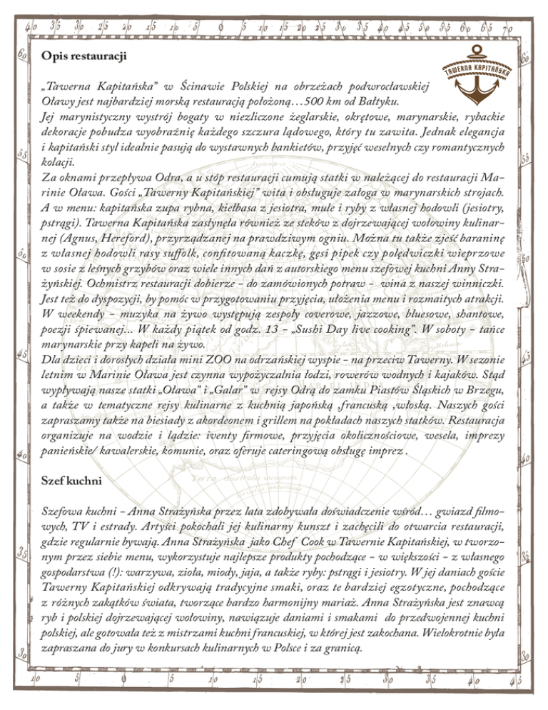 Opis restauracji „Tawerna Kapitańska” w Ścinawie Polskiej na obrzeżach podwrocławskiej Oławy jest najbardziej morską restauracją położoną…500 km od Bałtyku. Jej marynistyczny wystrój bogaty w niezliczone żeglarskie, okrętowe, marynarskie, rybackie dekoracje pobudza wyobraźnię każdego szczura lądowego, który tu zawita. Jednak elegancja i kapitański styl idealnie pasują do wystawnych bankietów, przyjęć weselnych czy romantycznych kolacji. Za oknami przepływa Odra, a u stóp restauracji cumują statki w należącej do restauracji Marinie Oława. Gości „Tawerny Kapitańskiej” wita i obsługuje załoga w marynarskich strojach. A w menu: kapitańska zupa rybna, kiełbasa z jesiotra, mule i ryby z własnej hodowli (jesiotry, pstrągi). Tawerna Kapitańska zasłynęła również ze steków z dojrzewającej wołowiny kulinarnej (Agnus, Hereford), przyrządzanej na prawdziwym ogniu. Można tu także zjeść baraninę z własnej hodowli rasy suffolk, confitowaną kaczkę, gęsi pipek czy polędwiczki wieprzowe w sosie z leśnych grzybów oraz wiele innych dań z autorskiego menu szefowej kuchni Anny Strażyńskiej. Ochmistrz restauracji dobierze - do zamówionych potraw - wina z naszej winniczki. Jest też do dyspozycji, by pomóc w przygotowaniu przyjęcia, ułożenia menu i rozmaitych atrakcji. W weekendy - muzyka na żywo występują zespoły coverowe, jazzowe, bluesowe, shantowe, poezji śpiewanej... W każdy piątek od godz. 13 - „Sushi Day live cooking”. W soboty - tańce marynarskie przy kapeli na żywo. Dla dzieci i dorosłych działa mini ZOO na odrzańskiej wyspie - na przeciw Tawerny. W sezonie letnim w Marinie Oława jest czynna wypożyczalnia łodzi, rowerów wodnych i kajaków. Stąd wypływają nasze statki „Oława” i „Galar” w rejsy Odrą do zamku Piastów Śląskich w Brzegu, a także w tematyczne rejsy kulinarne z kuchnią japońską ,francuską ,włoską. Naszych gości zapraszamy także na biesiady z akordeonem i grillem na pokładach naszych statków. Restauracja organizuje na wodzie i lądzie: iventy firmowe, przyjęcia okolicznościowe, wesela, imprezy panieńskie/ kawalerskie, komunie, oraz oferuje cateringową obsługę imprez . Szef kuchni Szefowa kuchni - Anna Strażyńska przez lata zdobywała doświadczenie wśród… gwiazd filmowych, TV i estrady. Artyści pokochali jej kulinarny kunszt i zachęcili do otwarcia restauracji, gdzie regularnie bywają. Anna Strażyńska jako Chef Cook w Tawernie Kapitańskiej, w tworzonym przez siebie menu, wykorzystuje najlepsze produkty pochodzące - w większości - z własnego gospodarstwa (!): warzywa, zioła, miody, jaja, a także ryby: pstrągi i jesiotry. W jej daniach goście Tawerny Kapitańskiej odkrywają tradycyjne smaki, oraz te bardziej egzotyczne, pochodzące z różnych zakątków świata, tworzące bardzo harmonijny mariaż. Anna Strażyńska jest znawcą ryb i polskiej dojrzewającej wołowiny, nawiązuje daniami i smakami do przedwojennej kuchni polskiej, ale gotowała też z mistrzami kuchni francuskiej, w której jest zakochana. Wielokrotnie była zapraszana do jury w konkursach kulinarnych w Polsce i za granicą.
