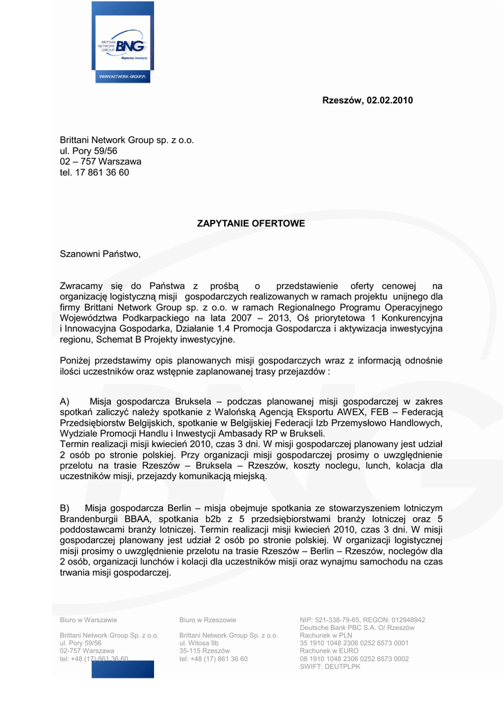 Rzeszów, 02.02.2010 Brittani Network Group sp. z o.o. ul. Pory 59/56 02 – 757 Warszawa tel. 17 861 36 60 ZAPYTANIE OFERTOWE Szanowni Państwo, Zwracamy się do Państwa z prośbą o przedstawienie oferty cenowej na organizację logistyczną misji gospodarczych realizowanych w ramach projektu unijnego dla firmy Brittani Network Group sp. z o.o. w ramach Regionalnego Programu Operacyjnego Województwa Podkarpackiego na lata 2007 – 2013, Oś priorytetowa 1 Konkurencyjna i Innowacyjna Gospodarka, Działanie 1.4 Promocja Gospodarcza i aktywizacja inwestycyjna regionu, Schemat B Projekty inwestycyjne. Poniżej przedstawimy opis planowanych misji gospodarczych wraz z informacją odnośnie ilości uczestników oraz wstępnie zaplanowanej trasy przejazdów : A) Misja gospodarcza Bruksela – podczas planowanej misji gospodarczej w zakres spotkań zaliczyć należy spotkanie z Walońską Agencją Eksportu AWEX, FEB – Federacją Przedsiębiorstw Belgijskich, spotkanie w Belgijskiej Federacji Izb Przemysłowo Handlowych, Wydziale Promocji Handlu i Inwestycji Ambasady RP w Brukseli. Termin realizacji misji kwiecień 2010, czas 3 dni. W misji gospodarczej planowany jest udział 2 osób po stronie polskiej. Przy organizacji misji gospodarczej prosimy o uwzględnienie przelotu na trasie Rzeszów – Bruksela – Rzeszów, koszty noclegu, lunch, kolacja dla uczestników misji, przejazdy komunikacją miejską. B) Misja gospodarcza Berlin – misja obejmuje spotkania ze stowarzyszeniem lotniczym Brandenburgii BBAA, spotkania b2b z 5 przedsiębiorstwami branży lotniczej oraz 5 poddostawcami branży lotniczej. Termin realizacji misji kwiecień 2010, czas 3 dni. W misji gospodarczej planowany jest udział 2 osób po stronie polskiej. W organizacji logistycznej misji prosimy o uwzględnienie przelotu na trasie Rzeszów – Berlin – Rzeszów, noclegów dla 2 osób, organizacji lunchów i kolacji dla uczestników misji oraz wynajmu samochodu na czas trwania misji gospodarczej. Biuro w Warszawie Biuro w Rzeszowie Brittani Network Group Sp. z o.o. ul. Pory 59/56 02-757 Warszawa tel: +48 (17) 861 36 60 Brittani Network Group Sp. z o.o. ul. Witosa 9b 35-115 Rzeszów tel: +48 (17) 861 36 60 NIP: 521-338-79-65, REGON: 012948942 Deutsche Bank PBC S.A. O/ Rzeszów Rachunek w PLN 35 1910 1048 2306 0252 6573 0001 Rachunek w EURO 08 1910 1048 2306 0252 6573 0002 SWIFT: DEUTPLPK C) Misja gospodarcza Dresdno, Chemnitz – misja gospodarcza obejmuje spotkania ze stowarzyszeniem AMZ Saxony Automotive Supplier Network, Izbą przemysłowo handlową IHK w Chemnitz oraz Dresdnie, aranżacja 3 spotkań z branżą przemysłu samochodowego. Planowany termin realizacji misji kwiecień 2010, czas trwania 2 dni. W misji gospodarczej planowany jest udział 2 osób po stronie polskiej. Przy organizacji logistycznej misji prosimy o uwzględnienie przelotu na trasie Rzeszów – Dresdno – Rzeszów lub inna kombinacja połączeń, wynajem samochodu na czas trwania misji, koszty noclegu dla 2 osób, organizacja lunchów oraz kolacji dla uczestników misji. D) Misja gospodarcza Monachium – misja gospodarcza obejmuje spotkania z firmą BMW i MAN , umówienie 4 spotkań z firmami branży lotniczej, udział firmy w Europa Forum Bayern 2010, aranżacja spotkań z wybranymi uczestnikami forum. Planowany termin realizacji maj 2010, czas trwania 4 dni. W misji gospodarczej planowany jest udział 2 osób po stronie polskiej. Przy organizacji logistycznej misji gospodarczej uwzględnić należy koszt przelotu na trasie Rzeszów – Monachium – Rzeszów, koszt noclegu, wynajem samochodu, organizacja lunchów i kolacji dla uczestników misji. E) Misja gospodarcza Lwów – podczas misji gospodarczej planowane jest spotkanie z Konsulatem RP we Lwowie, spotkanie z kancelarią prawniczą współpracującą na płaszczyźnie współpracy polsko – ukraińskiej, organizacja spotkań b2b z przedsiębiorstwami branży spożywczej oraz produkcyjnej. Planowany termin realizacji czerwiec 2010, czas trwania 3 dni. W misji gospodarczej planowany jest udział 2 osób po stronie polskiej. Wynajem samochodu dla uczestników misji gospodarczej, noclegi dla uczestników misji, organizacja kolacji i lunchów dla uczestników misji gospodarczej. F) Misja gospodarcza w Farnborough – Misja gospodarcza obejmuje udział w targach lotniczych powiązany ze spotkaniami b2b. Planowany termin realizacji lipiec 2010, czas trwania 4 dni. W misji gospodarczej planowany jest udział 2 osób po stronie polskiej. Przy organizacji misji gospodarczej proszę uwzględnić koszty przelotu na trasie Rzeszów – Farnborough – Rzeszów, wynajem samochodu, koszty zakwaterowania, organizacja lunchów i kolacji podczas trwania misji. G) Polsko – szwedzko – ukraińska misja gospodarcza w Sztokholmie wyjazdu około 20 przedsiębiorstw branży produkcyjnej oraz budowlanej do Sztokholmu, organizacja spotkań b2b z firmami szwedzkimi. Planowany termin realizacji wrzesień 2010, czas trwania 3 dni. Organizacja wyjazdu pracowników organizatora misji gospodarczej – 5 osób, zakwaterowanie, katering na czas trwania misji dla 50 osób, wynajem autobusu dla uczestników misji, fotograf, tłumaczenia symultaniczne. Biuro w Warszawie Biuro w Rzeszowie Brittani Network Group Sp. z o.o. ul. Pory 59/56 02-757 Warszawa tel: +48 (17) 861 36 60 Brittani Network Group Sp. z o.o. ul. Witosa 9b 35-115 Rzeszów tel: +48 (17) 861 36 60 NIP: 521-338-79-65, REGON: 012948942 Deutsche Bank PBC S.A. O/ Rzeszów Rachunek w PLN 35 1910 1048 2306 0252 6573 0001 Rachunek w EURO 08 1910 1048 2306 0252 6573 0002 SWIFT: DEUTPLPK H ) Misja gospodarcza Hannover, Berlin, Norynbergia, Ulm, Stuttgard, Mannheim – obejmuje spotkania z IHK w wyszczególnionych miastach, organizacja po 2-3 spotkań b2b z firmami branży lotniczej, samochodowej, spożywczej. Czas trwania misji 5 dni, planowany termin realizacji październik 2010. W misji gospodarczej planowany jest udział 2 osób po stronie polskiej. Proszę za