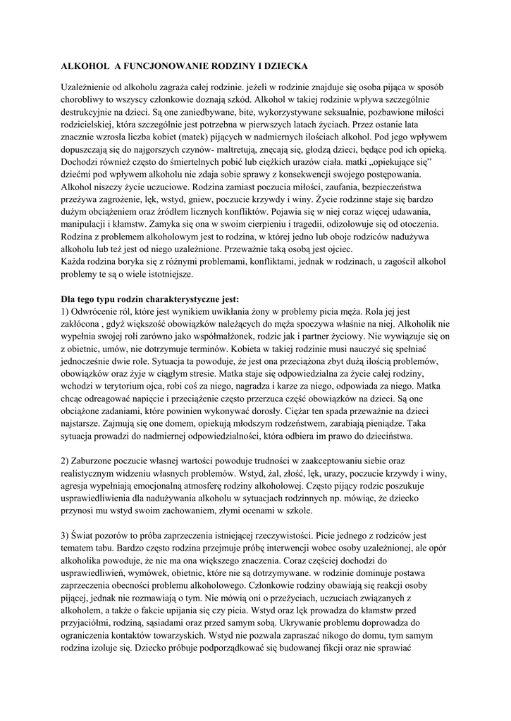 ALKOHOL A FUNCJONOWANIE RODZINY I DZIECKA Uzależnienie od alkoholu zagraża całej rodzinie. jeżeli w rodzinie znajduje się osoba pijąca w sposób chorobliwy to wszyscy członkowie doznają szkód. Alkohol w takiej rodzinie wpływa szczególnie destrukcyjnie na dzieci. Są one zaniedbywane, bite, wykorzystywane seksualnie, pozbawione miłości rodzicielskiej, która szczególnie jest potrzebna w pierwszych latach życiach. Przez ostanie lata znacznie wzrosła liczba kobiet (matek) pijących w nadmiernych ilościach alkohol. Pod jego wpływem dopuszczają się do najgorszych czynów- maltretują, znęcają się, głodzą dzieci, będące pod ich opieką. Dochodzi również często do śmiertelnych pobić lub ciężkich urazów ciała. matki „opiekujące się” dziećmi pod wpływem alkoholu nie zdaja sobie sprawy z konsekwencji swojego postępowania. Alkohol niszczy życie uczuciowe. Rodzina zamiast poczucia miłości, zaufania, bezpieczeństwa przeżywa zagrożenie, lęk, wstyd, gniew, poczucie krzywdy i winy. Życie rodzinne staje się bardzo dużym obciążeniem oraz źródłem licznych konfliktów. Pojawia się w niej coraz więcej udawania, manipulacji i kłamstw. Zamyka się ona w swoim cierpieniu i tragedii, odizolowuje się od otoczenia. Rodzina z problemem alkoholowym jest to rodzina, w której jedno lub oboje rodziców nadużywa alkoholu lub też jest od niego uzależnione. Przeważnie taką osobą jest ojciec. Każda rodzina boryka się z różnymi problemami, konfliktami, jednak w rodzinach, u zagościł alkohol problemy te są o wiele istotniejsze. Dla tego typu rodzin charakterystyczne jest: 1) Odwrócenie ról, które jest wynikiem uwikłania żony w problemy picia męża. Rola jej jest zakłócona , gdyż większość obowiązków należących do męża spoczywa właśnie na niej. Alkoholik nie wypełnia swojej roli zarówno jako współmałżonek, rodzic jak i partner życiowy. Nie wywiązuje się on z obietnic, umów, nie dotrzymuje terminów. Kobieta w takiej rodzinie musi nauczyć się spełniać jednocześnie dwie role. Sytuacja ta powoduje, że jest ona przeciążona zbyt dużą ilością problemów, obowiązków oraz żyje w ciągłym stresie. Matka staje się odpowiedzialna za życie całej rodziny, wchodzi w terytorium ojca, robi coś za niego, nagradza i karze za niego, odpowiada za niego. Matka chcąc odreagować napięcie i przeciążenie często przerzuca część obowiązków na dzieci. Są one obciążone zadaniami, które powinien wykonywać dorosły. Ciężar ten spada przeważnie na dzieci najstarsze. Zajmują się one domem, opiekują młodszym rodzeństwem, zarabiają pieniądze. Taka sytuacja prowadzi do nadmiernej odpowiedzialności, która odbiera im prawo do dzieciństwa. 2) Zaburzone poczucie własnej wartości powoduje trudności w zaakceptowaniu siebie oraz realistycznym widzeniu własnych problemów. Wstyd, żal, złość, lęk, urazy, poczucie krzywdy i winy, agresja wypełniają emocjonalną atmosferę rodziny alkoholowej. Często pijący rodzic poszukuje usprawiedliwienia dla nadużywania alkoholu w sytuacjach rodzinnych np. mówiąc, że dziecko przynosi mu wstyd swoim zachowaniem, złymi ocenami w szkole. 3) Świat pozorów to próba zaprzeczenia istniejącej rzeczywistości. Picie jednego z rodziców jest tematem tabu. Bardzo często rodzina przejmuje próbę interwencji wobec osoby uzależnionej, ale opór alkoholika powoduje, że nie ma ona większego znaczenia. Coraz częściej dochodzi do usprawiedliwień, wymówek, obietnic, które nie są dotrzymywane. w rodzinie dominuje postawa zaprzeczenia obecności problemu alkoholowego. Członkowie rodziny obawiają się reakcji osoby pijącej, jednak nie rozmawiają o tym. Nie mówią oni o przeżyciach, uczuciach związanych z alkoholem, a także o fakcie upijania się czy picia. Wstyd oraz lęk prowadza do kłamstw przed przyjaciółmi, rodziną, sąsiadami oraz przed samym sobą. Ukrywanie problemu doprowadza do ograniczenia kontaktów towarzyskich. Wstyd nie pozwala zapraszać nikogo do domu, tym samym rodzina izoluje się. Dziecko próbuje podporządkować się budowanej fikcji oraz nie sprawiać problemów. Może to doprowadzić do rozwinięcia się u dzieci różnych symptomów zaburzeń łaknienia, snu, emocjonalnych, zachowania, trudności w uczeniu się. Rodzina zależy od zachowań alkoholika, ponieważ jej życie obraca się wokół niego. Charakterystyczna dla tej zależności jest uporczywa koncentracja na alkoholiku oraz jego piciu, zgoda na koszty, które ponosi cała rodzina, zaburzenia życia uczuciowego, zaprzeczenie faktom i emocjom, wspomaganie choroby alkoholika przez zwolnienie go z odpowiedzialności za skutki jego picia. Współuzależnienie jest formą przystosowania się do niewłaściwego układu relacji między ludźmi, która umożliwia zachowanie układu dotychczasowego, jednocześnie odbierając szansę na jego zmianę. Zjawisko współuzależnienia jest spotykane w większości rodzin, w których istnieje problem uzależnienia od alkoholu. Do podstawowych zachowań osoby współuzależnione należą: obsesyjne kontrolowanie alkoholika, prz4ejmowanie odpowiedzialności za niego, poddanie się jego rytmowi picia, wysoka tolerancja na patologiczne zachowania, pomaganie oraz nadmierne opiekowanie się nim. Wyróżnia się trzy zasady, których uczą się dzieci w rodzinie z problemami alkoholowymi: 1. Nie oczekuj Doświadczeniami dziecka w rodzinie alkoholowej jest poczucie zagubienia oraz chaosu. Nie może ono liczyć na to, że ktoś je wysłucha, obietnice mu dane są spełniane wybiórczo. Jeżeli obietnice nie są spełniane, umowy niedotrzymywane, działania dorosłych są niespójne to zaczyna się tworzyć postawa, która oparta jest na przekonaniu, że niczego nie można oczekiwać, gdyż i tak się tego nie dostanie. dzieci z rodzin alkoholowych często funkcjonują w świecie fantazji i świecie rzeczywistym. Rzeczywistość, która jest nieprzewi