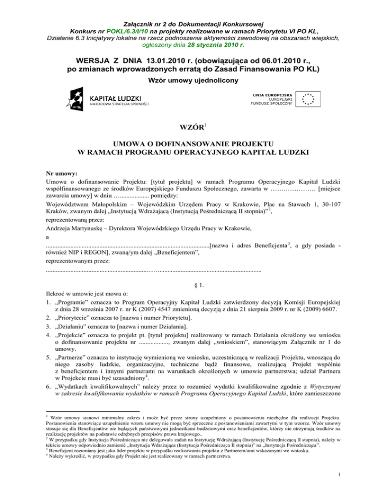 Załącznik nr 2 do Dokumentacji Konkursowej Konkurs nr POKL/6.3/I/10 na projekty realizowane w ramach Priorytetu VI PO KL, Działanie 6.3 Inicjatywy lokalne na rzecz podnoszenia aktywności zawodowej na obszarach wiejskich, ogłoszony dnia 28 stycznia 2010 r. WERSJA Z DNIA 13.01.2010 r. (obowiązująca od 06.01.2010 r., po zmianach wprowadzonych erratą do Zasad Finansowania PO KL) Wzór umowy ujednolicony WZÓR1 UMOWA O DOFINANSOWANIE PROJEKTU W RAMACH PROGRAMU OPERACYJNEGO KAPITAŁ LUDZKI Nr umowy: Umowa o dofinansowanie Projektu: [tytuł projektu] w ramach Programu Operacyjnego Kapitał Ludzki współfinansowanego ze środków Europejskiego Funduszu Społecznego, zawarta w ………………… [miejsce zawarcia umowy] w dniu ….................. pomiędzy: Województwem Małopolskim – Wojewódzkim Urzędem Pracy w Krakowie, Plac na Stawach 1, 30-107 Kraków, zwanym dalej „Instytucją Wdrażającą (Instytucją Pośredniczącą II stopnia)” 2, reprezentowaną przez: Andrzeja Martynuskę – Dyrektora Wojewódzkiego Urzędu Pracy w Krakowie, a .....................................................................................................[nazwa i adres Beneficjenta 3, a gdy posiada również NIP i REGON], zwaną/ym dalej „Beneficjentem”, reprezentowanym przez: ..............................................................……............................................................... § 1. Ilekroć w umowie jest mowa o: 1. „Programie” oznacza to Program Operacyjny Kapitał Ludzki zatwierdzony decyzją Komisji Europejskiej z dnia 28 września 2007 r. nr K (2007) 4547 zmienioną decyzją z dnia 21 sierpnia 2009 r. nr K (2009) 6607. 2. „Priorytecie” oznacza to [nazwa i numer Priorytetu]. 3. „Działaniu” oznacza to [nazwa i numer Działania]. 4. „Projekcie” oznacza to projekt pt. [tytuł projektu] realizowany w ramach Działania określony we wniosku o dofinansowanie projektu nr .................., zwanym dalej „wnioskiem”, stanowiącym Załącznik nr 1 do umowy. 5. „Partnerze” oznacza to instytucję wymienioną we wniosku, uczestniczącą w realizacji Projektu, wnoszącą do niego zasoby ludzkie, organizacyjne, techniczne bądź finansowe, realizującą Projekt wspólnie z beneficjentem i innymi partnerami na warunkach określonych w umowie partnerstwa; udział Partnera w Projekcie musi być uzasadniony4. 6. „Wydatkach kwalifikowalnych” należy przez to rozumieć wydatki kwalifikowalne zgodnie z Wytycznymi w zakresie kwalifikowania wydatków w ramach Programu Operacyjnego Kapitał Ludzki, które zamieszczone Wzór umowy stanowi minimalny zakres i może być przez strony uzupełniony o postanowienia niezbędne dla realizacji Projektu. Postanowienia stanowiące uzupełnienie wzoru umowy nie mogą być sprzeczne z postanowieniami zawartymi w tym wzorze. Wzór umowy stosuje się dla Beneficjentów nie będących państwowymi jednostkami budżetowymi oraz beneficjentów, którzy nie otrzymują środków na realizację projektów na podstawie odrębnych przepisów prawa krajowego.. 2 W przypadku gdy Instytucja Pośrednicząca nie delegowała zadań na Instytucję Wdrażającą (Instytucję Pośredniczącą II stopnia), należy w tekście umowy odpowiednio zamienić „Instytucja Wdrażająca (Instytucja Pośrednicząca II stopnia)” na „Instytucja Pośrednicząca”. 3 Beneficjent rozumiany jest jako lider projektu w przypadku realizowania projektu z Partnerem/ami wskazanymi we wniosku. 4 Należy wykreślić, w przypadku gdy Projekt nie jest realizowany w ramach partnerstwa. 1 1 Załącznik nr 2 do Dokumentacji Konkursowej Konkurs nr POKL/6.3/I/10 na projekty realizowane w ramach Priorytetu VI PO KL, Działanie 6.3 Inicjatywy lokalne na rzecz podnoszenia aktywności zawodowej na obszarach wiejskich, ogłoszony dnia 28 stycznia 2010 r. są na stronie internetowej Instytucji Wdrażającej (Instytucji Pośredniczącej II stopnia): www.pokl.wupkrakow.pl. 7. „Instytucji Pośredniczącej” oznacza to Samorząd Województwa Małopolskiego 5. 8. „Instytucji Zarządzającej” oznacza to Departament Zarządzania Europejskim Funduszem Społecznym w Ministerstwie Rozwoju Regionalnego. 9. „Danych osobowych” oznacza to dane osobowe w rozumieniu ustawy z dnia 29 sierpnia 1997 r. o ochronie danych osobowych (Dz.U. z 2002 r. Nr 101, poz. 926, z późn. zm.), dotyczące uczestników projektu, które muszą być przetwarzane przez Instytucję Wdrażającą (Instytucję Pośredniczącą II Stopnia) oraz beneficjenta w celu wykonania Porozumienia w sprawie dofinansowania Działania6 nr ................................. zawartego w dniu ............................, w zakresie określonym w Załączniku nr 2 do umowy. 10. „Przetwarzaniu danych osobowych” oznacza to jakiekolwiek operacje wykonywane na danych osobowych, takie jak zbieranie, utrwalanie, przechowywanie, opracowywanie, zmienianie, udostępnianie i usuwanie, a zwłaszcza te, która wykonuje się w systemie informatycznym Podsystem Monitorowania Europejskiego Funduszu Społecznego 2007. 11. „Pracowniku” oznacza to osobę świadczącą pracę na podstawie stosunku pracy lub stosunku cywilnoprawnego. Przedmiot umowy § 2. Na warunkach określonych w niniejszej umowie, Instytucja Wdrażająca (Instytucja Pośrednicząca II stopnia) przyznaje Beneficjentowi dofinansowanie na realizację Projektu w łącznej kwocie nieprzekraczającej ................... PLN (słownie: …) i stanowiącej nie więcej niż …… % całkowitych wydatków kwalifikowalnych Projektu, w tym: 1) płatność ze środków europejskich w kwocie .... PLN (słownie: ...); 2) dotację celową z budżetu krajowego w kwocie ... PLN (słownie: ...). W kwocie dofinansowania, o której mowa w zdaniu pierwszym nie więcej niż ................... PLN (słownie: …) stanowią środki na wydatki inwestycyjne i na zakupy inwestycyjne zgodnie z wnioskiem. 1. 2. 3. 4. 5. § 3. Beneficjent zobowiązuje się do realizacji Projektu