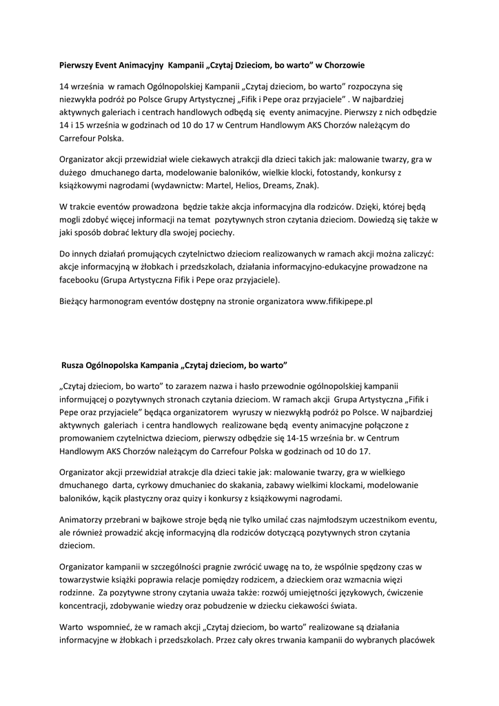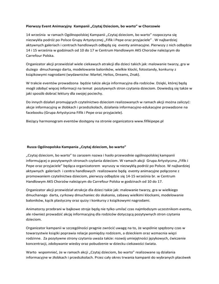 Pierwszy Event Animacyjny Kampanii „Czytaj Dzieciom, bo warto” w Chorzowie 14 września w ramach Ogólnopolskiej Kampanii „Czytaj dzieciom, bo warto” rozpoczyna się niezwykła podróż po Polsce Grupy Artystycznej „Fifik i Pepe oraz przyjaciele” . W najbardziej aktywnych galeriach i centrach handlowych odbędą się eventy animacyjne. Pierwszy z nich odbędzie 14 i 15 września w godzinach od 10 do 17 w Centrum Handlowym AKS Chorzów należącym do Carrefour Polska. Organizator akcji przewidział wiele ciekawych atrakcji dla dzieci takich jak: malowanie twarzy, gra w dużego dmuchanego darta, modelowanie baloników, wielkie klocki, fotostandy, konkursy z książkowymi nagrodami (wydawnictw: Martel, Helios, Dreams, Znak). W trakcie eventów prowadzona będzie także akcja informacyjna dla rodziców. Dzięki, której będą mogli zdobyć więcej informacji na temat pozytywnych stron czytania dzieciom. Dowiedzą się także w jaki sposób dobrać lektury dla swojej pociechy. Do innych działań promujących czytelnictwo dzieciom realizowanych w ramach akcji można zaliczyć: akcje informacyjną w żłobkach i przedszkolach, działania informacyjno-edukacyjne prowadzone na facebooku (Grupa Artystyczna Fifik i Pepe oraz przyjaciele). Bieżący harmonogram eventów dostępny na stronie organizatora www.fifikipepe.pl Rusza Ogólnopolska Kampania „Czytaj dzieciom, bo warto” „Czytaj dzieciom, bo warto” to zarazem nazwa i hasło przewodnie ogólnopolskiej kampanii informującej o pozytywnych stronach czytania dzieciom. W ramach akcji Grupa Artystyczna „Fifik i Pepe oraz przyjaciele” będąca organizatorem wyruszy w niezwykłą podróż po Polsce. W najbardziej aktywnych galeriach i centra handlowych realizowane będą eventy animacyjne połączone z promowaniem czytelnictwa dzieciom, pierwszy odbędzie się 14-15 września br. w Centrum Handlowym AKS Chorzów należącym do Carrefour Polska w godzinach od 10 do 17. Organizator akcji przewidział atrakcje dla dzieci takie jak: malowanie twarzy, gra w wielkiego dmuchanego darta, cyrkowy dmuchaniec do skakania, zabawy wielkimi klockami, modelowanie baloników, kącik plastyczny oraz quizy i konkursy z książkowymi nagrodami. Animatorzy przebrani w bajkowe stroje będą nie tylko umilać czas najmłodszym uczestnikom eventu, ale również prowadzić akcję informacyjną dla rodziców dotyczącą pozytywnych stron czytania dzieciom. Organizator kampanii w szczególności pragnie zwrócić uwagę na to, że wspólnie spędzony czas w towarzystwie książki poprawia relacje pomiędzy rodzicem, a dzieckiem oraz wzmacnia więzi rodzinne. Za pozytywne strony czytania uważa także: rozwój umiejętności językowych, ćwiczenie koncentracji, zdobywanie wiedzy oraz pobudzenie w dziecku ciekawości świata. Warto wspomnieć, że w ramach akcji „Czytaj dzieciom, bo warto” realizowane są działania informacyjne w żłobkach i przedszkolach. Przez cały okres trwania kampanii do wybranych placówek będą rozsyłane scenariusze zajęć do wykorzystania przez nauczycieli oraz materiały o charakterze edukacyjnym. Akcja trwa do końca stycznia 2014 roku. Zapraszamy do śledzenia bieżącego harmonogramu eventów na stronie internetowej organizatora www.fifikipepe.pl oraz na facebooku, a także do aktywnego udziału w konkursach z książkowymi nagrodami partnerów akcji ( wydawnictw: Martel, Dreams, Helios, Znak).