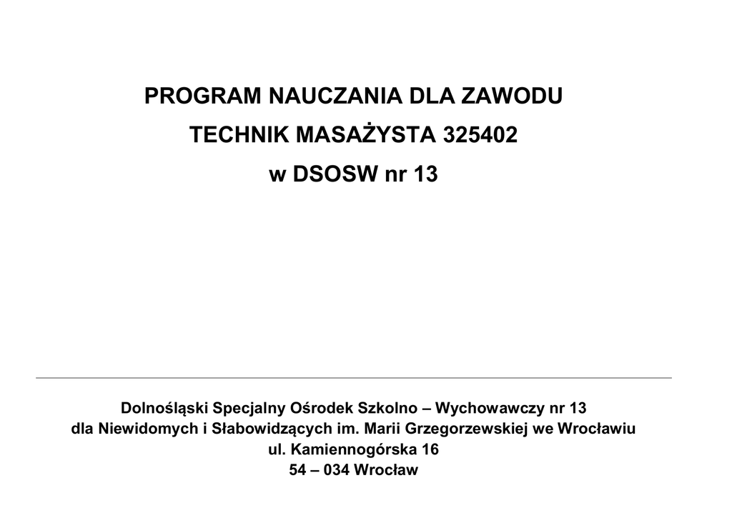 PROGRAM NAUCZANIA DLA ZAWODU TECHNIK MASAŻYSTA 325402 w DSOSW nr 13 Dolnośląski Specjalny Ośrodek Szkolno – Wychowawczy nr 13 dla Niewidomych i Słabowidzących im. Marii Grzegorzewskiej we Wrocławiu ul. Kamiennogórska 16 54 – 034 Wrocław PROGRAM NAUCZANIA DLA ZAWODU TECHNIK MASAŻYSTA 325402 w DSOSW nr 13 TYP SZKOŁY: SZKOŁA POLICEALNA 1. TYP PROGRAMU: PRZEDMIOTOWY 2. RODZAJ PROGRAMU: LINIOWY 3. AUTORZY, RECENZENCI I KONSULTANCI PROGRAMU NAUCZANIA: Autorzy: dr Krzysztof Kassolik, mgr Rafał Kandziora, mgr Marcin Szymański Recenzenci: dr Waldemar Andrzejewski, dr Aleksandra Orlikowska Konsultanci: mgr Urszula Wojtkiewicz Modyfikacji dokonali: mgr Sebastian Pusiarski, mgr Maria Stankunowicz, mgr Dorota Błażków, 4. PODSTAWY PRAWNE KSZTAŁCENIA ZAWODOWEGO Program nauczania dla zawodu TECHNIK MASAŻYSTA opracowany jest zgodnie z poniższymi aktami prawnymi: - Ustawą z dnia 19 sierpnia 2011 r. o zmianie ustawy o systemie oświaty oraz niektórych innych ustaw - Rozporządzeniem w sprawie klasyfikacji zawodów szkolnictwa zawodowego z dnia 23 grudnia 2011 r. - Rozporządzeniem w sprawie podstawy programowej kształcenia w zawodach z dnia 7 lutego 2012 r. - Rozporządzeniem w sprawie ramowych planów nauczania z dnia 7 lutego 2012 r. - Rozporządzeniem w sprawie dopuszczania do użytku w szkole programów wychowania przedszkolnego i programów nauczania oraz dopuszczania do użytku szkolnego podręczników z dnia 8 czerwca 2009 r. - Rozporządzeniem w sprawie warunków i sposobu oceniania, klasyfikowania i promowania uczniów i słuchaczy oraz przeprowadzania sprawdzianów i egzaminów w szkołach publicznych z dnia 30 kwietnia 2007 z późn. zmianami. - Rozporządzeniem w sprawie zasad udzielania i organizacji pomocy psychologiczno-pedagogicznej w publicznych przedszkolach, szkołach i placówkach z dnia 17 listopada 2010 r. - Rozporządzeniem w sprawie bezpieczeństwa i higieny w publicznych i niepublicznych szkołach i placówkach z dnia 31 grudnia 2002 r. z późn. zmianami. 5. CELE OGÓLNE KSZTAŁCENIA ZAWODOWEGO Opracowany program nauczania pozwoli na osiągnięcie co najmniej następujących celów ogólnych kształcenia zawodowego: - przygotowanie uczących się do życia w warunkach współczesnego świata, - wykonywania pracy zawodowej, - aktywnego funkcjonowania na zmieniającym się rynku pracy. Zadania szkoły i innych podmiotów prowadzących kształcenie zawodowe oraz sposób ich realizacji są uwarunkowane zmianami zachodzącymi w otoczeniu gospodarczo-społecznym, na które wpływają szczególności: idea gospodarki opartej na wiedzy, globalizacja procesów gospodarczych i społecznych, rosnący udział handlu międzynarodowego, mobilność geograficzna i zawodowa, nowe techniki i technologie, a także wzrost oczekiwań pracodawców w zakresie poziomu wiedzy i umiejętności pracowników. W procesie kształcenia zawodowego ważne jest integrowanie i korelowanie kształcenia ogólnego i zawodowego, w tym doskonalenie kompetencji kluczowych nabytych w procesie kształcenia ogólnego, z uwzględnieniem niższych etapów edukacyjnych. Odpowiedni poziom wiedzy ogólnej powiązanej z wiedzą zawodową przyczyni się do podniesienia poziomu umiejętności zawodowych absolwentów szkół kształcących w zawodach, a tym samym zapewni im możliwość sprostania wyzwaniom zmieniającego się rynku pracy. W procesie kształcenia zawodowego są podejmowane działania wspomagające rozwój każdego uczącego się, stosownie do jego potrzeb i możliwości, ze szczególnym uwzględnieniem indywidualnych ścieżek edukacji kariery, możliwości podnoszenia poziomu wykształcenia i kwalifikacji zawodowych oraz zapobiegania przedwczesnemu kończeniu nauki. Elastycznemu reagowaniu systemu kształcenia zawodowego na potrzeby rynku pracy, jego otwartości na uczenie się przez całe życie oraz mobilności edukacyjnej i zawodowej absolwentów ma służyć wyodrębnienie kwalifikacji w ramach poszczególnych zawodów wpisanych do klasyfikacji zawodów szkolnictwa zawodowego. 6. KORELACJA PROGRAMU NAUCZANIA DLA ZAWODU TECHNIK MASAŻYSTA Z PODSTAWĄ PROGRAMOWĄ KSZTAŁCENIA OGÓLNEGO Program nauczania dla zawodu technik masażysta uwzględnia aktualny stan wiedzy o zawodzie ze szczególnym zwróceniem uwagi na nowe technologie i najnowsze koncepcje nauczania. Program uwzględnia także zapisy zadań ogólnych szkoły i umiejętności zdobywanych w trakcie kształcenia w szkole ponadgimnazjalnej umieszczonych w podstawach programowych kształcenia ogólnego, w tym: 1) umiejętność zrozumienia, wykorzystania i refleksyjnego przetworzenia tekstów, prowadząca do osiągnięcia własnych celów, rozwoju osobowego oraz aktywnego uczestnictwa w życiu społeczeństwa; 2) umiejętność wykorzystania narzędzi matematyki w życiu codziennym oraz formułowania sądów opartych na rozumowaniu matematycznym; 3) umiejętność wykorzystania wiedzy o charakterze naukowym do identyfikowania i rozwiązywania problemów, a także formułowania wniosków opartych na obserwacjach empirycznych dotyczących przyrody lub społeczeństwa; 4) umiejętność komunikowania się w języku ojczystym i w językach obcych; 5) umiejętność sprawnego posługiwania się nowoczesnymi technologiami informacyjnymi i komunikacyjnymi; 6) umiejętność wyszukiwania, selekcjonowania i krytycznej analizy informacji; 7) umiejętność rozpoznawania własnych potrzeb edukacyjnych oraz uczenia się; 8) umiejętność pracy zespołowej. W programie nauczania dla zawodu technik masażysta uwzględniono powiązania z kształceniem ogólnym polegające na wcześniejszym osiąganiu efektów kształcenia w zakresie przedmiotów ogólnokształcących stanowiących podbudowę dla kształcenia w zawodzie. Dotyczy to przede wszystkim takich przedmiotów jak: biologia, a także podstawy przedsiębiorczości i edukację dla bezpieczeństwa. 7. INFORMACJA O ZAWODZIE TECHNIK MASAŻYSTA Masażysta stosuje wszystkie metody i techniki m