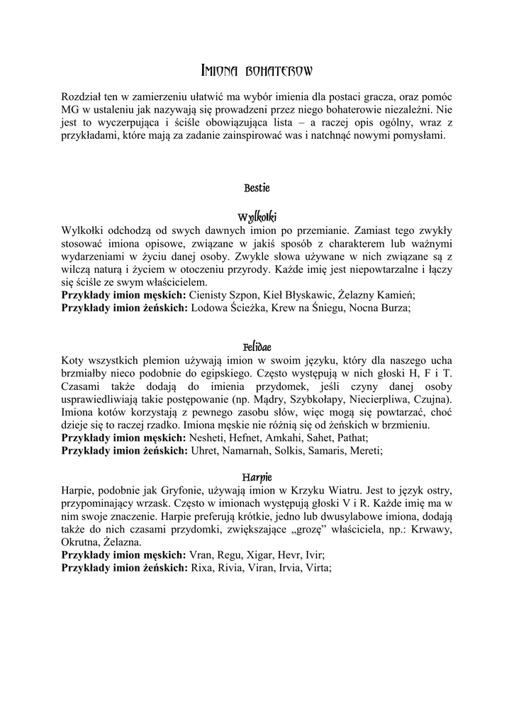 Imiona bohaterow Rozdział ten w zamierzeniu ułatwić ma wybór imienia dla postaci gracza, oraz pomóc MG w ustaleniu jak nazywają się prowadzeni przez niego bohaterowie niezależni. Nie jest to wyczerpująca i ściśle obowiązująca lista – a raczej opis ogólny, wraz z przykładami, które mają za zadanie zainspirować was i natchnąć nowymi pomysłami. ł Wylkołki odchodzą od swych dawnych imion po przemianie. Zamiast tego zwykły stosować imiona opisowe, związane w jakiś sposób z charakterem lub ważnymi wydarzeniami w życiu danej osoby. Zwykle słowa używane w nich związane są z wilczą naturą i życiem w otoczeniu przyrody. Każde imię jest niepowtarzalne i łączy się ściśle ze swym właścicielem. Przykłady imion męskich: Cienisty Szpon, Kieł Błyskawic, Żelazny Kamień; Przykłady imion żeńskich: Lodowa Ścieżka, Krew na Śniegu, Nocna Burza; Koty wszystkich plemion używają imion w swoim języku, który dla naszego ucha brzmiałby nieco podobnie do egipskiego. Często występują w nich głoski H, F i T. Czasami także dodają do imienia przydomek, jeśli czyny danej osoby usprawiedliwiają takie postępowanie (np. Mądry, Szybkołapy, Niecierpliwa, Czujna). Imiona kotów korzystają z pewnego zasobu słów, więc mogą się powtarzać, choć dzieje się to raczej rzadko. Imiona męskie nie różnią się od żeńskich w brzmieniu. Przykłady imion męskich: Nesheti, Hefnet, Amkahi, Sahet, Pathat; Przykłady imion żeńskich: Uhret, Namarnah, Solkis, Samaris, Mereti; Harpie, podobnie jak Gryfonie, używają imion w Krzyku Wiatru. Jest to język ostry, przypominający wrzask. Często w imionach występują głoski V i R. Każde imię ma w nim swoje znaczenie. Harpie preferują krótkie, jedno lub dwusylabowe imiona, dodają także do nich czasami przydomki, zwiększające „grozę” właściciela, np.: Krwawy, Okrutna, Żelazna. Przykłady imion męskich: Vran, Regu, Xigar, Hevr, Ivir; Przykłady imion żeńskich: Rixa, Rivia, Viran, Irvia, Virta; Krasnoludy wybierają imiona z pewnego zbioru imion we własnym języku. Zwykle młody krasnolud dziedziczy imię po jakimś znanym przodku. Koboldy, które czerpią od nich wzorce kulturowe czynią podobnie, zapożyczając imiona od krasnoludów (nie używają w tym celu słów w Shurgocie). Określenia te zwykle są krótkie, i brzmią twardo. Mają także tendencję do powtarzania się u kilku osób. Męskie różnią się oczywiście od żeńskich, które kończą się zwykle na a. Znaczenie tych słów uległo z czasem zapomnieniu, tak więc wiele z nich funkcjonuje współcześnie jedynie jako nazwy własne. Tylko niektórzy uczeni krasnoludzcy znają dziś ich etymologię. Przykłady imion męskich: Argat, Bafur, Drumir, Ojn, Hakon, Yarpen, Thori, Thron; Przykłady imion żeńskich: Arica, Atla, Bestla, Krina, Riga, Sylgia, Thera, Ulla; Gnomy lubią imiona długie, składające się z wielu sylab. Są to wyłącznie nazwy własne, funkcjonujące w tym charakterze, gnomy nie stosują do nich określeń, ani nie uznają ich za słowa posiadające swe znaczenie. Męskie imiona różnią się od żeńskich, które kończą się zwykle na a. Mają także tendencję do powtarzania się u różnych osób. Wyjątkowo zdarza się, iż jakiś gnom (zwłaszcza żyjący w Koldzie) używa imienia o krasnoludzkim pochodzeniu. Przykłady imion męskich: Aleksander, Filemon, Hilary, Kartezjusz, Patrycjusz, Teodor, Zenobiusz; Przykłady imion żeńskich: Adelajda, Hermenegilda, Izydora, Lukrecja, Paulicja, Permucja, Waldemara; Utra używają imion o gwarowym zabarwieniu. Często dla innych ludów brzmią one jak zdrobnienia. Są to wyłącznie nazwy własne, funkcjonujące w tym charakterze, Utra nie uznają ich za słowa posiadające swe znaczenie. Męskie imiona różnią się od żeńskich, które kończą się zwykle na a. Mają także tendencję do częstego powtarzania się u różnych osób. Zdarza się więc, iż dodaje się do nich przydomki, aby odróżnić od siebie osoby noszące to samo miano, są to zwykle słowa określające wygląd, w rodzaju: Stary, Kulawy, Ryży, Wielki albo Cycata... Utwa z AjArd noszą zwykle imiona takie, jak nomadzi z dżungli. Przykłady imion męskich: Aloś, Jezzek, Joszek, Kętek, Łontek, Poźmierz, Waniek; Przykłady imion żeńskich: Ama, Dunia, Joma, Kośma, Łuka, Nętka, Wika; ż Strażnicy także używają pewnej ilości nazw własnych, jako imion. Nie przywiązują wago do ich znaczenia, które zaginęło wraz z odejściem tego ludu, od swego pierwotnego języka, którym posługiwali się za czasów barbarzyńców. Imiona jednak zostały. Zwykle mają brzmienie, które ma budzić szacunek. Często także powtarzają się u różnych osób, stąd też zwykło się do nich dodawać przydomki, świadczące o wielkich czynach właściciela, np.: Mężny, Silny, Dumny, Dzielna czy Piękna; Przykłady imion męskich: Argorn, Cronan, Kragnal, Reginn, Thorgal, Vagar; Przykłady imion żeńskich: Arrica, Altrina, Cipria, Danara, Kamara, Sonya; Pradawni używają zwykle imion będących po prostu nazwami drzew. Właściwie nazwy te początkowo wzięły się właśnie z ich języka, w którym stanowiły także miana. Uważają, iż każde drzewo ma swój charakter i tak też dobierają je do osób, które je otrzymują. Zwykle młodzież ich ludu nosi imię zapożyczone od Utra bądź Strażników, aż do dnia 18 urodzin. Uznanie pełnoletności wiąże się też z nadaniem nowego imienia, co jest oczywiście powodem do dumy. Często też do imion dodawane są przydomki, mówiące o cechach właściciela: np. Cichy, Mądry, Łagodna, Uzdrowicielka. Przykłady imion męskich: Buk, Dąb, Grab, Yavor, Modrzev, Svierk; Przykłady imion żeńskich: Brzoza, Leszczyna, Yodła, Olcha, Sosna, Topola; Imiona tego ludu są dość dźwięczne i wywodzą się z ich dawnego języka, zachowanego obecnie jedynie w postaci Narzeczy Dolin. Młodzi członkowie społeczności dziedziczą je 