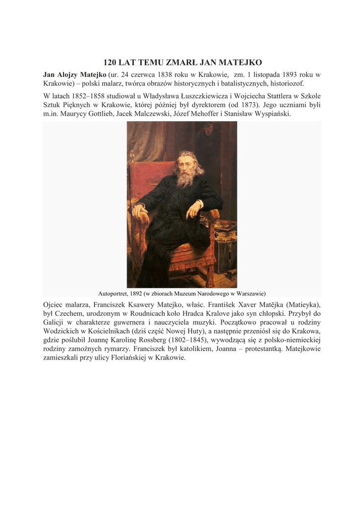 Jan Matejko urodził się w 1838 roku w Krakowie, w którym mieszkał całe życie i w którym zmarł w 1893 roku. Był córki krakowskiego siodlarza. Ochrzczony 1 stycznia w 120 LAT TEMU ZMARŁ JAN MATEJKO Jan Alojzy Matejko (ur. 24 czerwca 1838 roku w Krakowie, zm. 1 listopada 1893 roku w Krakowie) – polski malarz, twórca obrazów historycznych i batalistycznych, historiozof. W latach 1852–1858 studiował u Władysława Łuszczkiewicza i Wojciecha Stattlera w Szkole Sztuk Pięknych w Krakowie, której później był dyrektorem (od 1873). Jego uczniami byli m.in. Maurycy Gottlieb, Jacek Malczewski, Józef Mehoffer i Stanisław Wyspiański. Autoportret, 1892 (w zbiorach Muzeum Narodowego w Warszawie) Ojciec malarza, Franciszek Ksawery Matejko, właśc. František Xaver Matějka (Matieyka), był Czechem, urodzonym w Roudnicach koło Hradca Kralove jako syn chłopski. Przybył do Galicji w charakterze guwernera i nauczyciela muzyki. Początkowo pracował u rodziny Wodzickich w Kościelnikach (dziś część Nowej Huty), a następnie przeniósł się do Krakowa, gdzie poślubił Joannę Karolinę Rossberg (1802–1845), wywodzącą się z polsko-niemieckiej rodziny zamożnych rymarzy. Franciszek był katolikiem, Joanna – protestantką. Matejkowie zamieszkali przy ulicy Floriańskiej w Krakowie. Portret Franciszka Matejki z trojgiem dzieci (u dołu Kazimierz, wyżej Jan i Marianna), 1853/54, obraz ze zbiorów Muzeum Narodowego we Wrocławiu w depozycie Domu Matejki Teodora Matejko w sukni ślubnej, 1879 (replika obrazu z 1865) Jan był dziewiątym dzieckiem, z jedenastu, jakie mieli państwo Matejkowie (było wśród nich dziewięciu chłopców i dwie dziewczynki). Gdy Jan miał siedem lat, zmarła jego matka; dziećmi zajęła się jej siostra. Śmierć matki niewątpliwie wywarła wpływ na osobowość przyszłego malarza. Jego dzieciństwo obfitowało w lęki i przykrości, nie zaznawał także raczej przesadnie starannej opieki (jego złamany nos nie zwrócił niczyjej uwagi i zrósł się krzywo). Ojciec nie okazywał dzieciom swoich uczuć, był surowy i pozbawiony akceptacji dla artystycznej pasji syna. Uczęszczał do szkoły św. Barbary od 1847. Mimo zdradzanych od najmłodszych lat niepospolitych zdolności plastycznych, z pozostałymi dziedzinami radził sobie z ogromnym trudem. Także koledzy nie byli dla niego wyrozumiali i, jak pisał Marian Gorzkowski, doświadczał od swych współtowarzyszy pewnego znęcania się nawet. Wkrótce został przeniesiony do Gimnazjum Św. Anny (obecnie I Liceum Ogólnokształcące im. Bartłomieja Nowodworskiego w Krakowie). Choć Matejko i jego rodzeństwo z pochodzenia w połowie byli Czechami, czuli się polskimi patriotami, o czym świadczy działalność wyzwoleńcza dwóch starszych braci Jana. Brak rodzinnego ciepła po części rekompensowała Matejce przyjaźń z rodziną Giebułtowskich. O Paulinie Giebułtowskiej pisał później, że była dla niego jakby drugą matką; często bywał u jej córki Joanny Serafińskiej w Wiśniczu, a Stanisława traktował jak starszego brata. W wieku trzynastu lat Jan Matejko został przyjęty do krakowskiej Szkoły Sztuk Pięknych przy ulicy Wesołej, której dyrektorem był wówczas Wojciech Stattler. Przejawiał w szkole ogromną ambicję i pracowitość, choć także tam jego edukacja nie przebiegała gładko, na co zapewne wpływ miała osoba Stattlera, trudności finansowe i znaczna wada wzroku. Wpływ na młodego malarza wywarli natomiast inni nauczyciele: Józef Kremer i Władysław Łuszczkiewicz, którzy zainspirowali go do szkicowania krakowskich zabytków, zbierania materiałów, studiowania detali i obrazów, tworząc tzw. Skarbczyk. W 1858 roku otrzymał stypendium na studia w Monachium. Tu zetknął się z dziełami wybitnych malarzy dawnych i współczesnych. Cenił twórczość Paula Delaroche‘a i jego ucznia, Carla von Pilotyʼego, tworzących dzieła historyczne. Matejko przekonał się, że to właśnie temu gatunkowi pragnie się poświęcić (w 1853 roku namalował swój pierwszy obraz historyczny, Carowie Szujscy przed Zygmuntem III). Schemat Delaroche'a, oparty na wybraniu z historii dramatycznego momentu i przedstawieniu go w sposób teatralny i emocjonalny, młody Matejko zastosował w malowanym w Monachium i Krakowie Otruciu królowej Bony (1859). W 1860 roku Matejko wyjechał do Wiednia, skąd szybko wrócił. Tutaj wydał Ubiory w Polsce – publikację, zawierającą ryciny z postaciami w historycznych strojach, świadectwo jego zainteresowań historycznych, co później będzie wielokrotnie wykorzystywał w swoich płótnach. Złą sytuację materialną malarza poprawiło honorarium za Ubiory, sprzedaż Otrucia Bony i Kochanowskiego nad trumną Urszulki. Mimo tych sukcesów Matejko był niezwykle przygnębiony, czego powodem była nieodwzajemniona miłość do Teodory Giebułtowskiej. W 1862 roku namalował jeden ze swoich najwybitniejszych obrazów, Stańczyka Miał wtedy zaledwie 24 lata. 22 stycznia 1863 roku jego dwaj bracia przyłączyli się do Powstania Styczniowego. Jan nie poszedł, ponieważ nie potrafił posługiwać się bronią i źle widział. Woził natomiast broń i pomagał powstańcom materialnie. Portret dzieci artysty, 1879 Jan miał 26 lat, gdy odniósł ogromny sukces dzięki Kazaniu Skargi. Dochód ze wstępu na wystawę oddał na sieroty. W 1864 r. po sprzedaży obrazu mógł pozwolić sobie na małżeństwo z Teodorą Giebułtowską. Mieli razem pięcioro dzieci: Tadeusza (1865–1911), Helenę (1867–1932), Beatę (1869–1926), Jerzego (1873–1927) oraz Reginę (1878), która zmarła jako niemowlę Pogłębiające się z czasem problemy finansowe Matejki spowodowane były chorobą także nadmiernym szafowaniem własnym dorobkiem artystycznym. Kilka wielkich podarował Narodowi Polskiemu, papieżowi przekazał Sobieskiego pod Wiedniem, a otrzymała od niego Joannę d'Arc. Obdarowywał też obrazami swoich znajomych żony, a płócien