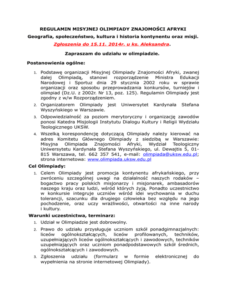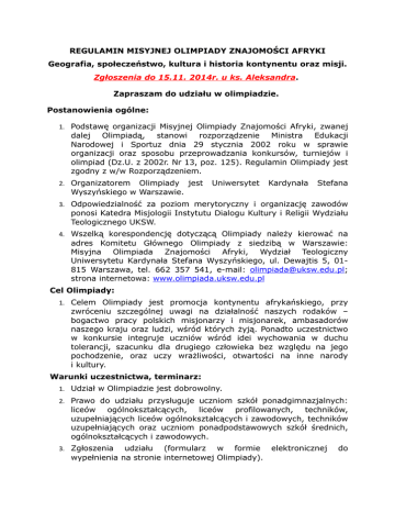 REGULAMIN MISYJNEJ OLIMPIADY ZNAJOMOŚCI AFRYKI Geografia, społeczeństwo, kultura i historia kontynentu oraz misji. Zgłoszenia do 15.11. 2014r. u ks. Aleksandra. Zapraszam do udziału w olimpiadzie. Postanowienia ogólne: 1. Podstawę organizacji Misyjnej Olimpiady Znajomości Afryki, zwanej dalej Olimpiadą, stanowi rozporządzenie Ministra Edukacji Narodowej i Sportuz dnia 29 stycznia 2002 roku w sprawie organizacji oraz sposobu przeprowadzania konkursów, turniejów i olimpiad (Dz.U. z 2002r. Nr 13, poz. 125). Regulamin Olimpiady jest zgodny z w/w Rozporządzeniem. 2. Organizatorem Olimpiady jest Wyszyńskiego w Warszawie. Uniwersytet Kardynała Stefana 3. Odpowiedzialność za poziom merytoryczny i organizację zawodów ponosi Katedra Misjologii Instytutu Dialogu Kultury i Religii Wydziału Teologicznego UKSW. 4. Wszelką korespondencję dotyczącą Olimpiady należy kierować na adres Komitetu Głównego Olimpiady z siedzibą w Warszawie: Misyjna Olimpiada Znajomości Afryki, Wydział Teologiczny Uniwersytetu Kardynała Stefana Wyszyńskiego, ul. Dewajtis 5, 01815 Warszawa, tel. 662 357 541, e-mail: [email protected]; strona internetowa: www.olimpiada.uksw.edu.pl Cel Olimpiady: 1. Celem Olimpiady jest promocja kontynentu afrykańskiego, przy zwróceniu szczególnej uwagi na działalność naszych rodaków – bogactwo pracy polskich misjonarzy i misjonarek, ambasadorów naszego kraju oraz ludzi, wśród których żyją. Ponadto uczestnictwo w konkursie integruje uczniów wśród idei wychowania w duchu tolerancji, szacunku dla drugiego człowieka bez względu na jego pochodzenie, oraz uczy wrażliwości, otwartości na inne narody i kultury. Warunki uczestnictwa, terminarz: 1. Udział w Olimpiadzie jest dobrowolny. 2. Prawo do udziału przysługuje uczniom szkół ponadgimnazjalnych: liceów ogólnokształcących, liceów profilowanych, techników, uzupełniających liceów ogólnokształcących i zawodowych, techników uzupełniających oraz uczniom ponadpodstawowych szkół średnich, ogólnokształcących i zawodowych. 3. Zgłoszenia udziału (formularz w formie wypełnienia na stronie internetowej Olimpiady). elektronicznej do 4. Misyjna Olimpiada Znajomości Afryki to zawody trójstopniowe o zasięgu ogólnopolskim: I stopień – etap szkolny, II stopień – etap okręgowy, III stopień – etap centralny. 5. We wszystkich etapach uczniowie startują indywidualnie. 6. Uczestnicy podejmując decyzję udziału w Olimpiadzie zobowiązani są do ścisłego przestrzegania jej regulaminu. 7. Terminarz Olimpiady: o I etap – 01.12.2014 o II etap – 02.03.2015 o III etap – 15.04.2015 8. Komitet Główny powołuje szesnaście Komitetów Okręgowych, zgodnie z granicami szesnastu województw, powiadamiając o tym Kuratorium województwa i Wydział Katechetyczny danej diecezji. 9. Komitety Okręgowe są lokalnymi strukturami Komitetu Głównego i realizują jego zadania. 10. Podstawą do kwalifikowania uczestników do zawodów wyższego stopnia, przyznawania tytułów i nagród stanowią wyłącznie wyniki uzyskane przez uczestnika w zawodach niższego stopnia danej edycji Olimpiady. Przebieg Olimpiady: 1. Komitet Główny Olimpiady opracowuje zestawy zadań dla wszystkich etapów wraz z instrukcją określającą: zasady przeprowadzania eliminacji, czas udzielania odpowiedzi, zasady oceny oraz określa sposób kwalifikowania zawodników do następnego etapu. 2. Na każdym etapie zawodów wszyscy uczestnicy otrzymują do rozwiązania jeden wspólny, właściwy dla danego etapu zestaw zadań. 3. Prace we wszystkich etapach olimpiady są opatrzone w dane osobowe uczestnika (imię, nazwisko, adres uczestnika i szkoły oraz klasę na etapie szkolnym). 4. Organizatorzy zwracają koszty podróży uczestnikom zawodów okręgowych i centralnych. I etap – szkolny 1. Dyrekcja szkoły, której uczniowie zgłosili chęć udziału w Olimpiadzie, z grona nauczycieli, których przedmioty obejmują swym zakresem problematykę Olimpiady, powołuje Komitet Szkolny. 2. I etap Olimpiady polega na rozwiązaniu testu przygotowanego przez Komitet Główny, obejmującego zakres dołączonej do regulaminu bibliografii. materiału zawarty w 3. Zawody szkolne odbywają się równocześnie we wszystkich szkołach. Równoczesność zakłada rozpoczęcie i zakończenie zawodów zgodnie z harmonogramem określonym przez Komitet Główny i podanym do publicznej wiadomości w piśmie do szkół oraz na stronie internetowej Olimpiady. 4. Komitet Szkolny zobowiązany jest do zapewnienia uczestnikom warunków umożliwiających samodzielność odpowiedzi. 5. Do II etapu – okręgowego kwalifikuje się co najwyżej dwóch z najlepszymi wynikami. Szkoły, które miały uczniów swoim gronie ubiegłorocznych laureatów na miejscach I-XV mogą wysłać dodatkowo na etap okręgowy: I miejsce – 6 uczniów; II miejsce – 5 uczniów; III miejsce – 4 uczniów; IV miejsce – 3 uczniów; V miejsce – 2 uczniów; VI-XV miejsce – 1 uczeń. 6. Komitety Szkolne zobowiązane są w ciągu pięciu dni od przeprowadzenia zawodów przesłać na adres Komitetu Głównego prace uczniów zakwalifikowanych do etapu okręgowego oraz protokół z I etapu (wzór protokołu do pobrania ze strony Olimpiady), zawierający skład Komitetu Szkolnego, ilość uczestników biorących udział w zawodach oraz listę uczestników zakwalifikowanych do II etapu Olimpiady 7. Istnieje możliwość odwołania się do Komitetu Głównego Olimpiady od decyzji w sprawie wyników w terminie do 7 dni od ogłoszenia wyników I etapu. 8. Listę uczestników zakwalifikowanych do II etapu Olimpiady w danym okręgu Komitet Główny Okręgowego Olimpiady. przesyła (bezpośrednio) do Komitetu II etap – okręgowy 1. Eliminacje okręgowe organizowane są przez właściwe Komitety Okręgowe Olimpiady. 2. II etap Olimpiady składa się z dwóch części: z testu oraz pytania problemowego. Zakres materiału określa załączona bibliografia. 3. Zawody okręgo