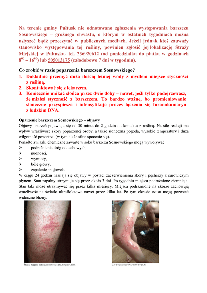 Na terenie gminy Pułtusk nie odnotowano zgłoszenia występowania barszczu Sosnowskiego – groźnego chwastu, o którym w ostatnich tygodniach można usłyszeć bądź przeczytać w publicznych mediach. Jeżeli jednak ktoś zauważy stanowisko występowania tej rośliny, powinien zgłosić jej lokalizację Straży Miejskiej w Pułtusku- tel. 236920612 (od poniedziałku do piątku w godzinach 800 – 1600) lub 505013175 (całodobowo 7 dni w tygodniu). Co zrobić w razie poparzenia barszczem Sosnowskiego? 1. Dokładnie przemyć dużą ilością letniej wody z mydłem miejsce styczności z rośliną. 2. Skontaktować się z lekarzem. 3. Koniecznie unikać słońca przez dwie doby – nawet, jeśli tylko podejrzewasz, że miałeś styczność z barszczem. To bardzo ważne, bo promieniowanie słoneczne przyspiesza i intensyfikuje proces łączenia się furanokumaryn z ludzkim DNA. Oparzenie barszczem Sosnowskiego – objawy Objawy oparzeń pojawiają się od 30 minut do 2 godzin od kontaktu z rośliną. Na siłę reakcji ma wpływ wrażliwość skóry poparzonej osoby, a także słoneczna pogoda, wysokie temperatury i duża wilgotność powietrza (w tym także silne spocenie się). Ponadto związki chemiczne zawarte w soku barszczu Sosnowskiego mogą wywoływać:  podrażnienia dróg oddechowych,  nudności,  wymioty,  bóle głowy,  zapalenie spojówek. W ciągu 24 godzin nasilają się objawy w postaci zaczerwienienia skóry i pęcherzy z surowiczym płynem. Stan zapalny utrzymuje się przez około 3 dni. Po tygodniu miejsca podrażnione ciemnieją. Stan taki może utrzymywać się przez kilka miesięcy. Miejsca podrażnione na skórze zachowują wrażliwość na światło ultrafioletowe nawet przez kilka lat. Po tym okresie czasu mogą pozostać widoczne blizny. Źródło zdjęcia: barszczsosnowskiegoo.blogspot.com, Źródło zdjęcia: www.nowiny24.pl Barszcz Sosnowskiego i pokrewne mu rośliny takie, jak barszcz olbrzymi to jedne z najbardziej niebezpiecznych roślin, jakie żyją w Polsce. W dniach, kiedy jest gorąco a czasami też wilgotno staje się tak niebezpieczny, że nawet przejście koło niego może wywołać poważne rany. Jak rozpoznać barszcz Sosnowskiego? Przede wszystkim jest ogromny – dorasta do 4-5 metrów, u nasady jego łodyga może mieć średnicę 10-12 cm. Do takich rozmiarów barszcz Sosnowskiego dorasta w czasie jednego sezonu. Barszcz Sosnowskiego należy do rodziny baldaszkowatych albo inaczej selerowatych. To ta sama rodzina, w której jest m.in. marchew, pietruszka czy koper. I właśnie koper może nam ułatwić rozpoznanie barszczu Sosnowskiego. Wygląda on bowiem jak gigantyczny koper z charakterystycznymi kwiatami zebranymi w potężny baldach. Liście podzielone są pierzasto, co wyraźnie odróżnia barszcz Sosnowskiego od innych dużych roślin takich jak na przykład łopian. Mogą mieć średnicę 1,5 metra. Łodyga jest w środku pusta. Obecnie barszcz Sosnowskiego rośnie na wielu stanowiskach w całej Polsce. Szczególnie upodobał sobie południe, ale pojawia się praktycznie wszędzie, również w lasach. Źródło zdjęcia: www.pl.wikipedia.org Źródło zdjęcia: www.ochronaroslin.edu.pl Kwiat barszczu Sosnowskiego Liście barszczu Sosnowskiego Skąd wziął się w Polsce barszcz Sosnowskiego? Barszcz Sosnowskiego został sprowadzony ze Związku Radzieckiego na początku lat 50. Jego bardzo szybki wzrost i wysoka zawartość substancji odżywczych sprawiły, że radzieccy uczeni uznali go za doskonałą roślinę uprawną nadającą się na paszę i kiszonki dla bydła. Trudno dziś dojść do tego, dlaczego udało im się pominąć tak „drobny szczegół” jak fakt, że barszcz Sosnowskiego jest niezwykle niebezpieczny dla człowieka. Jedna z teorii głosi, że na swoich pierwotnych stanowiskach, czyli nad strumieniami na Kaukazie barszcz Sosnowskiego nie miał aż tak niebezpiecznych właściwości. Gdzie rośnie barszcz Sosnowskiego? Barszcz Sosnowskiego jest rośliną silnie zachwaszczająca teren. Szybko rośnie na małej powierzchni, ponieważ ma ogromną zdolność do regeneracji, a wielka ilość nasion znajdujących się w glebie sprawia, że roślina zachowuje zdolność do kiełkowania przez kilka lat. Barszcz Sosnowskiego można spotkać w miejscach nieużytkowanych przez człowieka, czyli głównie na odłogach, łąkach i przy drogach. Rośnie także wzdłuż brzegów rzek i jezior, na polach uprawnych, pastwiskach, w ogrodach i parkach. Coraz częściej można go spotkać w żyznych lasach olchowych, a także łęgowych, które rosną nad rzekami i potokami. Barszcz najgęściej rośnie we wschodniej i centralnej części naszego kraju, czyli w województwie warmińsko-mazurskim i mazowieckim. Dlaczego barszcz Sosnowskiego jest niebezpieczny? Zagrożenie dla zdrowia ludzi stanowią furanokumaryny zawarte w soku oraz w wydzielinie włosków gruczołowych barszczu Sosnowskiego. Związki te w obecności światła słonecznego, w szczególności promieni UVA i UVB, wiążą się z DNA komórek skóry i powodują oparzenia (fotodermatozę) II i III stopnia. Barszcz Sosnowskiego jest szczególnie niebezpieczny w okresie kwitnienia i owocowania, kiedy odnotowuje się wysoką temperaturę powietrza. Wtedy nawet pośredni kontakt z tą rośliną może doprowadzić do poparzenia skóry, ponieważ związki furanokumarynowe wydostają się z barszczu w postaci oprysków i osadzają się na skórze osób przebywających w pobliżu. Opracowano na podstawie informacji ze stron: www.piorin.pl; www.ochronaroslin.edu.pl; www.poradnikzdrowie.pl www.barszczsosnowskiego.blogspot.com; www.pl.wikipedia.org; www.nowiny24.pl