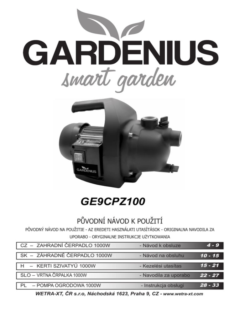 GE9CPZ100 PŮVODNÍ NÁVOD K POUŽITÍ PÔVODNÝ NÁVOD NA POUŽITIE - Az eredeti használati utasítások - Originalna navodila za uporabo - Oryginalne instrukcje użytkowania 4-9 CZ – ZAHRADNí čERPADLO 1000W - Návod k obsluze SK – ZÁHRADNÉ čERPADLO 1000W - Návod na obsluhu 10 - 15 H - Kezelési utasítas 15 - 21 - Navodila za uporabo 22 - 27 - Instrukcja obsługi 28 - 33 – KERTI SZIVATYÚ 1000W SLO –VRTNA ČRPALKA 1000W PL –POMPA OGRODOWA 1000W WETRA-XT, ČR s.r.o, Náchodská 1623, Praha 9, CZ - www.wetra-xt.com SYMBOLS Nářadí je určeno pouze pro domácí - hobby použití. Náradie je určené iba pre domáce - hobby použitie. A szerszám célja az otthoni - hobby használatra. Orodje je namenjeno izključno za domačo ali hobi uporabo. Narzędzie jest przeznaczone jedynie do użycia domowego lub hobbystycznego. Před prvním použitím si pročtěte návod k obsluze Pred prvím použitím si prečítajte návod na použitie Beüzemelés előtt olvassa el a használati utasítást Pred prvo uporabo preberite navodila za uporabo! Przed pierwszym użyciem uważnie przeczytaj instrukcję obsługi. Nebezpečí Nebezpečie Figyelmeztetés Nevarnost! Niebezpieczeństwo Používejte ochranu sluchu Používajte ochranu sluchu Használjon fülvédőt Uporabljajte zaščitna sredstva za varovanje sluha! Używaj środków ochrony słuchu Používejte ochranu zraku Používajte ochranu zraku Használjon védőszemüveget Uporabljajte zaščitna sredstva za varovanje vida! Używaj środków ochrony wzroku Používejte Ochrannou dýchací roušku Používajte ochrannú dýchaciu rúžku Használjon porvédő maszkot Uporabljajte zaščitno dihalno masko! Używaj maski ochronnej Vyjměte zástrčku ze zásuvky okamžitě, pokud je kabel poškozen Vyberte zástrčku zo zásuvky okamžite, ak je kábel poškodený Vegye ki a hálózati csatlakozót azonnal, ha a kábel sérült Napravo takoj, če je kabel poškodovan, ga iztaknite Odłączyć urządzenie od razu, jeśli kabel jest uszkodzony Dvojitá izolace Dvojitá izolácia Dupla szigetelés Dvojna izolacija. Podwójna izolacja cd cd cd cd cd cd Originální návod CZ GE9CPZ100 - ZAHRADNÍ ČERPADLO 1000W OBECNÉ BEZPEČNOSTNÍ POKYNY Tyto bezpečnostní pokyny si pečlivě prostudujte, zapamatujte a uschovejte UPOZORNĚNÍ: Při používání elektrických strojů a elektrického nářadí je nutno respektovat a dodržovat následující bezpečnostní pokyny z důvodů ochrany před úrazem elektrickým proudem, zraněním osob a nebezpečím vzniku požáru. Výrazem „elektrické nářadí“ je ve všech níže uvedených pokynech myšleno jak elektrické nářadí napájené ze sítě (napájecím kabelem), tak nářadí napájené z baterií (bez napájecího kabelu). Uschovejte všechna varovaní a pokyny pro příští použití. došlo k jeho řádnému připojení a používání. Použití těchto zařízení může omezit nebezpečí vznikající prachem. h)Pevně upevněte obrobek. Použijte truhlářskou svěrku nebo svěrák pro upevnění dílu, který budete obrábět. i) Nepoužívejte elektrické nářadí pokud jste pod vlivem alkoholu, drog, léků nebo jiných omamných či návykových látek. j) Toto zařízení není určené pro použití osobami (včetně dětí) se sníženými fyzickými, smyslovými nebo mentálními schopnostmi nebo s nedostatkem zkušeností a znalostí, pokud nejsou pod dozorem nebo nedostali pokyny s ohledem na použiti zařízení od osoby zodpovědné za jejich bezpečnost. Děti musí být pod dozorem, aby jste se ujistili, že si nehrají se zařízením. 4. Používání elektrického nářadí a jeho údržba a) El. nářadí vždy odpojte z el. sítě v případě jakéhokoliv problému při práci, před každým čistěním nebo údržbou, při každém přesunu a po ukončení práce! Nikdy nepracujte s el. nářadím, pokud je jakýmkoliv způsobem poškozené. b)Pokud začne nářadí vydávat abnormální zvuk nebo zápach, okamžitě ukončete práci. c)Elektrické nářadí nepřetěžujte. Elektrické nářadí bude pracovat lépe a bezpečněji, pokud jej budete provozovat v otáčkách, pro které bylo navrženo. Používejte správné nářadí, které je určeno pro danou činnost. Správné nářadí bude lépe a bezpečněji vykonávat práci, pro kterou bylo zkonstruováno. d)Nepoužívejte elektrické nářadí, které nelze bezpečně zapnout a vypnout ovládacím spínačem. Používání takového nářadí je nebezpečné. Vadné spínače musí být opraveny certifikovaným servisem. e)Odpojte nářadí od zdroje elektrické energie předtím, než začnete provádět jeho seřizování, výměnu příslušenství nebo údržbu. Toto opatření zamezí nebezpečí náhodného spuštění. f) Nepoužívané elektrické nářadí ukliďte a uschovejte tak, aby bylo mimo dosah dětí a nepovolaných osob. Elektrické nářadí v rukou nezkušených uživatelů může být nebezpečné. Elektrické nářadí skladujte na suchém a bezpečném místě. g)Udržujte elektrické nářadí v dobrém stavu. Pravidelně kontrolujte seřízení pohybujících se částí a jejich pohyblivost. Kontrolujte zda nedošlo k poškození ochranných krytů nebo jiných částí, které mohou ohrozit bezpečnou funkci elektrického nářadí. Je-li nářadí poškozeno, před dalším použitím zajistěte jeho řádnou opravu. Mnoho úrazů je způsobeno špatně udržovaným elektrickým nářadím. h)Řezací nástroje udržujte ostré a čisté. Správně udržované a naostřené nástroje usnadňují práci, omezují nebezpečí zranění a práce s nimi se snáze kontroluje. Použití jiných příslušenství než těch, která jsou uvedena v návodu k obsluze mohou způsobit poškození nářadí a být příčinou zranění. i) Elektrické nářadí, příslušenství, pracovní nástroje atd. používejte v souladu s těmito pokyny a takovým způsobem, 