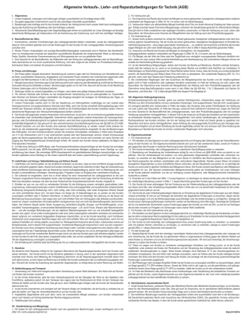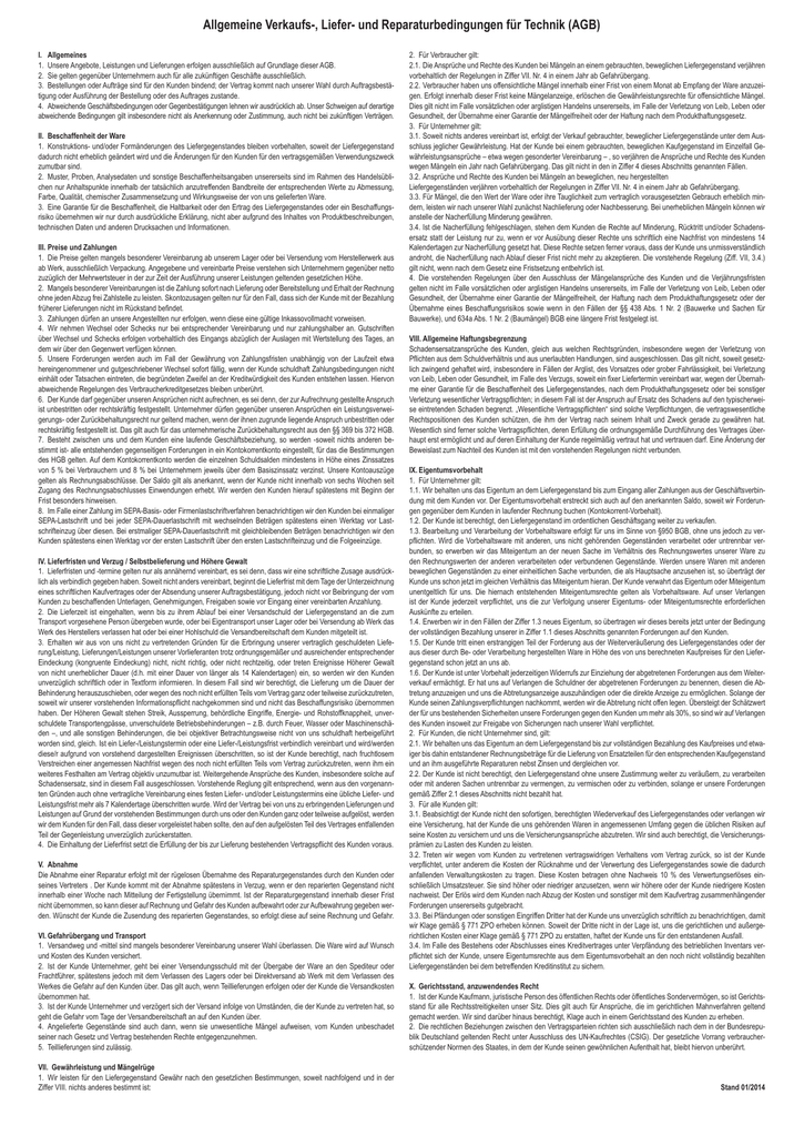 Allgemeine Verkaufs-, Liefer- und Reparaturbedingungen für Technik (AGB) I.Allgemeines 1. Unsere Angebote, Leistungen und Lieferungen erfolgen ausschließlich auf Grundlage dieser AGB. 2. Sie gelten gegenüber Unternehmern auch für alle zukünftigen Geschäfte ausschließlich. 3. Bestellungen oder Aufträge sind für den Kunden bindend; der Vertrag kommt nach unserer Wahl durch Auftragsbestätigung oder Ausführung der Bestellung oder des Auftrages zustande. 4. Abweichende Geschäftsbedingungen oder Gegenbestätigungen lehnen wir ausdrücklich ab. Unser Schweigen auf derartige abweichende Bedingungen gilt insbesondere nicht als Anerkennung oder Zustimmung, auch nicht bei zukünftigen Verträgen. II. Beschaffenheit der Ware 1. Konstruktions- und/oder Formänderungen des Liefergegenstandes bleiben vorbehalten, soweit der Liefergegenstand dadurch nicht erheblich geändert wird und die Änderungen für den Kunden für den vertragsgemäßen Verwendungszweck zumutbar sind. 2. Muster, Proben, Analysedaten und sonstige Beschaffenheitsangaben unsererseits sind im Rahmen des Handelsüblichen nur Anhaltspunkte innerhalb der tatsächlich anzutreffenden Bandbreite der entsprechenden Werte zu Abmessung, Farbe, Qualität, chemischer Zusammensetzung und Wirkungsweise der von uns gelieferten Ware. 3. Eine Garantie für die Beschaffenheit, die Haltbarkeit oder den Ertrag des Liefergegenstandes oder ein Beschaffungsrisiko übernehmen wir nur durch ausdrückliche Erklärung, nicht aber aufgrund des Inhaltes von Produktbeschreibungen, technischen Daten und anderen Drucksachen und Informationen. III.Preise und Zahlungen 1. Die Preise gelten mangels besonderer Vereinbarung ab unserem Lager oder bei Versendung vom Herstellerwerk aus ab Werk, ausschließlich Verpackung. Angegebene und vereinbarte Preise verstehen sich Unternehmern gegenüber netto zuzüglich der Mehrwertsteuer in der zur Zeit der Ausführung unserer Leistungen geltenden gesetzlichen Höhe. 2. Mangels besonderer Vereinbarungen ist die Zahlung sofort nach Lieferung oder Bereitstellung und Erhalt der Rechnung ohne jeden Abzug frei Zahlstelle zu leisten. Skontozusagen gelten nur für den Fall, dass sich der Kunde mit der Bezahlung früherer Lieferungen nicht im Rückstand befindet. 3. Zahlungen dürfen an unsere Angestellten nur erfolgen, wenn diese eine gültige Inkassovollmacht vorweisen. 4. Wir nehmen Wechsel oder Schecks nur bei entsprechender Vereinbarung und nur zahlungshalber an. Gutschriften über Wechsel und Schecks erfolgen vorbehaltlich des Eingangs abzüglich der Auslagen mit Wertstellung des Tages, an dem wir über den Gegenwert verfügen können. 5. Unsere Forderungen werden auch im Fall der Gewährung von Zahlungsfristen unabhängig von der Laufzeit etwa hereingenommener und gutgeschriebener Wechsel sofort fällig, wenn der Kunde schuldhaft Zahlungsbedingungen nicht einhält oder Tatsachen eintreten, die begründeten Zweifel an der Kreditwürdigkeit des Kunden entstehen lassen. Hiervon abweichende Regelungen des Verbraucherkreditgesetzes bleiben unberührt. 6. Der Kunde darf gegenüber unseren Ansprüchen nicht aufrechnen, es sei denn, der zur Aufrechnung gestellte Anspruch ist unbestritten oder rechtskräftig festgestellt. Unternehmer dürfen gegenüber unseren Ansprüchen ein Leistungsverweigerungs- oder Zurückbehaltungsrecht nur geltend machen, wenn der ihnen zugrunde liegende Anspruch unbestritten oder rechtskräftig festgestellt ist. Das gilt auch für das unternehmerische Zurückbehaltungsrecht aus den §§ 369 bis 372 HGB. 7. Besteht zwischen uns und dem Kunden eine laufende Geschäftsbeziehung, so werden -soweit nichts anderen bestimmt ist- alle entstehenden gegenseitigen Forderungen in ein Kontokorrentkonto eingestellt, für das die Bestimmungen des HGB gelten. Auf dem Kontokorrentkonto werden die einzelnen Schuldsalden mindestens in Höhe eines Zinssatzes von 5 % bei Verbrauchern und 8 % bei Unternehmern jeweils über dem Basiszinssatz verzinst. Unsere Kontoauszüge gelten als Rechnungsabschlüsse. Der Saldo gilt als anerkannt, wenn der Kunde nicht innerhalb von sechs Wochen seit Zugang des Rechnungsabschlusses Einwendungen erhebt. Wir werden den Kunden hierauf spätestens mit Beginn der Frist besonders hinweisen. 8. Im Falle einer Zahlung im SEPA-Basis- oder Firmenlastschriftverfahren benachrichtigen wir den Kunden bei einmaliger SEPA-Lastschrift und bei jeder SEPA-Dauerlastschrift mit wechselnden Beträgen spätestens einen Werktag vor Lastschrifteinzug über diesen. Bei erstmaliger SEPA-Dauerlastschrift mit gleichbleibenden Beträgen benachrichtigen wir den Kunden spätestens einen Werktag vor der ersten Lastschrift über den ersten Lastschrifteinzug und die Folgeeinzüge. IV.Lieferfristen und Verzug / Selbstbelieferung und Höhere Gewalt 1. Lieferfristen und -termine gelten nur als annähernd vereinbart, es sei denn, dass wir eine schriftliche Zusage ausdrücklich als verbindlich gegeben haben. Soweit nicht anders vereinbart, beginnt die Lieferfrist mit dem Tage der Unterzeichnung eines schriftlichen Kaufvertrages oder der Absendung unserer Auftragsbestätigung, jedoch nicht vor Beibringung der vom Kunden zu beschaffenden Unterlagen, Genehmigungen, Freigaben sowie vor Eingang einer vereinbarten Anzahlung. 2. Die Lieferzeit ist eingehalten, wenn bis zu ihrem Ablauf bei einer Versandschuld der Liefergegenstand an die zum Transport vorgesehene Person übergeben wurde, oder bei Eigentransport unser Lager oder bei Versendung ab Werk das Werk des Herstellers verlassen hat oder bei einer Hohlschuld die Versandbereitschaft dem Kunden mitgeteilt ist. 3. Erhalten wir aus von uns nicht zu vertretenden Gründen für die Erbringung unserer vertraglich geschuldeten Lieferung/Leistung, Lieferungen/Leistungen unserer Vorlieferanten trotz ordnungsgemäßer und ausreichender entsprechender Eindeckung (kongruente Eindeckung) nicht, nicht richtig, oder nicht rechtzeitig, oder treten Ereignisse Höherer Gewalt von nicht unerheblicher Daue
