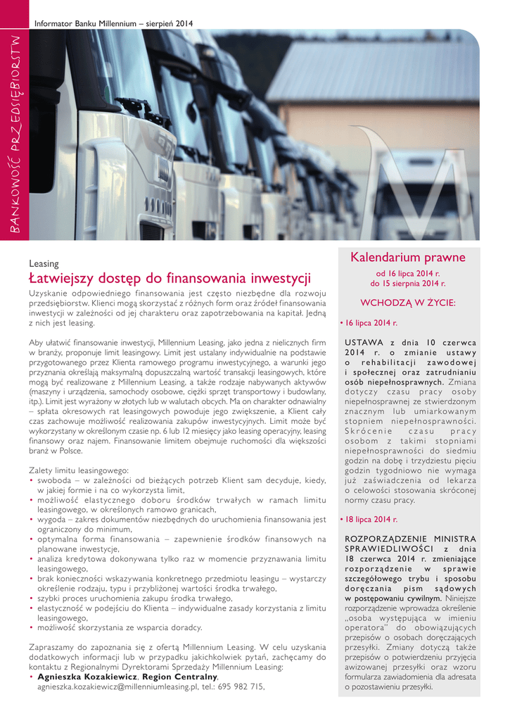 BANKOWOŚĆ PRZ EDSIĘBIORSTW Informator Banku Millennium – sierpień 2014 Leasing Łatwiejszy dostęp do finansowania inwestycji Uzyskanie odpowiedniego f inansowania jest często niezbędne dla rozwoju przedsiębiorstw. Klienci mogą skorzystać z różnych form oraz źródeł finansowania inwestycji w zależności od jej charakteru oraz zapotrzebowania na kapitał. Jedną z nich jest leasing. Aby ułatwić finansowanie inwestycji, Millennium Leasing, jako jedna z nielicznych firm w branży, proponuje limit leasingowy. Limit jest ustalany indywidualnie na podstawie przygotowanego przez Klienta ramowego programu inwestycyjnego, a warunki jego przyznania określają maksymalną dopuszczalną wartość transakcji leasingowych, które mogą być realizowane z Millennium Leasing, a także rodzaje nabywanych aktywów (maszyny i urządzenia, samochody osobowe, ciężki sprzęt transportowy i budowlany, itp.). Limit jest wyrażony w złotych lub w walutach obcych. Ma on charakter odnawialny – spłata okresowych rat leasingowych powoduje jego zwiększenie, a Klient cały czas zachowuje możliwość realizowania zakupów inwestycyjnych. Limit może być wykorzystany w określonym czasie np. 6 lub 12 miesięcy jako leasing operacyjny, leasing finansowy oraz najem. Finansowanie limitem obejmuje ruchomości dla większości branż w Polsce. Zalety limitu leasingowego: • s woboda – w zależności od bieżących potrzeb Klient sam decyduje, kiedy, w jakiej formie i na co wykorzysta limit, • m ożliwość elas t yc znego dobor u środków tr wa ł ych w r amach limitu leasingowego, w określonych ramowo granicach, • w ygoda – zakres dokumentów niezbędnych do uruchomienia finansowania jest ograniczony do minimum, • o ptymalna forma f inansowania – zapewnienie środków f inansow ych na planowane inwestycje, • a naliza kredy towa dokonywana tylko raz w momencie przyznawania limitu leasingowego, • b rak konieczności wskazywania konkretnego przedmiotu leasingu – wystarczy określenie rodzaju, typu i przybliżonej war tości środka trwałego, • s zybki proces uruchomienia zakupu środka trwałego, • e lastyczność w podejściu do Klienta – indywidualne zasady korzystania z limitu leasingowego, • m ożliwość skorzystania ze wsparcia doradcy. Zapraszamy do zapoznania się z ofer tą Millennium Leasing. W celu uzyskania dodatkowych informacji lub w przypadku jakichkolwiek py tań, zachęcamy do kontaktu z Regionalnymi Dyrektorami Sprzedaży Millennium Leasing: • A gnieszka Kozakiewicz, Region Centralny, [email protected], tel.: 695 982 715, Kalendarium prawne od 16 lipca 2014 r. do 15 sierpnia 2014 r. WCHODZĄ W ŻYCIE: •16 lipca 2014 r. U STAWA z dnia 10 c zer wc a 2 014 r. o z m i a n i e u s t aw y o rehabilit acji z awodowej i spo łecznej oraz zatrudnianiu osób niepełnosprawnych. Zmiana dot yc z y c zasu pr acy osoby niepełnosprawnej ze stwierdzonym z n a c z ny m l u b u m i a r kow a ny m s t o p n i e m n i e p e ł n os p r aw n o ś ci . Skrócenie czasu pracy osobom z takimi s topniami niepe ł nospr awności do siedmiu godzin na dobę i trzydziestu pięciu godzin tygodniowo nie w ymaga ju ż z a ś w iad c ze nia od le k a r z a o celowości stosowania skróconej normy czasu pracy. •18 lipca 2014 r. ROZPORZĄDZENIE MINISTR A S P R AW I E D L I WO Ś C I z d ni a 18 czerwca 2014 r. zmieniające r o z p o r z ą d z e n i e w s p r aw i e szczegółowego trybu i sposobu d o r ę c z a n i a p i s m s ą d o w yc h w postępowaniu cywilnym. Niniejsze rozporządzenie wprowadza określenie „osoba w ystępująca w imieniu oper ator a” do obowią zujących przepisów o osobach doręczających przesyłki. Zmiany dotyczą tak że przepisów o potwierdzeniu przyjęcia awizowanej przesyłki oraz wzoru formularza zawiadomienia dla adresata o pozostawieniu przesyłki. • Tomasz Pietryk, Region Zachodni, [email protected], tel.: 695 982 772, • A neta Eichler, Region Południowy, [email protected], tel.: 695 982 753, • J oanna Tomaszewska, Region Północny, [email protected], tel.: 695 982 726. Szczegółowe informacje na temat ofer ty produktów i usług dostępne są również na stronie internetowej www.millennium-leasing.pl. Prognozy makroekonomiczne Brak sygnałów do obniżki kosztów pieniądza w najbliższej przyszłości Na lipcow y m posiedzeniu R ada Polityki Pieniężnej (RPP) pozostawiła stopy procentowe na niezmienionym poziomie . J ednoc ześ nie R ada wycofała się z komunikacji for ward guidance, czyli wskazy wania okresu stabilizacji stóp procentowych. Ruch ten daje RPP większe pole manewru w sy tuacji pogorszenia perspek ty w polsk iej gospodar k i. O t wier a też drogę do obniżek oprocentowania. Prezes Narodowego Banku Polskiego Marek Belka powiedział jednak, że rez ygnacja z for ward guidance nie jest zapowiedzią cięcia stóp już we wrześniu na najbliższym posiedzeniu Rady. Powtórzył też, że obniżki stóp procentow ych nie są scenariuszem bazowym, a ich prawdopodobieństwo jest niewielkie. Jego zdaniem należy unikać procyklicznej polityki pieniężnej i w warunkach przyspieszenia wzrostu gospodarczego polityka pieniężna nie powinna być łagodzona. Zaskakująco niska inflacja jest źródłem dyskomfortu dla Rady, choć należy pamiętać, że proces dezinflacji jest w dużej mierze efek tem cz ynników zewnętr znych, a także szoków podażowych, na które polityka pieniężna nie ma wpływu. Jeśli chodzi o kierunek polityki pieniężnej, to w RPP istnieje bardzo daleko posunięta konwer gencja poglądów. Os tatnie decyzje Rady sugerują, że jest zgodność co do stabilizacji stóp procentowych. Wypowiedzi członków RPP wskazują, że za rychłymi obniżkami stóp opowiadają się obecnie prof. Elżbieta Chojna-Duch oraz prof. Jerzy Osiatyński. Rada dodała, iż decyzje w kolejnych miesiąc ach b ę dą u w a r unkow a ne informacjami wpływającymi na ocenę perspektyw wzrostu i inflacji w średnim okres