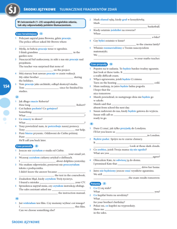 ŚJ Środki językowe Tłumaczenie fragmentów zdań W ćwiczeniach (1–23) uzupełnij angielskie zdania, tak aby odpowiadały polskim tłumaczeniom. Czas teraźniejszy 1 1 Policjant zapytał pana Browna, gdzie pracuje. 2 3 4 154 5 The police officer asked Mr Brown where . Myślę, że babcia pracuje teraz w ogrodzie. I think grandma in the garden now. Nauczyciel był zaskoczony, że nikt z nas nie pracuje nad projektem. The teacher was surprised that none of on the project. Mój starszy brat zawsze pracuje w czasie wakacji. My older brother during the holidays. Tom pracuje jako architekt, odkąd skończył studia. Tom since he finished his studies. 2 2 Mark złamał rękę, kiedy grał w koszykówkę. Mark basketball. 3 Kiedy ostatnio jeździłeś na rowerze? When a bike? 4 Czy byłeś ostatnio w kinie? to the cinema lately? 5 Właśnie rozmawialiśmy z Twoim nauczycielem matematyki. We to your maths teacher. Czas przyszły 5 1 Popatrz na te zadania. To będzie bardzo trudny egzamin. 2 3 4 1 Jak długo znacie Roberta? How long Robert? 2 Coś ładnie pachnie! Co gotujesz? Something . What ? 3 Co znaczy to słowo? What ? 4 Tony powiedział nam, że potrzebuje naszej pomocy. Tony our help. 5 Piotr bierze prysznic. Oddzwoni do Ciebie później. Piotr . He’ll call you back later. 5 6 1 Dam Ci znać, jak tylko przyjadę do Londynu. 2 Czas przeszły 3 1 Jeszcze nie czytałam e-maila od Ciebie. I 3 your email yet. 2 Wczoraj czytałem ciekawy artykuł o delfinach. I about dolphins yesterday. 3 Nie znałam odpowiedzi, ponieważ nie przeczytałam tekstu z podręcznika. I didn’t know the answer because the text in the coursebook. 4 Znalazłem błąd, kiedy czytałem Twój życiorys. I found a mistake your CV. 5 Sprzedawca zapytał mnie, czy czytałem instrukcję obsługi. The sales assistant asked me the instruction manual. 4 1 Już widziałam ten film. Czy możemy wybrać coś innego? I Can we choose something else? Środki językowe this film. Just look at these tasks. It a really difficult exam. Włącz ogrzewanie, jeżeli będzie Ci zimno. Turn on the heating cold. Mam nadzieję, że jutro będzie ładna pogoda. I hope that the nice tomorrow. Marek powiedział, że następnego dnia nie będzie go w szkole. Marek said that absent from school the next day. Susan zadzwoni do nas, kiedy będzie gotowa do wyjścia. Susan will call us ready to go. 4 5 I’ll let you know as in London. Będzie padać. Spójrz na te czarne chmury. It . Look at those dark clouds. Co zrobisz, jeżeli Twoja mama się nie zgodzi? What are you agree? Obiecałem Kate, że odwiozę ją do domu. I promised Kate that drive her home. Jutro nie będziemy jeszcze znać wyników egzaminu. We still the exam results tomorrow. Pytania 7 1 Co Ci się stało? What 2 Co kupiłaś bratu na urodziny? What for your brother’s birthday? 3 Pokaż mi, co kupiłeś na wyprzedaży. Show me in the sales. you? 4 Kto wam powiedział, że zamierzam wyjechać? Czasownik BYĆ 11 Who that I was going to leave? Who ? 5 Kogo szukasz? 8 1 Czy możesz pożyczyć mi ładowarkę do telefonu? me a phone charger? 2 Chciałbym się dowiedzieć, czy mogę zostawić tu swój bagaż. I’d like to know my luggage here. 3 O czym rozmawiałyście, kiedy wszedłem? What when I came in? 4 Z kim rozmawiasz? Who 5 Tim nie chciał mi powiedzieć, na kogo czeka. Tim didn’t want to tell me who ? 4 5 . What is ? Poczyniono już ogromne postępy w walce z rakiem. A lot of progress in fighting cancer. Ten film został zrobiony rok temu przez grupę nastolatków. The film a year ago by a group of teenagers. W przyszłości zakupy będą robione głównie przez internet. In the future shopping mostly on the Internet. W muzeum nie wolno robić zdjęć. You pictures in the museum. 2 3 4 5 Camping on the beach Co trzeba zrobić, żeby zostać dziennikarzem? What do become a journalist? W jakim języku mówi się w Brazylii? What langauge in Brasil? Ta droga została otwarta miesiąc temu. This road Jeszcze nie ogłoszono zwycięzcy konkursu. The winner of the competition 1 Na koncercie było bardzo mało ludzi. . people at the concert. 2 Było za późno, żeby zdążyć na pociąg. catch the train. 3 Zeszłej nocy była burza. last night. 4 Trudno mi było zrozumieć irlandzki akcent. to understand the Irish accent. 5 Nigdy nie byłem w cyrku. I to the circus. Bezokolicznik 13 1 Muszę wstać o siódmej rano, jeśli nie chcę się spóźnić. 2 3 4 10 1 Nie wolno biwakować na plaży. outside. zobaczyć. interesting places I’d like to see. 3 Jest pół do siódmej wieczorem. six in the evening. 4 Łatwo jest zgubić się w tak dużym mieście. get lost in such a big city. 5 Krzysiek jest moim najlepszym przyjacielem od lat. Chris my best friend for years. 1 Z czego robi się pastę do zębów? 3 2 Jest kilka interesujących miejsc, które chciałbym 12 Strona bierna i formy bezosobowe 9 2 1 Na zewnątrz jest bardzo zimno. 5 I must seven a.m. if I don’t want to be late. Ciężko jest wstać rano, kiedy wciąż jest ciemno. It’s in the morning when it’s still dark. Poszedłem spać o ósmej, żeby wcześnie wstać. I went to sleep at eight p.m. early. Chciałbym wstać wcześniej niż zwykle. I’d than usual. Kiedy jestem na wakacjach, nie lubię wstawać wcześnie rano. When I’m on holiday, I don’t early in the morning. 14 1 Wiele osób boi się latać. A lot of people are 2 Muszę dzisiaj skończyć pisać to wypracowanie. ago. I have this essay today. 3 Zapomniałem zapłacić rachunek za telefon. I yet. . the phone bill. 4 Moi rodzice nie pozwolili mi pojechać na festiwal. My parents didn’t let the festival. 5 Czy mógłbyś przestać śpiewać. To mi przeszkadza. Could you ? It disturbs me. Środki językowe 155 ŚJ Środki językowe Tłumaczenie fragmentów zdań 4 To jest tak ważna informacja, że nie możemy jej trzymać Przysłówek 15 1 Chciałbym dobrze mówić po angielsku. I’d like . This hairstyle makes . We’re looking for someone . 2 Dobr