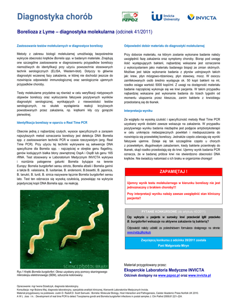 Diagnostyka chorób Borelioza z Lyme – diagnostyka molekularna (odcinek 41/2011) Zastosowanie testów molekularnych w diagnostyce boreliozy Odpowiedni dobór materiału do diagnostyki molekularnej Metody z zakresu biologii molekularnej umoŜliwiają bezpośrednie wykrycie obecności krętków Borrelia spp. w badanym materiale. Znajdują one szczególne zastosowanie w diagnozowaniu przypadków boreliozy niemoŜliwych do identyfikacji przy uŜyciu powszechnie stosowanych technik serologicznych (ELISA, Western-blot). Dotyczy to głównie diagnostyki wczesnej fazy zakaŜenia, w której nie dochodzi jeszcze do rozwinięcia odpowiedzi immunologicznej oraz serologicznie ujemnych przypadków choroby. Przy doborze materiału, na którym zostanie wykonane badanie naleŜy uwzględnić fazę zakaŜenia oraz symptomy choroby. Biorąc pod uwagę ilość występujących bakterii, najbardziej wskazane jest oznaczenie z wykorzystaniem jako materiału badanego biopsji ze zmian skórnych. MoŜliwe jest takŜe wykonanie badania z płynów ustrojowych takich jak: krew, płyn mózgowo-rdzeniowy, płyn stawowy, mocz. W osoczu zainfekowanych osób średnio występuje ok. 50 kopii bakterii na ml, rzadko osiąga wartość 5000 kopii/ml. Z uwagi na dostępność materiału badanie najczęściej wykonuje się we krwi pacjenta. W takim przypadku najbardziej wskazane jest wykonanie badania do trzech tygodni od momentu ukąszenia przez kleszcza, zanim bakterie z krwiobiegu przedostaną się do tkanek. Testy molekularne przydatne są równieŜ w celu weryfikacji nietypowych objawów boreliozy oraz wykluczenia fałszywie pozytywnych wyników diagnostyki serologicznej, wynikających z nieswoistości testów serologicznych, na skutek wystąpienia reakcji krzyŜowych powodowanych przez zakaŜenia, np. krętkami kiły czy gorączki pierwotnej. Identyfikacja boreliozy w oparciu o Real Time PCR Obecnie jedną z najbardziej czułych, wysoce specyficznych a zarazem najszybszych metod oznaczania boreliozy jest detekcja DNA Borrelia spp. z zastosowaniem techniki PCR w czasie rzeczywistym (ang. Real Time PCR). Przy uŜyciu tej techniki wykrywane są sekwencje DNA specyficzne dla Borrelia spp. - najczęściej w obrębie genu flagelliny, genów kodujących białka błony zewnętrznej OspA i OspB lub genu 16S rRNA. Test stosowany w Laboratorium Medycznym INVICTA wykrywa i rozróŜnia patogenne gatunki Borrelia bytujące na terenie Europy: Borrelia burgdorferi sensu stricto, Borrelia afzelii i Borrelia garinii a takŜe B. valaisiana, B. lusitaniae, B. andersonii, B.bissettii, B. japonica, B. tanukii, B. turdi, B. sinica nazywane łącznie Borrelia burgdorferi sensu lato. Test ten odznacza się wysoką czułością, pozwalając na wykrycie pojedynczej kopii DNA Borrelia spp. na reakcję. Interpretacja wyniku Ze względu na wysoką czułość i specyficzność metody Real Time PCR uzyskany wynik dodatni zawsze wskazuje na zakaŜenie. W przypadku pozytywnego wyniku badania niezbędne jest podjęcie antybiotykoterapii w celu uniknięcia niebezpiecznych powikłań i niedopuszczenia do rozwinięcia się przewlekłej boreliozy. JednakŜe często zdarzają się wyniki fałszywie ujemne. Dzieje się tak szczególnie często u chorych z przewlekłym, długotrwałym zakaŜeniem, kiedy bakterie przeniknęły do tkanek, skąd rzadko przedostają się do krwi. Ujemny wynik badania PCR oznacza, Ŝe w badanej próbce krwi nie stwierdzono obecności DNA krętków. Nie świadczy natomiast o ich braku w organizmie chorego! ZAPAMIĘTAJ ! Ujemny wynik testu molekularnego w kierunku boreliozy nie jest jednoznaczny z brakiem choroby!!! Przy interpretacji wyniku naleŜy zawsze uwzględnić stan kliniczny pacjenta!! PYTANIE KONKURSOWE (do artykułu 40/2011) Czy wykrycie u pacjenta w surowicy krwi przeciwciał IgM przeciwko B. burgdorferi wskazuje na aktywne zakaŜenie tą bakterią? Odpowiedzi naleŜy udzielić za pośrednictwem formularza dostępnego na stronie: www.invicta.pl/konkurs Zwycięzcą konkursu z odcinka 39/2011 została Pani Małgorzata Miryn Materiał przygotowany przez: Ryc.1 Krętki Borrelia burgdorferi. Obraz uzyskany przy pomocy skaningowego mikroskopu elektronowego (SEM), sztucznie kolorowany. Eksperckie Laboratoria Medyczne INVICTA Odcinek dostępny na www.pzpoz.pl oraz www.invicta.pl Opracowanie: mgr Iwona Dziadczyk, diagnosta laboratoryjny. Konsultacja: mgr BoŜena Maj, diagnosta laboratoryjny, specjalista analityki klinicznej, Kierownik Laboratoriów Medycznych Invicta. Materiał przygotowany na podstawie: Justin D. Radolf,D. Scott Samuels : Borrelia: Molecular Biology, Host Interaction and Pathogenesis, Caister Akademic Press Norfolk UK 2010. A W L Joss i in. : Development of real time PCR to detect Toxoplasma gondii and Borrelia burgdorferi infections in postal samples J. Clin Pathol 2008;61:221–224.