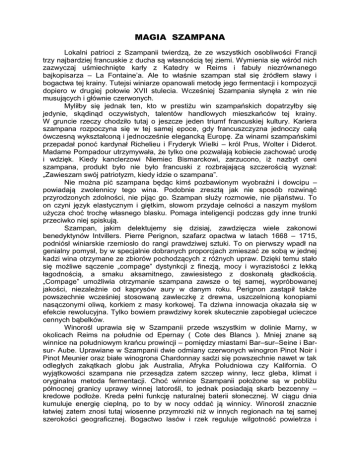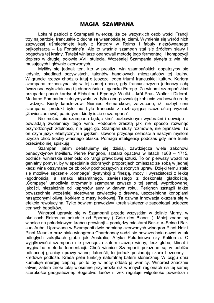 MAGIA SZAMPANA Lokalni patrioci z Szampanii twierdzą, że ze wszystkich osobliwości Francji trzy najbardziej francuskie z ducha są własnością tej ziemi. Wymienia się wśród nich zazwyczaj uśmiechnięte karły z Katedry w Reims i fabuły niezrównanego bajkopisarza – La Fontaine’a. Ale to właśnie szampan stał się źródłem sławy i bogactwa tej krainy. Tutejsi winiarze opanowali metodę jego fermentacji i kompozycji dopiero w drugiej połowie XVII stulecia. Wcześniej Szampania słynęła z win nie musujących i głównie czerwonych. Myliłby się jednak ten, kto w prestiżu win szampańskich dopatrzyłby się jedynie, skądinąd oczywistych, talentów handlowych mieszkańców tej krainy. W gruncie rzeczy chodziło tutaj o jeszcze jeden triumf francuskiej kultury. Kariera szampana rozpoczyna się w tej samej epoce, gdy francuszczyzna jednoczy całą ówczesną wykształconą i jednocześnie elegancką Europę. Za winami szampańskimi przepadał ponoć kardynał Richelieu i Fryderyk Wielki – król Prus, Wolter i Diderot. Madame Pompadour utrzymywała, że tylko one pozwalają kobiecie zachować urodę i wdzięk. Kiedy kanclerzowi Niemiec Bismarckowi, zarzucono, iż nazbyt ceni szampana, produkt było nie było francuski z rozbrajającą szczerością wyznał: „Zawieszam swój patriotyzm, kiedy idzie o szampana”. Nie można pić szampana będąc kimś pozbawionym wyobraźni i dowcipu – powiadają zwolennicy tego wina. Podobnie zresztą jak nie sposób rozwinąć przyrodzonych zdolności, nie pijąc go. Szampan służy rozmowie, nie pijaństwu. To on czyni język elastycznym i giętkim, słowom przydaje celności a naszym myślom użycza choć trochę własnego blasku. Pomaga inteligencji podczas gdy inne trunki przeciwko niej spiskują. Szampan, jakim delektujemy się dzisiaj, zawdzięcza wiele zakonowi benedyktynów Intvillers. Pierre Perignon, szafarz opactwa w latach 1668 – 1715, podniósł winiarskie rzemiosło do rangi prawdziwej sztuki. To on pierwszy wpadł na genialny pomysł, by w specjalnie dobranych proporcjach zmieszać ze sobą w jednej kadzi wina otrzymane ze zbiorów pochodzących z różnych upraw. Dzięki temu stało się możliwe sączenie „compage” dystynkcji z finezją, mocy i wyrazistości z lekką łagodnością, a smaku aksamitnego, zawiesistego z doskonałą gładkością. „Compage” umożliwia otrzymanie szampana zawsze o tej samej, wypróbowanej jakości, niezależnie od kaprysów aury w danym roku. Perignon zastąpił także powszechnie wcześniej stosowaną zawleczkę z drewna, uszczelnioną konopiami nasączonymi oliwą, korkiem z masy korkowej. Ta dziwna innowacja okazała się w efekcie rewolucyjna. Tylko bowiem prawdziwy korek skutecznie zapobiegał ucieczce cennych bąbelków. Winorośl uprawia się w Szampanii przede wszystkim w dolinie Marny, w okolicach Reims na południe od Epernay ( Cote des Blancs ). Mniej znane są winnice na południowym krańcu prowincji – pomiędzy miastami Bar–sur–Seine i Barsur- Aube. Uprawiane w Szampanii dwie odmiany czerwonych winogron Pinot Noir i Pinot Meunier oraz białe winogrona Chardonnay sadzi się powszechnie nawet w tak odległych zakątkach globu jak Australia, Afryka Południowa czy Kalifornia. O wyjątkowości szampana nie przesądza zatem szczep winny, lecz gleba, klimat i oryginalna metoda fermentacji. Choć winnice Szampanii położone są w pobliżu północnej granicy uprawy winnej latorośli, to jednak posiadają skarb bezcenny – kredowe podłoże. Kreda pełni funkcję naturalnej baterii słonecznej. W ciągu dnia kumuluje energię cieplną, po to by w nocy oddać ją winnicy. Winorośl znacznie łatwiej zatem znosi tutaj wiosenne przymrozki niż w innych regionach na tej samej szerokości geograficznej. Bogactwo lasów i rzek reguluje wilgotność powietrza i gleby. Podczas słonecznych zazwyczaj w Szampanii miesięcy letnich winnice nie są więc narażone na nadmierne wysuszenie. Szampan posiada jedną zasadnicza wadę – jest drogi. Nawet w jego ojczyźnie najtańsza butelka to równowartość dwóch butelek średniej klasy bordo lub burgunda. Czyżby więc mieli rację złośliwcy utrzymujący, że za wyśrubowaną ceną kryje się jedynie potęga reklamy i ludzki snobizm? Aby wyjaśnić tę kwestię warto choćby w największym skrócie zapoznać się z procesem produkcji tego, jak mawiają winiarze, najbardziej „wypracowanego” wina. Nie istnieje szampan czerwony, bywa jedynie różowy. Ale najpowszechniej wytwarzane w Szampanii wino zawdzięcza złocisty kolor przede wszystkim winogronom czerwonym. Dlatego też prasy wyciskające sok z winogron są tak skonstruowane, aby nie dopuścić do jego zaplamienia rubinowym barwnikiem zawartym w skórkach. Wyciśnięty sok, zwany moszczem, poddaje się fermentacji w beczkach o pojemności 205 litrów lub w bardziej nowoczesnych kadziach ze szkła. Wraz z nadejściem zimowych chłodów, pod koniec grudnia, enzymy tracą swą aktywność i fermentacja ustaje. Nadchodzi teraz okres łączenia ze sobą różnych win fermentujących dotąd oddzielnie. Idąc w ślady Perignona każdy producent kieruje się w tej delikatnej materii własnym doświadczeniem i stosuje oryginalną recepturę, której tajemnicy pilnie strzeże. Zależnie od specyficznych warunków klimatycznych danego roku receptura ta zresztą nieco się zmienia. Najogólniej można powiedzieć, że na produkt finalny po jednej czwartej składają się: delikatne i aromatyczne wina okolic Ay, bujne, aksamitne w smaku, bogate w alkohol wina z okolic Reims oraz lekkie i wykwintne wina Cote des Blancs. Chroniona przez prawo jest nazwa „champagne”, zawsze wyraźnie wybita na etykietce, a nie na przykład charakterystyczny kształt butelki. Jeśli zamiast niej możemy odczytać „mousseux”, „clairette”, bądź „doux” lub „sec” z dodatkiem jakiejś nazwy własnej, to jest to po prostu jeden z gatunków wina musującego, lecz nie szampan. Nic t
