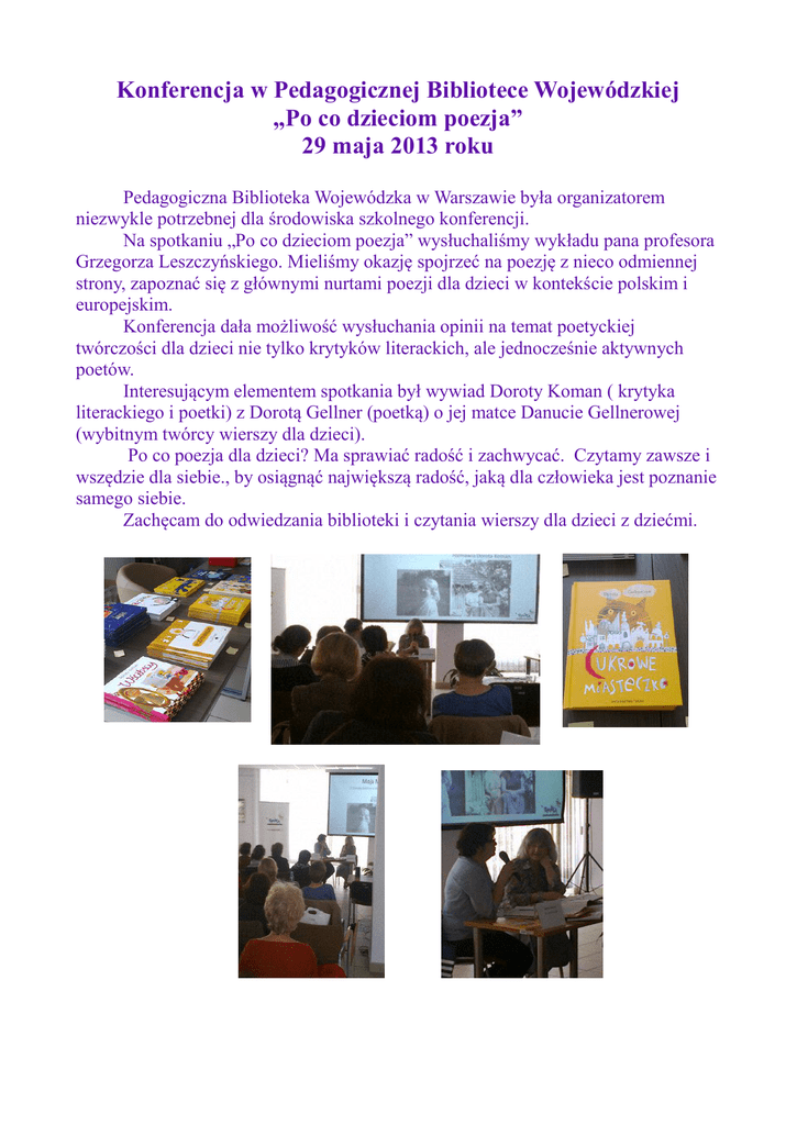 Konferencja w Pedagogicznej Bibliotece Wojewódzkiej „Po co dzieciom poezja” 29 maja 2013 roku Pedagogiczna Biblioteka Wojewódzka w Warszawie była organizatorem niezwykle potrzebnej dla środowiska szkolnego konferencji. Na spotkaniu „Po co dzieciom poezja” wysłuchaliśmy wykładu pana profesora Grzegorza Leszczyńskiego. Mieliśmy okazję spojrzeć na poezję z nieco odmiennej strony, zapoznać się z głównymi nurtami poezji dla dzieci w kontekście polskim i europejskim. Konferencja dała możliwość wysłuchania opinii na temat poetyckiej twórczości dla dzieci nie tylko krytyków literackich, ale jednocześnie aktywnych poetów. Interesującym elementem spotkania był wywiad Doroty Koman ( krytyka literackiego i poetki) z Dorotą Gellner (poetką) o jej matce Danucie Gellnerowej (wybitnym twórcy wierszy dla dzieci). Po co poezja dla dzieci? Ma sprawiać radość i zachwycać. Czytamy zawsze i wszędzie dla siebie., by osiągnąć największą radość, jaką dla człowieka jest poznanie samego siebie. Zachęcam do odwiedzania biblioteki i czytania wierszy dla dzieci z dziećmi.