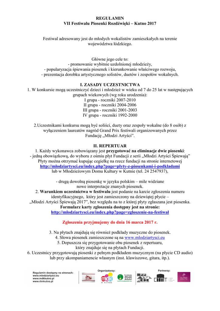 REGULAMIN VII Festiwalu Piosenki Rozdźwięki – Kutno 2017 Festiwal adresowany jest do młodych wokalistów zamieszkałych na terenie województwa łódzkiego. Główne jego cele to: - promowanie wybitnie uzdolnionej młodzieży, - popularyzacja śpiewania piosenek i kierunkowanie właściwego rozwoju, - prezentacja dorobku artystycznego solistów, duetów i zespołów wokalnych. I. ZASADY UCZESTNICTWA 1. W konkursie mogą uczestniczyć dzieci i młodzież w wieku od 7 do 25 lat w następujących grupach wiekowych (wg roku urodzenia): I grupa - roczniki 2007-2010 II grupa - roczniki 2004-2006 III grupa - roczniki 2001-2003 IV grupa - roczniki 1992-2000 2.Uczestnikami konkursu mogą być soliści, duety oraz zespoły wokalne (do 8 osób) z wyłączeniem laureatów nagród Grand Prix festiwali organizowanych przez Fundację „Młodzi Artyści”. II. REPERTUAR 1. Każdy wykonawca zobowiązany jest przygotować na eliminacje dwie piosenki: - jedną obowiązkową, do wyboru z ośmiu płyt Fundacji z serii „Młodzi Artyści Śpiewają” Płyty można otrzymać kupując cegiełkę na rzecz fundacji na stronie internetowej http://mlodziartysci.eu/index.php?page=plyty-z-piosenkami-i-podkladami lub w Młodzieżowym Domu Kultury w Kutnie (tel. 24 2547937), - drugą dowolną piosenkę w języku polskim – mile widziane nowe interpretacje znanych piosenek. 2. Warunkiem uczestnictwa w festiwalu jest podanie na karcie zgłoszenia numeru identyfikacyjnego, który jest zamieszczony na dziewiątej płycie – „Młodzi Artyści Śpiewają 2017”, bez względu na to z której płyty zgłaszana jest piosenka. Formularz karty zgłoszenia dostępny jest na stronie: http://mlodziartysci.eu/index.php?page=zgloszenie-na-festiwal Zgłoszenia przyjmujemy do dnia 16 marca 2017 r. 3. Na płytach znajdują się również podkłady muzyczne do piosenek. 4. Słowa piosenek zamieszczone są na www.mlodziartysci.eu 5. Dopuszcza się przygotowanie obu piosenek z repertuaru, który znajduje się na płytach Fundacji. 6. Uczestnicy przygotowują piosenki z pełnym podkładem muzycznym (na płycie CD audio) lub przy akompaniamencie własnym (inst. klawiszowe, gitara, itp.). III. ELIMINACJE – „KONCERT WIOSENNY” 1. Przesłuchania eliminacyjne do VII Festiwalu Piosenki Rozdźwięki – Kutno 2017 odbędą się dnia 19 marca 2017 r. od godz. 10.00 w Kutnowskim Domu Kultury ul. Żółkiewskiego 4, 99-302 Kutno 2. Podczas przesłuchań Rada Artystyczna wybierze osoby zaproszone do udziału w Warsztatach Wokalnych oraz Koncercie Jesiennym. 3. Decyzje Rady Artystycznej są ostateczne. IV. WARSZTATY WOKALNE i KONKURS – „KONCERT JESIENNY” 1. Dnia 14 października 2017 r. w Centrum Teatru Muzyki i Tańca w Kutnie odbędą się Warsztaty Wokalne i próby z orkiestrą festiwalową. 2. Dnia 15 października 2017 r. w Centrum Teatru Muzyki i Tańca odbędzie się Koncert Konkursowy VII Festiwalu Piosenki „Rozdźwięki” – Kutno 2017. 3. W Koncercie Konkursowym każdy solista, duet lub zespół wokalny wyłoniony w trakcie eliminacji zaprezentuje jeden utwór. 3. Rada Artystyczna festiwalu zastrzega sobie prawo wyboru tego utworu spośród dwóch prezentowanych podczas eliminacji lub zaproponowanie nowego utworu. V. JURY i NAGRODY 1. Wszystkie prezentacje w koncercie konkursowym będą oceniane przez jury. 2. Ocenie podlegać będą: a) walory wokalne b) umiejętności warsztatowe c) interpretacja utworu d) dobór repertuaru i możliwości wykonawcy 3. Decyzje Jury są ostateczne. 4. NAGRODY Grand Prix VII Festiwalu Piosenki Rozdźwięki – Kutno 2017 - 1.000 zł. Nagrody rzeczowe oraz wyróżnienia. Jury ma prawo zaprosić jednego lub dwóch spośród głównych laureatów do udziału w Ogólnopolskim Festiwalu Piosenki Dziecięcej i Młodzieżowej FUMA – Zielona Góra 2018. VI. INFORMACJE OGÓLNE 1. Uczestnicy eliminacji oraz koncertu dojeżdżają na koszt własny. 2. Niepełnoletnim uczestnikom konkursu musi towarzyszyć pełnoletni opiekun lub rodzic. 3. Zgłaszając się do Festiwalu, Uczestnik lub prawny opiekun (w przypadku osoby niepełnoletniej) zezwala na wykorzystanie i przetwarzanie danych zawartych w karcie zgłoszenia w zakresie niezbędnym do realizacji Festiwalu. 4. Wyrażenie zgody jest dobrowolne. Zgoda może być wycofana w każdym czasie, w dowolny sposób. Wycofanie zgody jest wolne od opłat. 5. Pełnoletni Uczestnik lub prawny opiekun (w przypadku osoby niepełnoletniej) mają prawo dostępu do treści swoich danych oraz do ich poprawiania. 6. Podanie danych w zakresie wynikającym z formularza jest niezbędne celem zakwalifikowania uczestnika do udziału w festiwalu. 7. Sprawy nie ujęte w regulaminie rozstrzyga organizator. 8. Decyzje Rady Artystycznej oraz Jury są ostateczne i nieodwołalne. 9. Organizatorzy zastrzegają sobie prawo do wielokrotnej rejestracji, wielokrotnego publicznego wykonania i odtwarzania, wielokrotnej publicznej emisji radiowej i telewizyjnej prezentacji artystycznych uczestników imprezy, bez wypłacania im honorariów. Wszelkich informacji organizacyjnych, programowych i technicznych udziela: Europejska Fundacja Wspierania Talentów Dzieci i Młodzieży „Młodzi Artyści” Paweł Słoniowski [email protected] tel. 602590776, 661954325