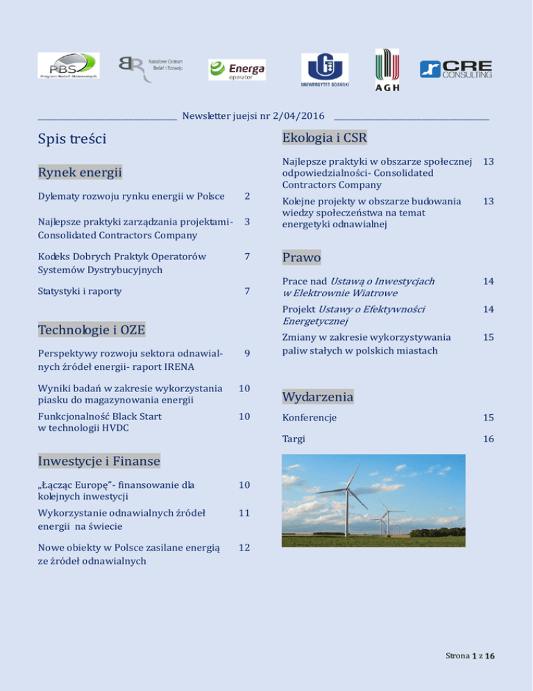 ___________________________________ Newsletter juejsi nr 2/04/2016 _______________________________________ Spis treści Ekologia i CSR Rynek energii Najlepsze praktyki w obszarze społecznej 13 odpowiedzialności- Consolidated Contractors Company Dylematy rozwoju rynku energii w Polsce 2 Najlepsze praktyki zarządzania projektamiConsolidated Contractors Company 3 Kolejne projekty w obszarze budowania wiedzy społeczeństwa na temat energetyki odnawialnej Kodeks Dobrych Praktyk Operatorów Systemów Dystrybucyjnych 7 Prawo Statystyki i raporty 7 Prace nad Ustawą o Inwestycjach 13 14 w Elektrownie Wiatrowe Projekt Ustawy o Efektywności 14 Energetycznej Technologie i OZE Perspektywy rozwoju sektora odnawialnych źródeł energii- raport IRENA 9 Wyniki badań w zakresie wykorzystania piasku do magazynowania energii 10 Funkcjonalność Black Start w technologii HVDC 10 Zmiany w zakresie wykorzystywania paliw stałych w polskich miastach 15 Wydarzenia Konferencje 15 Targi 16 Inwestycje i Finanse „Łącząc Europę”- finansowanie dla kolejnych inwestycji 10 Wykorzystanie odnawialnych źródeł energii na świecie 11 Nowe obiekty w Polsce zasilane energią ze źródeł odnawialnych 12 Strona 1 z 16 ___________________________________ Newsletter juejsi nr 2/04/2016 _______________________________________ Rynek energii Dylematy rozwoju rynku energii w Polsce Istotne zmiany w obszarze przepisów polskiego prawa, jakie nastąpiły pod koniec ubiegłego roku, w tym w szczególności opóźnienie o pół roku wejścia w życie systemu aukcyjnego, stawiają kolejne wyzwania przed kadrami zarządzającymi podmiotów energetycznych. Spółki energetyczne- operatorzy systemów dystrybucyjnych- muszą nie tylko godzić cele dotyczące rentowności z wymaganiami Urzędu Regulacji Energetyki, ale stają również przed koniecznością „zbilansowania” zobowiązań wynikających z nakładanych na Polskę przez Unię Europejską, a wyrażonych poprzez zapisy poszczególnych dyrektyw, z krajowym kierunkiem rozwoju sektora energetycznego. Eksperci wskazują, iż poczynione zmiany będą prawdopodobnie oddziaływać negatywnie na rynek energii. Jako jeden z przykładów wskazywane jest tempo rozwoju inwestycji w energetykę odnawialną. Zgodnie z wymogami nałożonymi na Polskę przez dyrektywę UE dotyczącą promowania stosowania energii ze źródeł odnawialnych (2009/28/WE), udział oze w roku 2020 ma wynieść 15%. W opinii większości specjalistów, biorąc pod uwagę obecne tempo rozwoju, udział ten nie osiągnie w roku 2020 zakładanego poziomu. Oznacza to, iż rząd będzie musiał wyasygnować znaczące kwoty, aby pokryć brakującą różnicę. Przyjmując, iż w roku 2015 deficyt utrzyma się na poziomie 2,1%, zaś cena 1 brakującej MWh na poziomie 100 euro (dane portalu www.wnp.pl), oznacza to konieczność dokonania transferu na kwotę 1,8 mld euro. Równocześnie podejmowane w okresie ostatnich dwóch miesięcy decyzje prawne związane z odroczeniem wejścia w życie systemu aukcyjnego do lipca 2016 roku, hamują rozwój kolejnych projektów opartych o źródła odnawialne. Pomimo, iż prowadzone analizy cały czas wskazują na znaczący potencjał dla rozwoju energetyki odnawialnej (rozproszone źródła energii) w Polsce, to ocena ekspertów jednoznacznie identyfikuje hamujący charakter najnowszych uregulowań prawnych. Zważywszy na fakt, iż polityka Unii Europejskiej zmierza w kierunku jeszcze bliższego powiązania polityki klimatycznej z polityką energetyczną, tworzy to dla Polski dodatkowe utrudnienia zważywszy na fakt, iż krajowy system elektroenergetyczny opiera się w swojej podstawie na monokulturze węglowej. Dodatkowo, wymóg związany z wypełnieniem krajowego celu w zakresie udziału oze w wytwarzaniu energii nie jest jedynym, który musi zostać spełniony. Przed gospodarką Polski stoi bowiem kolejny- 40/27/27- związany z koniecznością obniżenia do roku 2030 emisji dwutlenku węgla o 40% 1, przy jednoczesnym zwiększeniu udziału oze w miksie energetycznym do poziomu 27% i podniesieniem efektywności energetycznej o kolejne 27%. Z danych raportu „Krajowy Plan Rozwoju Mikro Instalacji Odnawialnych Źródeł Energii do roku 2030” przygotowanego przez Instytut Energetyki Odnawialnej na zlecenie Fundacji WWF Polska2, wynika, iż na rynku polskim istnieje „okno” do powstania co najmniej 200 000 małych elektrowni o mocy poniżej 10 kW z opcją dalszego dynamicznego rozwoju. Energetyka odnawialna może również, tylko do roku 2020, zapewnić 53 tysiące kolejnych, stałych miejsc pracy na terenie całego kraju. Autorzy cytowanego dokumentu wskazują, iż to właśnie mikroinstalacje oze stanowią podstawę do przeprowadzenia transformacji energetyki z poprzedniego „modelu” opartego na klasycznych konsumentach do modelu energetyki prosumenckiej, w której kluczową rolę pełnią mikroinstalacje oraz sieci inteligentne. Według ekspertów (wypowiedź prof. J. Popczyka), nowoczesna energetyka, aby zagwarantować wysoki poziom bezpieczeństwa energetycznego, winna opierać się na trzech podstawowych filarach, które stanowią: 1. wielkoskalowa energetyka korporacyjna 2. niezależni inwestorzy 3. prosumenci. Dopiero połączenie powyższych „elementów” pozwoli na uzyskanie efektu synergii, a w konsekwencji korzyści przez licznych interesariuszy energetyki. W przypadku Polski dodatkowo jednym z elementów wymagających transformacji będzie zwiększenie elastyczności systemu elektroenergetycznego i związane z tym „zniesienie izolacji” gospodarki energetycznej, która pomimo wielu prac, które zostały już wykonane czyni jeszcze Polskę „wyspą energetyczną”. W stosunku do roku 1990. Z pełną wersją raportu można zapoznać się na stronie Instytutu Energetyki Odnawialnej (IEO), pod adresem: http://awsassets.wwfpl.panda.org/downloads/krajowy_plan_r ozwoju_mikroinstalacji_oze_do_roku_2030_ieo_dla_wne_1_.pdf 1 2 Strona 2 z 16 ______________
