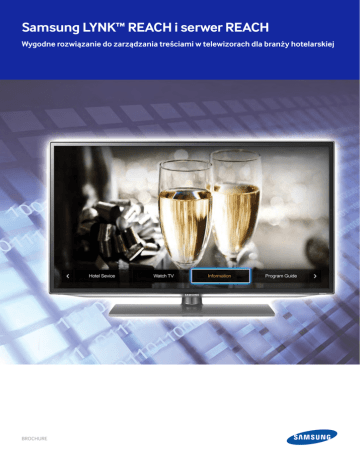 Samsung LYNK™ REACH i serwer REACH Wygodne rozwiązanie do zarządzania treściami w telewizorach dla branży hotelarskiej BROCHURE Łatwiejsze zarządzanie środowiskiem wielu telewizorów dzięki zintegrowanym rozwiązaniom Aktualizacja usług i modyfikacja treści dostępnych w telewizorach z jednej, centralnej lokalizacji • Cyfrowe odbiorniki telewizyjne podwyższają standard każdego hotelu czy ośrodka wypoczynkowego, umożliwiając stworzenie przestronnych i sprzyjających relaksowi wnętrz. Podmioty branży hotelarskiej dążą do podniesienia jakości swoich usług i chcą udostępnić swoim gościom przydatne informacje czy przyjazny w obsłudze elektroniczny przewodnik telewizyjny wprost na ekranie hotelowego telewizora. Jednocześnie pracownicy hotelu potrzebują skutecznych rozwiązań w zakresie zarządzania grupami odbiorników telewizyjnych oraz wyświetlanymi na nich treściami bez konieczności aktualizacji lub konfiguracji każdego urządzenia osobno. • Rozwiązanie LYNK™ REACH opracowano specjalnie dla branży hotelarskiej, aby pomóc obniżyć koszty zarządzania infrastrukturą telewizorów hotelowych. LYNK REACH™ oferuje przedsiębiorstwom hotelarskim następujące korzyści: • Najczęściej administratorzy obiektów angażują pracowników, którzy dokonują aktualizacji systemu, zmian w ustawieniach oraz innych prac konserwacyjnych indywidualnie w każdym pokoju hotelowym. Ręczna aktualizacja każdego telewizora na terenie hotelu pochłania czas i pieniądze, a także wymaga dodatkowego sprzętu, co generuje wysokie koszty obsługi hotelowych cyfrowych odbiorników telewizyjnych. • • • Proces ten można usprawnić dzięki rozwiązaniu Samsung LYNK™ REACH (Remote Enhanced Active Control for Hospitality). Jest to narządzie do zdalnej obsługi cyfrowych odbiorników telewizyjnych, które pozwala lepiej zarządzać treściami dostępnymi w poszczególnych pokojach. Składa się ono z dwóch zintegrowanych elementów – programowego i sprzętowego, które można dostosować do indywidualnych potrzeb danego obiektu: Samsung LYNKTM REACH >Oprogramowanie LYNK™ REACH. Niezwykle proste w obsłudze oprogramowanie, dostarczane wraz z serwerem REACH. Pomaga przedsiębiorstwom hotelowym zarządzać treściami i udostępniać je na telewizorach w pokojach gości. Serwer REACH. Serwer REACH, wyposażony w pilota zdalnego sterowania, umożliwia aktualizację i zmianę ustawień cyfrowych odbiorników telewizyjnych za pośrednictwem fal radiowych (sygnału RF). Zamiast czasochłonnej, ręcznej konfiguracji telewizorów w każdym pokoju oddzielnie, odbiorniki można obsługiwać zdalnie z jednego miejsca, co pozwala ograniczyć nakłady pracy. Goście zyskują szybki dostęp do różnorodnych treści za pomocą intuicyjnego interfejsu obsługi. Automatyczne przekazywanie informacji w formie komunikatów na pasku u dołu ekranu. Obniżenie całkowitego kosztu posiadania (TCO) poprzez ograniczenie nakładów na dodatkowe wyposażenie i obsługę. Aktualizacja i dostosowywanie interfejsu obsługi odbiorników odbywa się zdalnie z jednej, centralnej lokalizacji. REACH Server >Pomieszczenie zdalnej obsługi Hospitality display >Pokój gościnny Logo REACH Server Rys. 1. Pracownicy hotelu mogą modyfikować interfejs obsługi i treści oraz zarządzać nimi zdalnie za pomocą oprogramowaniu LYNK™ REACH i serwera REACH. BROCHURE 2 Oszczędność pracy koniecznej przy ręcznej aktualizacji telewizorów w każdym pokoju osobno Jednoczesne zarządzanie wieloma telewizorami z centralnej lokalizacji za pośrednictwem serwera REACH Klonowanie USB Serwer REACH Pokój 1 Zazwyczaj, aby przeprowadzić aktualizację oprogramowania sprzętowego telewizorów lub wprowadzić zmiany w ich ustawieniach, jak np. przypisywanie numerów kanałów, administracja hotelu musi zaangażować pracowników do pracy na terenie całego obiektu. Pracownicy dokonują odpowiednich aktualizacji indywidualnie dla każdego pokoju, wykorzystując do tego sklonowane pamięci USB. Pokój 2 Pokój 3 Pokój 1 Instalator hotelowy Pokój 2 Serwer REACH Pokój 3 Rys. 3. Zastępując ręczny proces aktualizacji odbiorników w każdym pokoju oddzielnie serwerem REACH, można ograniczyć ilość potrzebnych pracowników i czas ich pracy. LYNK™ REACH zaprojektowano tak, aby administracja i obsługa techniczna mogła zarządzać wieloma telewizorami z centralnej lokalizacji. Serwer REACH dokonuje aktualizacji oprogramowania sprzętowego oraz zmian w ustawieniach poszczególnych odbiorników za pośrednictwem fal radiowych (sygnału RF). Możliwość zdalnej aktualizacji za pomocą serwera REACH pozwala wyeliminować ograniczenia i niedogodności związane z obsługą cyfrowych odbiorników hotelowych i zyskać więcej czasu na obsługę gości. RF Przewód koncentryczny Możliwość aktualizacji lub konfiguracji wielu telewizorów jednocześnie, w tym instalacji oprogramowania sprzętowego, przypisywania numerów kanałów oraz zmiany ustawień. Rys. 2. Powyższy schemat pokazuje, w jaki sposób serwer REACH upraszcza zarządzanie grupą telewizorów. BROCHURE 3 Szybki dostęp do treści dzięki intuicyjnemu interfejsowi obsługi Dostęp do treści stanie się szybszy dzięki łatwemu w obsłudze interfejsowi użytkownika Możliwość kreowania wizerunku hotelu Oprogramowanie LYNK™ REACH ułatwia proces modyfikowania i wdrażania szablonów graficznych w telewizorach, pomagając dostosować je do wizerunku marki, lokalizacji hotelu, oferowanych udogodnień oraz profilowi gości. Po ustawieniu szaty graficznej i dostępnych treści, menu wyświetlane jest w sposób półprzezroczysty na tle indywidualnie dobranego zdjęcia lub grafiki. Interfejs użytkownika może obejmować powitania, informacje dotyczące aktualnych wydarzeń w hotelu lub poza nim czy dań polecanych w hotelowej restauracji oraz wiele innych. Oprogramowanie LYNK™ REACH wyposażone jest w intuicyjny interfejs użytkownika zarówno dl