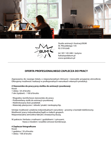 Studio animacji i ilustracji BUM Al. Piłsudskiego 135 92-318 Łódź tel. 501 145 448 / Justyna [email protected] www.spolabum.pl OFERTA PROFESJONALNEGO ZAPLECZA DO PRACY Zapraszamy do naszego lokalu o niepowtarzalnym klimacie i niezwykle przyjaznej atmosferze. Oferujemy możliwość realizacji w profesjonalnych warunkach własnych produkcji. # Stanowisko do pracy przy stoliku do animacji rysunkowej: Koszt: 1 doba / 25 zł brutto 7 dni (tydzień) / 100 zł brutto - Wygodne, komfortowe stanowisko do pracy - Podświetlany stolik do animacji rysunkowej - Nielimitowana ilość przebitek - Materiały plastyczne / ołówki/ pisaki/ cienkopisy/itp. Istnieje możliwość ustalenia indywidualnych warunków - prosimy o kontakt telefoniczny. Możliwość pracy indywidualnej bądź w małych grupach. Niepowtarzalna atmosfera fabryki z kreatywną duszą. W pakiecie: Herbata z malinami / goździkami / cytrusami. Kawa z miodem i wszelkie zimowe kombinacje. # Zaplecze fotograficzne Koszt: 1 godzina / 35 zł brutto 1 doba / 100 zł brutto W pakiecie podstawowym: - System zawieszeń i tła /białe/szare/czarne/niebieskie/ - Lampy stałe - Lampy byskowe - Blendy - Parasolki - Statyw - Stolik do fotografii produktowej - Akcesoria techniczne: przedłużacze/ klipsy/ taśmy montażowe itp. - Wygodne zaplecze na przerwę kawową - Przestrzeń na garderobę Dodatkowo możliwość wynajęcia: - Aparatu Canon EOS 5D Mark II - Profesjonalnych obiektywów stałoogniskowych: 24 mm / 54 mm / 35 mm - Lamp filmowych i fotograficznych na zamówienie Oferujemy również wyjątkową możliwość wynajęcia WSPARCIA TECHNICZNEGO w realizacji całych planów zdjęciowych, bądź też na określone zadania. Wsparcia udziela doświadczony fotograf z wieloletnim stażem pracy i wykształceniem kierunkowym. W ramach tych usług oferujemy pomoc w oświetleniu planu, realizacji zdjęć, obróbki materiału. Koszt takiej usługi: godzina / 50 zł brutto doba / 150 zł brutto Zapraszamy do kontaktu! Jesteśmy miejscem otwartym na nietypowe, wymagające realizacje i indywidualne potrzeby twórców. Do zobaczenia w Studio BUM w WI-MA.