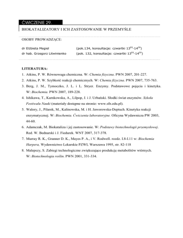 ĆWICZENIE 29. BIOKATALIZATORY I ICH ZASTOSOWANIE W PRZEMYŚLE OSOBY PROWADZĄCE: dr Elżbieta Megiel (pok.134, konsultacje: czwartki 1300-1400) dr hab. Grzegorz Litwinienko (pok. 132, konsultacje: czwartki 1300-1400) LITERATURA: 1. Atkins, P. W. Równowaga chemiczna. W: Chemia fizyczna. PWN 2007, 201-227. 2. Atkins, P. W. Szybkość reakcji chemicznych. W: Chemia fizyczna. PWN 2007, 735-763. 3. Berg, J. M., Tymoczko, J. L. i L. Stryer. Enzymy. Podstawowe pojęcia i kinetyka. W: Biochemia. PWN 2007, 189-228. 4. Ishikawa, T., Karnkowska, A., Lilpop, J. i J. Urbański. Słodki świat enzymów. Szkoła Festiwalu Nauki (materiały dostępne na stronie: www.sfn.edu.pl). 5. Walory, J., Pilarek, M., Kalinowska, M. i H. Jaworowska-Deptuch. Kinetyka reakcji enzymatycznej. W: Biochemia. Ćwiczenia laboratoryjne. Oficyna Wydawnicza PW 2003, 44-60. 6. Adamczak, M. Biokataliza i jej zastosowanie. W: Podstawy biotechnologii przemysłowej. Red. W. Bednarski i J. Fiedurek. WNT 2007, 317-378. 7. Murray R. K., Granner D. K., Mayes P. A., i V. Rodwell. rozdz. I.8-I.11 w: Biochemia Harpera, Wydawnictwo Lekarskie PZWL Warszawa 1995, str. 82-118 8. Malepszy, S. Zabiegi technologiczne zwiększające produkcję metabolitów wtórnych. W: Biotechnologia roślin. PWN 2001, 331-334. Wymagania do ćwiczeń: 1. Definicje: szybkość / rzędowość / cząsteczkowość / stała równowagi reakcji chemicznej, równanie Arrheniusa, reguła van’t Hoffa, energia aktywacji, kataliza homogeniczna i heterogeniczna (przykłady), opis oddziaływań katalizatora z substratem, biokataliza, biokatalizator, enzym, rybozym, kofaktor, enzymy allosteryczne, teoria kompleksu aktywnego. 2. Właściwości enzymów / biokatalizatorów: aktywność, wydajność syntezy produktu, liczba obrotów enzymu, selektywność substratowa i typu reakcji. 3. Mechanizm działania enzymów: modele opisujące działanie enzymów, klasyfikacja enzymów. 4. Kinetyka Michaelisa-Menten – założenia i wyprowadzenie równania, sens fizyczny stałych obecnych w równaniu, możliwe uproszczenia, sposób wyznaczania parametrów charakteryzujących enzym. 5. Regulacja reakcji enzymatycznych: inhibicja kompetytywna i niekompetytywna, wpływ parametrów intensywnych na szybkość reakcji enzymatycznej. 6. Techniki instrumentalnej analizy ilościowej (spektroskopia UV-Vis, prawo LambertaBeera, sporządzanie krzywej wzorcowej, przeliczanie stężeń). 7. Dodatkowo studenci są proszeni o wybranie dowolnego enzymu i samodzielne (pisemne!) opracowanie jego charakterystyki w oparciu o dostępne bazy literaturowe. Opracowanie to powinno obejmować – numer wg klasyfikacji E.C., typ katalizowanej reakcji, znaczenie katalizowanego procesu w organizmie, struktura centrum aktywnego (wraz z kofaktorem, jeżeli występuje), ewentualne inhibitory i mechanizm ich działania. Postuluje się, żeby studenci z jednej grupy wybierali różne enzymy do scharakteryzowania. 2 Poniższy wstęp zakłada znajomość podstawowych definicji i pojęć kinetyki chemicznej, z którymi student zapoznał się podczas kursu chemii fizycznej. Ponadto, studenci są proszeni o zapoznanie się z materiałem dotyczącym enzymów prezentowanym na wykładzie Elementy Biotechnologii (Wykłady nr 3-5). autorzy części teoretycznej: Katarzyna Jodko, Grzegorz Litwinienko I. BIOKATALIZA Procesy biochemiczne, przebiegające w organizmach żywych, są kontrolowane przez biokatalizatory – naturalnie występujące cząsteczki przyspieszające bądź hamujące przebieg reakcji, do których zaliczamy enzymy, hormony i witaminy (często pełniące funkcję koenzymów). W analogii do procesów przebiegających in vivo, podejmowane są próby przemysłowego wykorzystania materiału biologicznego do wydajnego prowadzenia reakcji chemicznych. Zabieg taki określa się mianem biokatalizy, a zachodzącą pod wpływem materiału biologicznego reakcję – biotransformacją lub biokonwersją. Rolę biokatalizatora w procesach przemysłowych mogą pełnić całe komórki (w formie zawiesiny lub immobilizowane), ekstrakt komórkowy lub enzymy o różnym stopniu oczyszczenia, wolne lub immobilizowane. Zastosowanie hormonów (zaliczanych do naturalnych biokatalizatorów) do przemysłowego prowadzenia reakcji chemicznych nie jest możliwe, gdyż regulują one procesy zachodzące w komórce tylko za pośrednictwem specyficznych receptorów, obecnych we wnętrzu komórek lub umieszczonych śródbłonowo. Biokatalizatory stosowane są w przemyśle na coraz większa skalę - obecnie już około 130 procesów z użyciem enzymów lub komórek mikroorganizmów zostało opracowanych dla skali produkcji przewyższającej 100 kg. Enzymy znajdują zastosowanie głównie w przemyśle spożywczym (przemysł piekarniczy, browarnictwo, gorzelnictwo, mleczarstwo, przemysł mięsny), przy produkcji detergentów (biodetergentów), w przemyśle papierniczym oraz w medycynie (w tym w diagnostyce genetycznej). II. ENZYMY Enzymy to związki wielkocząsteczkowe wykazujące właściwości katalityczne, umożliwiające prawidłowe tempo przemian metabolicznych w organizmach żywych i wirusach. Wykazano wpływ enzymów na przebieg wszystkich szlaków anabolicznych 3 i katabolicznych w komórce. Przykładowo, fundamentalna w procesach oddychania komórkowego i oddychania płucnego reakcja: CO2 + H2O H2CO3 (1) przebiega 107 – razy szybciej w obecności enzymu anhydrazy węglanowej. Działanie enzymu umożliwia więc wydajne usunięcie dwutlenku węgla, który powstaje w procesach metabolicznych poprzez rozpuszczenie go we krwi, a następnie uwolnienie go z krwi do wnętrza pęcherzyków płucnych. Śmiało możemy więc powiedzieć, że aktywność katalityczna anhydrazy węglanowej warunkuje efektywną wymianę gazową. II.1. Budowa enzymów II.1.1. Rybozymy jako pozostałość „świata RNA” Niemal wszystkie enzymy są białkami. Jednak w „świecie RNA” (hipotetycznym, wczesnym etapie rozwoju życia na Ziemi) rolę katalizatorów praw