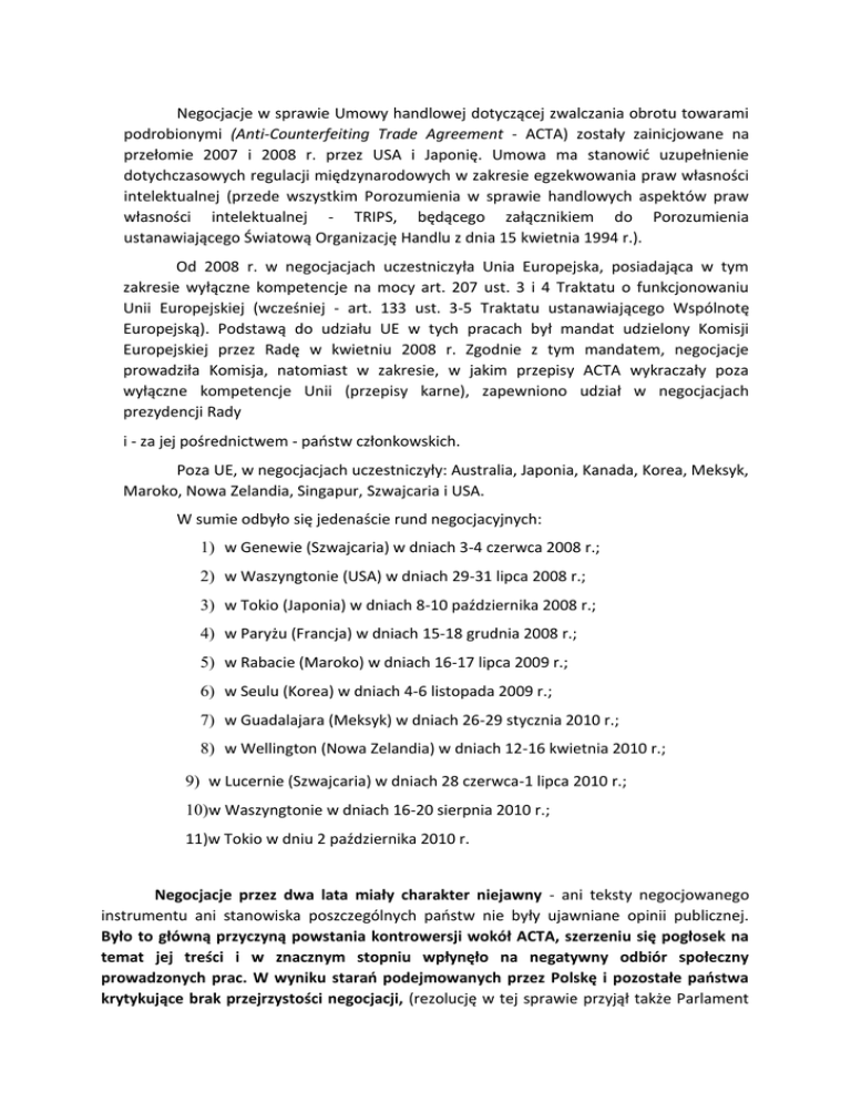 Negocjacje w sprawie Umowy handlowej dotyczącej zwalczania obrotu towarami podrobionymi (Anti-Counterfeiting Trade Agreement - ACTA) zostały zainicjowane na przełomie 2007 i 2008 r. przez USA i Japonię. Umowa ma stanowić uzupełnienie dotychczasowych regulacji międzynarodowych w zakresie egzekwowania praw własności intelektualnej (przede wszystkim Porozumienia w sprawie handlowych aspektów praw własności intelektualnej - TRIPS, będącego załącznikiem do Porozumienia ustanawiającego Światową Organizację Handlu z dnia 15 kwietnia 1994 r.). Od 2008 r. w negocjacjach uczestniczyła Unia Europejska, posiadająca w tym zakresie wyłączne kompetencje na mocy art. 207 ust. 3 i 4 Traktatu o funkcjonowaniu Unii Europejskiej (wcześniej - art. 133 ust. 3-5 Traktatu ustanawiającego Wspólnotę Europejską). Podstawą do udziału UE w tych pracach był mandat udzielony Komisji Europejskiej przez Radę w kwietniu 2008 r. Zgodnie z tym mandatem, negocjacje prowadziła Komisja, natomiast w zakresie, w jakim przepisy ACTA wykraczały poza wyłączne kompetencje Unii (przepisy karne), zapewniono udział w negocjacjach prezydencji Rady i - za jej pośrednictwem - państw członkowskich. Poza UE, w negocjacjach uczestniczyły: Australia, Japonia, Kanada, Korea, Meksyk, Maroko, Nowa Zelandia, Singapur, Szwajcaria i USA. W sumie odbyło się jedenaście rund negocjacyjnych: 1) w Genewie (Szwajcaria) w dniach 3-4 czerwca 2008 r.; 2) w Waszyngtonie (USA) w dniach 29-31 lipca 2008 r.; 3) w Tokio (Japonia) w dniach 8-10 października 2008 r.; 4) w Paryżu (Francja) w dniach 15-18 grudnia 2008 r.; 5) w Rabacie (Maroko) w dniach 16-17 lipca 2009 r.; 6) w Seulu (Korea) w dniach 4-6 listopada 2009 r.; 7) w Guadalajara (Meksyk) w dniach 26-29 stycznia 2010 r.; 8) w Wellington (Nowa Zelandia) w dniach 12-16 kwietnia 2010 r.; 9) w Lucernie (Szwajcaria) w dniach 28 czerwca-1 lipca 2010 r.; 10)w Waszyngtonie w dniach 16-20 sierpnia 2010 r.; 11)w Tokio w dniu 2 października 2010 r. Negocjacje przez dwa lata miały charakter niejawny - ani teksty negocjowanego instrumentu ani stanowiska poszczególnych państw nie były ujawniane opinii publicznej. Było to główną przyczyną powstania kontrowersji wokół ACTA, szerzeniu się pogłosek na temat jej treści i w znacznym stopniu wpłynęło na negatywny odbiór społeczny prowadzonych prac. W wyniku starań podejmowanych przez Polskę i pozostałe państwa krytykujące brak przejrzystości negocjacji, (rezolucję w tej sprawie przyjął także Parlament Europejski), podczas rundy w Nowej Zelandii (kwiecień 2010 r.) podjęto decyzję o ujawnieniu tekstu negocjowanej umowy. Tekst umowy został ostatecznie uzgodniony w listopadzie 2010 r., a rezultat końcowy spotkał się z pozytywną oceną zarówno europejskich właścicieli praw własności intelektualnej jak i Parlamentu Europejskiego. W rezolucji z 24 listopada 2010 r. Parlament wyraził pogląd, zgodnie z którym, wobec globalnego charakteru naruszeń praw, wielostronna umowa wydaje się być najlepszym sposobem rozwiązania konkretnych problemów na szczeblu międzynarodowym. Przedstawiciele Rządu RP brali udział tylko w jednej rundzie negocjacyjnej (w Lucernie). Z uwagi na wyłączne kompetencje UE w zakresie polityki handlowej oraz przyjęty mandat negocjacyjny, udział państw członkowskich był ograniczony do roli obserwatorów. Przed każdą sesją negocjacyjną stanowisko UE było uzgadniane na spotkaniach kilku różnych formacji roboczych Rady, przede wszystkim Komitetu ds. Polityki Handlowej (poprzednio Komitetu 133), Grupy Roboczej ds. Własności Intelektualnej oraz Grupy Przyjaciół Prezydencji, a w zakresie przepisów karnych - dodatkowo zatwierdzane przez COREPER II. Stanowisko rządu RP odnośnie Porozumienia ACTA, przygotowywane w szerokim porozumieniu MSZ, MKiDN we współpracy z Ministerstwem Finansów, Ministerstwem Gospodarki, Ministerstwem Sprawiedliwości, Stałym Przedstawicielstwem RP przy UE w Brukseli oraz Urzędem Patentowym RP, było wyrażane w instrukcjach dla przedstawicieli Polski, uczestniczących w posiedzeniach tych formacji. Polska od początku negocjacji wyrażała poparcie dla prac nad umową w trybie jawnym. Skuteczna ochrona praw własności intelektualnej, ochrona rynku przed podróbkami, a także współuczestnictwo w ochronie praw zastrzeżonych w UE. poza Europą stanowi, bowiem dla polskiego Rządu ważny element polityki państwa. Przedstawiciele Polski brali udział, w rozmaitych gremiach, w dyskusji nad stanowiskiem UE zarówno w kwestiach przepisów karnych ACTA, jak i również jawności procesu negocjacji. Podczas tych prac wyrażano opinię, iż stanowisko UE odnośnie przepisów karnych dotyczących ścigania praw własności intelektualnej powinno być wypracowywane szczególnie ostrożnie, biorąc pod uwagę brak unijnej harmonizacji w tym zakresie. Dlatego właściwym podejściem było ograniczenie przepisów karnych w ACTA do naruszeń prawa autorskiego i praw pokrewnych oraz praw z rejestracji znaków towarowych. Zakres tych regulacji nie powinien bowiem wykraczać ponad przepisy Porozumienia TRIPS. Ponadto, przedstawiciele Polski przy wielu okazjach podczas dyskusji nad stanowiskiem UE opowiadali się za jak największą przejrzystością prac dotyczących ACTA i zapewnieniem jawności dokumentów negocjacyjnych. Polska była jednym z inicjatorów wystąpienia skierowanego do Komisji Europejskiej oraz pozostałych stron negocjacji, wzywającego do ujawnienia tekstu ACTA będącego przedmiotem prac. W rezultacie tekst ten - jak wspomniano wyżej - został podany do publicznej wiadomości po zakończeniu rundy negocjacyjnej w Nowej Zelandii. • 25 listopada 2009 r. - Ministerstwo Kultury i Dziedzictwa Narodowego RP, w porozumieniu z MSZ, przygotowało Instrukcję dla przedstawiciela Polski na posiedzenie Grupy Roboczej ds. Własności Intelektualnej w dniu 27 listopada 2009 r. w Brukseli w brzmieniu: delegacja wyrazi niezadowolenie, i