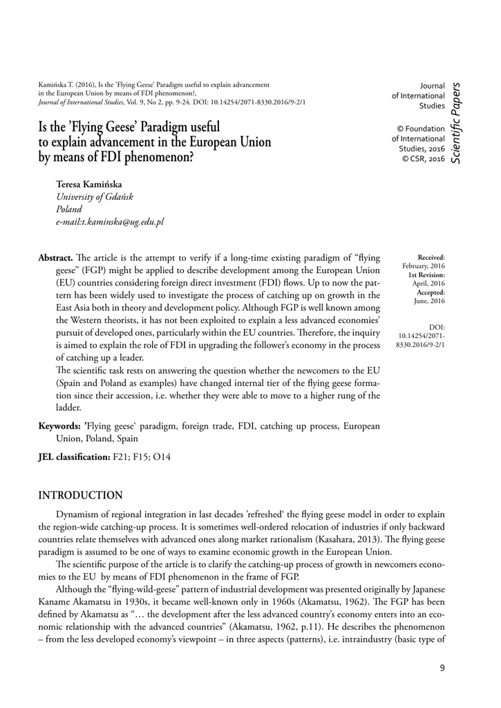 Journal of International Studies Is the ’Flying Geese’ Paradigm useful to explain advancement in the European Union by means of FDI phenomenon? © Foundation of International Studies, 2016 © CSR, 2016 Teresa Kamińska University of Gdańsk Poland e-mail:[email protected] Abstract. The article is the attempt to verify if a long-time existing paradigm of “flying geese” (FGP) might be applied to describe development among the European Union (EU) countries considering foreign direct investment (FDI) flows. Up to now the pattern has been widely used to investigate the process of catching up on growth in the East Asia both in theory and development policy. Although FGP is well known among the Western theorists, it has not been exploited to explain a less advanced economies’ pursuit of developed ones, particularly within the EU countries. Therefore, the inquiry is aimed to explain the role of FDI in upgrading the follower’s economy in the process of catching up a leader. The scientific task rests on answering the question whether the newcomers to the EU (Spain and Poland as examples) have changed internal tier of the flying geese formation since their accession, i.e. whether they were able to move to a higher rung of the ladder. Received: February, 2016 1st Revision: April, 2016 Accepted: June, 2016 DOI: 10.14254/20718330.2016/9-2/1 Keywords: ’Flying geese‘ paradigm, foreign trade, FDI, catching up process, European Union, Poland, Spain JEL classification: F21; F15; O14 INTRODUCTION Dynamism of regional integration in last decades ’refreshed‘ the flying geese model in order to explain the region-wide catching-up process. It is sometimes well-ordered relocation of industries if only backward countries relate themselves with advanced ones along market rationalism (Kasahara, 2013). The flying geese paradigm is assumed to be one of ways to examine economic growth in the European Union. The scientific purpose of the article is to clarify the catching-up process of growth in newcomers economies to the EU by means of FDI phenomenon in the frame of FGP. Although the “flying-wild-geese” pattern of industrial development was presented originally by Japanese Kaname Akamatsu in 1930s, it became well-known only in 1960s (Akamatsu, 1962). The FGP has been defined by Akamatsu as “… the development after the less advanced country’s economy enters into an economic relationship with the advanced countries” (Akamatsu, 1962, p.11). He describes the phenomenon – from the less developed economy’s viewpoint – in three aspects (patterns), i.e. intraindustry (basic type of 9 Scientific Papers Kamińska T. (2016), Is the ’Flying Geese’ Paradigm useful to explain advancement in the European Union by means of FDI phenomenon?, Journal of International Studies, Vol. 9, No 2, pp. 9-24. DOI: 10.14254/2071-8330.2016/9-2/1 Journal of International Studies Vol. 9, No.2, 2016 FGP), leading to the interindustry in a particular country, and effects of combining industrialization in economically interdependent countries creates the international one. The first pattern of flying geese formation is a sequence of imports (M) -> domestic production (P) -> exports (X). In the graphic presentation there are three time-series curves for a particular industry with the time dimension on the horizontal axis. The curve that is the closest to the origin of the set of coordinates represents imports of the product group, then appears domestic production curve, and the third one presents its exports. The vertical axis denotes value of imports, production and exports, respectively (Akamatsu, 1962). They create the import-production-export sequence, and they all rise and fall resembling an inverted U or V-shaped formation. In nutshell, three curves together characterize the level of competitiveness of the relevant industry in a given country. The pattern displays how to substitute imports (IS) by promoting exports (EP). The second pattern expresses a sequence of product and industrial development from the obsolete industry through mature one up to the modern industries that are drivers (engines) of growth. It reflects the process of structural upgrading. The third pattern presents a hierarchy of economies at different stages of advancement (Akamatsu, 1962). Although in times of Akamatsu foreign direct investment was not seen as meaningful factor of economic growth, he appreciated the significance of foreign impact of technology and knowledge for economic development that help emerge domestic production. It should also be added that original version of the model does not take regional integration process into consideration, either. THE THEORETICAL EVOLUTION OF THE ‘FLYING GEESE’ MODEL The mechanism, that dominates today’s discourse, relies on the subsequent relocation of industries from advanced to developing countries during the latters’ catching-up process. It was also regarded as the economic theory of an essential Japan’s economic assistance to developing countries (Okuda, 2002). The major driver in the model is the technological development due to increasing labour costs that makes the “leader’s imperative for internal restructuring” (Kasahara, 2004, p. 10) as its own income rise and it moves into newer, more capital-intense, technologies. This is the process by which technology and know-how become obsolete and are passed down the chain of latecomers’ economies. In academic discourse it is often underlined that Akamatsu’s flying geese model does not rest on changes in relative competitiveness due to different resources but it is the result of ‘demand linkages‘ and ’complementarities’ of various products. Seen from the perspective of international aspect of FGP, national policies may speed up the advancement, and even change the initial sequence of countries in the flying geese order. Some scholars claim (e.g. Korhonen, 1994) that FGP was the precursor of the product cycle the