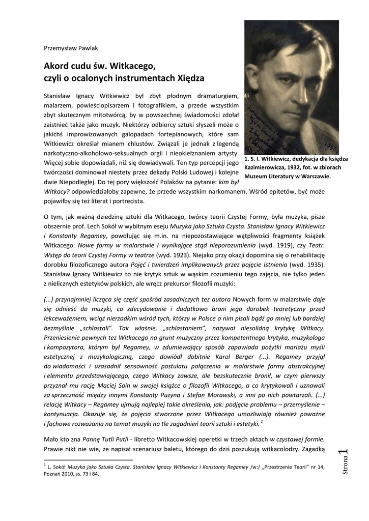 Przemysław Pawlak Akord cudu św. Witkacego, czyli o ocalonych instrumentach Xiędza Stanisław Ignacy Witkiewicz był zbyt płodnym dramaturgiem, malarzem, powieściopisarzem i fotografikiem, a przede wszystkim zbyt skutecznym mitotwórcą, by w powszechnej świadomości zdołał zaistnied także jako muzyk. Niektórzy odbiorcy sztuki słyszeli może o jakichś improwizowanych galopadach fortepianowych, które sam Witkiewicz określał mianem chlustów. Związali je jednak z legendą narkotyczno-alkoholowo-seksualnych orgii i nieokiełznaniem artysty. 1. S. I. Witkiewicz, dedykacja dla księdza Więcej sobie dopowiadali, niż się dowiadywali. Ten typ percepcji jego Kazimierowicza, 1932, fot. w zbiorach twórczości dominował niestety przez dekady Polski Ludowej i kolejne Muzeum Literatury w Warszawie. dwie Niepodległej. Do tej pory większośd Polaków na pytanie: kim był Witkacy? odpowiedziałoby zapewne, że przede wszystkim narkomanem. Wśród epitetów, byd może pojawiłby się też literat i portrecista. O tym, jak ważną dziedziną sztuki dla Witkacego, twórcy teorii Czystej Formy, była muzyka, pisze obszernie prof. Lech Sokół w wybitnym eseju Muzyka jako Sztuka Czysta. Stanisław Ignacy Witkiewicz i Konstanty Regamey, powołując się m.in. na niepozostawiające wątpliwości fragmenty książek Witkacego: Nowe formy w malarstwie i wynikające stąd nieporozumienia (wyd. 1919), czy Teatr. Wstęp do teorii Czystej Formy w teatrze (wyd. 1923). Niejako przy okazji dopomina się o rehabilitację dorobku filozoficznego autora Pojęd i twierdzeo implikowanych przez pojęcie Istnienia (wyd. 1935). Stanisław Ignacy Witkiewicz to nie krytyk sztuk w wąskim rozumieniu tego zajęcia, nie tylko jeden z nielicznych estetyków polskich, ale wręcz prekursor filozofii muzyki: 1 L. Sokół Muzyka jako Sztuka Czysta. Stanisław Ignacy Witkiewicz i Konstanty Regamey /w:/ „Przestrzenie Teorii” nr 14, Poznao 2010, ss. 73 i 84. Strona Mało kto zna Pannę Tutli Putli - libretto Witkacowskiej operetki w trzech aktach w czystawej formie. Prawie nikt nie wie, że napisał scenariusz baletu, którego do dziś poszukują witkacolodzy. Zagadką 1 (...) przynajmniej licząca się częśd spośród zasadniczych tez autora Nowych form w malarstwie daje się odnieśd do muzyki, co zdecydowanie i dodatkowo broni jego dorobek teoretyczny przed lekceważeniem, wciąż nierzadkim wśród tych, którzy w Polsce o nim pisali bądź go mniej lub bardziej bezmyślnie „schlastali”. Tak właśnie, „schlastaniem”, nazywał niesolidną krytykę Witkacy. Przeniesienie pewnych tez Witkacego na grunt muzyczny przez kompetentnego krytyka, muzykologa i kompozytora, którym był Regamey, w zdumiewający sposób zapowiada pożytki mariażu myśli estetycznej z muzykologiczną, czego dowiódł dobitnie Karol Berger (...). Regamey przyjął do wiadomości i uzasadnił sensownośd postulatu połączenia w malarstwie formy abstrakcyjnej i elementu przedstawiającego, czego Witkacy zawsze, ale bezskutecznie bronił, w czym pierwszy przyznał mu rację Maciej Soin w swojej książce o filozofii Witkacego, a co krytykowali i uznawali za sprzecznośd między innymi Konstanty Puzyna i Stefan Morawski, a inni po nich powtarzali. (...) relację Witkacy – Regamey ujmują najlepiej takie określenia, jak: podjęcie problemu – przemyślenie – kontynuacja. Okazuje się, że pojęcia stworzone przez Witkacego umożliwiają również poważne i fachowe rozważania na temat muzyki na tle zagadnieo teorii sztuki i estetyki. 1 pozostają jego szkice muzyczne przekazane Bibliotece Kórnickiej przez Stefana Raczyoskiego, szczególnie Jeden z tematów baliwernii, która pewno nigdy napisana nie będzie, opus trzynaste, w tempie maestoso.2 A mały Staś praktycznie nie miał wyjścia – musiał odziedziczyd lub nabyd słuch oraz wrażliwośd muzyczną i chodby w stopniu podstawowym opanowad grę na co najmniej jednym instrumencie. Szkołę muzyczną miał w rodzinnym domu. Jego matka, Maria z Pietrzkiewiczów Witkiewiczowa, chod przydmiona talentem, osobowością i zakopiaoskim kultem jej męża, Stanisława Witkiewicza, to przecież postad nietuzinkowa. Wywarła ogromny wpływ na życie i twórczośd syna, pozostając z nim – w przeciwieostwie do swojego męża – w bardzo bliskiej, uczuciowej relacji do kooca jej życia. Była absolwentką warszawskiego Instytutu Muzycznego3, założonego w 1861 i kierowanego do 1879 r. przez skrzypka Apolinarego Kątskiego, ucznia samego Paganiniego. Gdyby matka Witkacego zerwała kontakt z muzyką po ukooczeniu konserwatorium, syn mógłby nie wiedzied, czym jest harmonia. Witkiewiczowie jednak metodycznie kształtowali Stasia-geniusza. Trudno się było spodziewad, by matka, która po przeniesieniu się rodziny do Zakopanego, została nauczycielką muzyki w „Szkole Pracy Domowej Kobiet” Jadwigi Zamoyskiej w Kuźnicach4, udzielała prywatnych lekcji, prowadziła pierwszy w stolicy polskich Tatr chór, nie wykształciła w synu wrażliwości muzycznej. Gdy Staś miał 9 lat, w Krakowie ukazał się Elementarz muzyczny w opracowaniu jego matki.5 Fotografia umieszczona na okładce przedstawia – jakby mogło byd inaczej – siedmioletniego Stasia. Można się domyślad, że chłopak po prostu musiał dwiczyd. Roman Jasioski wspominał po latach: Witkacy był muzykalny z natury i interesował się nader swoiście pewnymi zagadnieniami muzycznymi. Grał na fortepianie w sposób jedyny w swoim 2. Okładka Elementarza Muzycznego. rodzaju. Ale o tym miałem się jeszcze przekonad, w czasie podróży do Zakopanego rozmawialiśmy bowiem swobodnie o różnych sprawach muzycznych, przy czym zorientowałem się wtedy, że Witkacego pasjonują eksperymenty. Sugerował mi stworzenie orkiestry złożonej z nowych instrumentów, noszących dziwaczne nazwy. Wyobraź sobie – mówił mi patrząc poważnie w oczy – orkiestrę złożoną z gnębitów i pępitów! Był to okres, kiedy napisał t