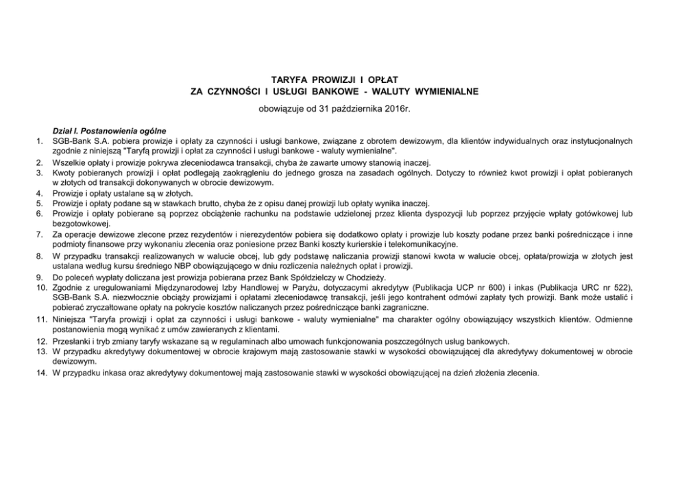 TARYFA PROWIZJI I OPŁAT ZA CZYNNOŚCI I USŁUGI BANKOWE - WALUTY WYMIENIALNE obowiązuje od 31 października 2016r. Dział I. Postanowienia ogólne SGB-Bank S.A. pobiera prowizje i opłaty za czynności i usługi bankowe, związane z obrotem dewizowym, dla klientów indywidualnych oraz instytucjonalnych zgodnie z niniejszą "Taryfą prowizji i opłat za czynności i usługi bankowe - waluty wymienialne". 2. Wszelkie opłaty i prowizje pokrywa zleceniodawca transakcji, chyba że zawarte umowy stanowią inaczej. 3. Kwoty pobieranych prowizji i opłat podlegają zaokrągleniu do jednego grosza na zasadach ogólnych. Dotyczy to również kwot prowizji i opłat pobieranych w złotych od transakcji dokonywanych w obrocie dewizowym. 4. Prowizje i opłaty ustalane są w złotych. 5. Prowizje i opłaty podane są w stawkach brutto, chyba że z opisu danej prowizji lub opłaty wynika inaczej. 6. Prowizje i opłaty pobierane są poprzez obciążenie rachunku na podstawie udzielonej przez klienta dyspozycji lub poprzez przyjęcie wpłaty gotówkowej lub bezgotowkowej. 7. Za operacje dewizowe zlecone przez rezydentów i nierezydentów pobiera się dodatkowo opłaty i prowizje lub koszty podane przez banki pośredniczące i inne podmioty finansowe przy wykonaniu zlecenia oraz poniesione przez Banki koszty kurierskie i telekomunikacyjne. 8. W przypadku transakcji realizowanych w walucie obcej, lub gdy podstawę naliczania prowizji stanowi kwota w walucie obcej, opłata/prowizja w złotych jest ustalana według kursu średniego NBP obowiązującego w dniu rozliczenia należnych opłat i prowizji. 9. Do poleceń wypłaty doliczana jest prowizja pobierana przez Bank Spółdzielczy w Chodzieży. 10. Zgodnie z uregulowaniami Międzynarodowej Izby Handlowej w Paryżu, dotyczacymi akredytyw (Publikacja UCP nr 600) i inkas (Publikacja URC nr 522), SGB-Bank S.A. niezwłocznie obciąży prowizjami i opłatami zleceniodawcę transakcji, jeśli jego kontrahent odmówi zapłaty tych prowizji. Bank może ustalić i pobierać zryczałtowane opłaty na pokrycie kosztów naliczanych przez pośredniczące banki zagraniczne. 1. 11. Niniejsza "Taryfa prowizji i opłat za czynności i usługi bankowe - waluty wymienialne" ma charakter ogólny obowiązujący wszystkich klientów. Odmienne postanowienia mogą wynikać z umów zawieranych z klientami. 12. Przesłanki i tryb zmiany taryfy wskazane są w regulaminach albo umowach funkcjonowania poszczególnych usług bankowych. 13. W przypadku akredytywy dokumentowej w obrocie krajowym mają zastosowanie stawki w wysokości obowiązującej dla akredytywy dokumentowej w obrocie dewizowym. 14. W przypadku inkasa oraz akredytywy dokumentowej mają zastosowanie stawki w wysokości obowiązującej na dzień złożenia zlecenia. Taryfa prowizji i opłat za czynności i usługi bankowe - waluty wymienialne tekst jednolity - obowiązuje od 31 października 2016r. Dział II. Usługi dla klientów indywidualnych WYSZCZEGÓLNIENIE CZYNNOŚCI STAWKA OBOWIĄZUJĄCA Podstawowa Minimalna Maksymalna W przypadku wyliczania prowizji i opłat metodą procentową do przeliczenia równowartości PLN należy stosować kursy średnie NBP z dnia rozliczenia należnych opłat i prowizji. Rozdział 1. Skup i sprzedaż wartości dewizowych 1 bez prowizji Skup i sprzedaż walut obcych Realizacja poleceń wypłaty (przekazów) z zagranicy lub z innych banków w kraju: 2 1) na rachunki bankowe klientów banku i zrzeszonych banków spółdzielczych 2) na rzecz klientów posiadających rachunki w innym banku 3 4 Zwrot niepodjętej kwoty polecenia wypłaty* UWAGA! Jeżeli zwrot niepodjętej kwoty jest wynikiem postępowania wyjaśniającego, to pobiera się tylko jedną opłatę z tytułu określonego w Rozdziale 4 ust. 2. Realizacja poleceń wypłaty (przekazów) za granicę lub do innych banków w kraju - tryb normalny (TOMNEXT)*: bez prowizji - - 0,3% wartości przekazu 20,- 150,- 100,- - - 1) przekazy do 5.000 euro 30,- 2) przekazy przekraczające 5.000 euro 65,- UWAGA ! Nie dolicza się kosztów ryczałtu telekomunikacyjnego. SEPA* - realizacja poleceń wypłaty (przekazów) w obrocie dewizowym nominowanych w EUR, z datą waluty TOMNEXT, spełniających następujące warunki (łącznie): - rachunek beneficjenta znajduje się w jednym z krajów EOG, 5 4,80,- - bezbłędnie wpisany IBAN beneficjenta, - określona opcja kosztowa SHA. 6 7 UWAGA ! Do SEPY nie dolicza się kosztów ryczałtu telekomunikacyjnego. Realizacja poleceń wypłaty (przekazów) za granicę lub do innych banków w kraju w trybie pilnym (OVERNIGHT)*- dodatkowa opłata do ust. 4 i 5 UWAGA ! Polecenia wypłaty mogą być przyjęte do realizacji w trybie pilnym wyłącznie w miarę posiadania przez SGB-Bank S.A. wolnych środków na rachunkach nostro. Odwołanie polecenia wypłaty (przekazów) za granicę lub do innych banków w kraju* 100,- 45,- plus koszty banków pośredniczących Zryczałtowana opłata z tytułu kosztów pobieranych przez banki pośredniczące w wykonywaniu przekazów (OUR)*: 1) przekazy do równowartości 2.500 euro 8 2) przekazy przekraczające równowartość 2.500 euro UWAGA ! Równowartość w euro oblicza się przy zastosowaniu kursów średnich NBP z dnia realizacji przekazu. Opcje kosztowe OUR i BEN dostępne są wyłącznie przy składaniu dyspozycji w formie papierowej. 40,- - - 80,- - - WYSZCZEGÓLNIENIE CZYNNOŚCI 9 Zryczałtowana opłata z tytułu niewłaściwego sformatowania danych przelewu (Non STP)* - opłata pobierana w przypadku podania niepoprawnego IBAN do kraju EOG STAWKA OBOWIĄZUJĄCA Podstawowa Minimalna Maksymalna 40,- - - * Prowizja nie jest pobierana w przypadku, gdy zleceniodawca i beneficjent (w tym samym zleceniu) są klientami SGB-Banku S.A. i/lub banków spółdzielczych należących do grupy SGB. Rozdział 2. Inkaso 1 Inkaso czeków 2 Zwrot czeku niezainkasowanego 3 Przekazanie inkasa do realizacji w innym banku: 0,2% kwoty, na którą opiewa czek 50,- 50,- 1) inkaso czeków na kwotę 