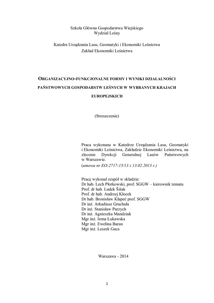 Szkoła Główna Gospodarstwa Wiejskiego Wydział Leśny Katedra Urządzania Lasu, Geomatyki i Ekonomiki Leśnictwa Zakład Ekonomiki Leśnictwa ORGANIZACYJNO-FUNKCJONALNE FORMY I WYNIKI DZIAŁALNOŚCI PAŃSTWOWYCH GOSPODARSTW LEŚNYCH W WYBRANYCH KRAJACH EUROPEJSKICH (Streszczenie) Praca wykonana w Katedrze Urządzania Lasu, Geomatyki i Ekonomiki Leśnictwa, Zakładzie Ekonomiki Leśnictwa, na zlecenie Dyrekcji Generalnej Lasów Państwowych w Warszawie. (umowa nr EO-2717-15/13 z 13.02.2013 r.) Pracę wykonał zespół w składzie: Dr hab. Lech Płotkowski, prof. SGGW – kierownik tematu Prof. dr hab. Ludek Šišak Prof. dr hab. Andrzej Klocek Dr hab. Bronisław Kłapeć prof. SGGW Dr inż. Arkadiusz Gruchała Dr inż. Stanisław Parzych Dr inż. Agnieszka Mandziuk Mgr inż. Irena Łukawska Mgr inż. Ewelina Baran Mgr inż. Leszek Gaca Warszawa - 2014 1 I Tytułem wstępu Powody praktyczne i przesłanki teoretyczne podjęcia tego typu badań wynikają z faktu obarczania państwowego gospodarstwa leśnego funkcjami dochodowymi, co miało miejsce już na przełomie XVII i XVIII wieku. Od tego czasu nieustannie trwa poszukiwanie zorientowanych na „przedsiębiorczość” form organizacyjno-funkcjonalnych państwowego gospodarstwa leśnego. Ostatnią, o najwyższym poziomie odrębności i samodzielności organizacyjnej, ekonomicznej i prawnej, formą państwowego gospodarstwa leśnego jest przedsiębiorstwo. Wyróżniającym kryterium przedsiębiorstwa jest nastawienie na osiąganie zysku. Ukierunkowanie na zysk jest synonimem działalności zarobkowej, ale także przejawem dominacji celów prywatno-gospodarczych w działalności państwowego przedsiębiorstwa leśnego. Najmłodszą natomiast formą państwowych przedsiębiorstw leśnych jest zakład prawa publicznego wprowadzany w życie głównie w Niemczech. II Cel i zakres badań Celem podjętych badań jest ocena przesłanek oraz wyników reform stosowanych form organizacyjno-funkcjonalnych w lasach państwowych wybranych krajów europejskich. Przedmiotem analizy były struktury organizacyjne państwowego gospodarstwa leśnego, zasady funkcjonowania jednostek organizacyjnych, stopień ich samodzielności, organy zarządzające oraz ich kompetencje i obowiązki. Wymienione analizy i oceny będą stanowić podstawę sformułowania zaleceń i wytycznych odnośnie do wprowadzenia mechanizmów stymulujących wzrost przedsiębiorczości w jednostkach organizacyjnych Lasów Państwowych, a także zapewniających realizację zasady równoważenia własnych celów dochodowych z celami publicznymi i ekologicznymi. Podstawowym źródłem informacji o organizacyjno-funkcjonalnych formach państwowych gospodarstw leśnych była literatura oraz materiały źródłowe dokumentujące rozwiązania organizacyjno-prawne regulujące działalność państwowych gospodarstw leśnych w wybranych krajach europejskich, takich jak: Austria, Czechy, Finlandia, Francja, Irlandia, Niemcy (Bawaria), Szwecja i Wielka Brytania. Wymienione kraje reprezentują nie tylko znaczny udział lasów państwowych w ogólnej ich powierzchni, lecz także wszystkie podstawowe formy organizacyjno-funkcjonalne państwowej gospodarki leśnej. Uzyskanie odpowiednich informacji w zakresie badanego zagadnienia wymagało także konsultacji z organami zarządzającymi państwowym gospodarstwem leśnym w poszczególnych krajach 2 oraz niektórymi jednostkami badawczymi (instytuty, wydziały leśne) oraz krótkie wizyty w wybranych jednostkach organizacyjnych (przedsiębiorstwach, gospodarstwach, centrach, itp.). Badania w odniesieniu do każdego z wymienionych krajów prowadzono według następującego planu: 1. Charakterystyka uwarunkowań przyrodniczych, ekonomicznych i społecznych prowadzenia państwowej gospodarki leśnej; 2. Podstawowe regulacje prawne z zakresu polityki leśnej państwa oraz zasad i zadań gospodarki leśnej; 3. Formy własności i rozwiązania organizacyjno-prawne dotyczące jednostek państwowego gospodarstwa leśnego; 4. Zasady funkcjonowania jednostek organizacyjnych państwowego gospodarstwa leśnego; 5. Charakterystyka działalności państwowego gospodarstwa leśnego w poszczególnych krajach: a. działalność produkcyjna, w tym zwłaszcza wartość i struktura produkcji; b. działalność usługowa łącznie z świadczeniami o charakterze dóbr publicznych oraz na rzecz społeczności lokalnych; c. działalność w zakresie pełnienia funkcji władczych przynależnych administracji państwowej: doradztwo i pomoc lasom innych form własności, zarządzanie środkami publicznymi, nadzór nad lasami niepaństwowymi, edukacja przyrodniczo-leśna, itp.; 6. Formy realizacji zadań gospodarczo-leśnych w sferze zagospodarowania, ochrony i użytkowania lasu oraz marketingu, zasad sprzedaży drewna i innych produktów leśnych; 7. Sytuacja majątkowa państwowego gospodarstwa leśnego: a. majątek, b. kapitał trwały i obrotowy, 8. Poziom i struktura zatrudnienia w państwowym gospodarstwie leśnym; 9. Wartość i struktura przychodów państwowego gospodarstwa leśnego; 10. Koszty działalności państwowego gospodarstwa leśnego; 11. Wyniki ekonomiczne i finansowe oraz ich obciążenia (podatki, opłaty, daniny, itp.). 3 III Wyniki badań Tradycyjnie państwową administrację leśną powołuje się w celu pełnienia dwóch ważnych funkcji, tj.: 1) państwowego przedsiębiorstwa (przedsiębiorcy) leśnego, co pociąga za sobą konieczność zajmowania się całokształtem spraw i problemów związanych z prowadzeniem gospodarki leśnej (biznesu leśnego) w lasach państwowych, a niekiedy także i w innych kategoriach lasów publicznych, np. w lasach komunalnych; 2) władzy leśnej. Zazwyczaj państwowa administracja leśna pełni obydwie wymienione funkcje jednocześnie. W wielu krajach, np. w Szwecji i Wielkiej Brytanii te dwa obszary funkcji zostały rozdzielone pomiędzy różne organizacje i instytucje i taki trend obserwuje się ostatnio coraz częście