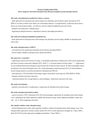 WYKAZ DOKUMENTÓW, które mogą być dowodem ubezpieczenia dla poszczególnych grup ubezpieczonych dla osoby zatrudnionej na podstawie umowy o pracę: - druk zgłoszenia do ubezpieczenia zdrowotnego oraz aktualnie potwierdzony raport miesięczny ZUS RMUA (wystarczy dolna część druku, nie zawierająca danych o wynagrodzeniu), wydawany przez pracodawcę na wniosek pracownika - nie dotyczy osób na urlopie bezpłatnym powyżej 30 dni, - aktualne zaświadczenie z zakładu pracy, - legitymacja ubezpieczeniowa z aktualnym wpisem i pieczątką pracodawcy; dla osoby prowadzącej działalność gospodarczą: - druk zgłoszenia do ubezpieczenia zdrowotnego oraz aktualny dowód wpłaty składki na ubezpieczenie zdrowotne; dla osoby ubezpieczonej w KRUS: - zaświadczenie lub legitymacja aktualnie potwierdzona pieczątką KRUS, - dowód wpłaty składki na ubezpieczenie społeczne KRUS; dla emerytów i rencistów: - legitymacja emeryta lub rencisty (Uwaga: w przypadku legitymacji wydanej przez ZUS numer legitymacji powinien zawierać oznaczenie oddziału NFZ. Jeżeli 3. i 4. pozycja numeru zawiera znaki "- -", legitymacja nie jest dokumentem potwierdzającym uprawnienia do świadczeń zdrowotnych. W takim przypadku należy przedstawić inny dowód ubezpieczenia. Np. osoba pobierająca rentę/emeryturę ZUS, ale zamieszkała na terenie innego państwa, powinna przedstawić aktualną kartę EKUZ), - zaświadczenie z ZUS lub KRUS lub innego organu emerytalno-rentowego np. ZER MSWiA, WBA, - aktualny odcinek emerytury lub renty, - odcinek przekazu lub wyciąg bankowy, potwierdzający pobieranie emerytury lub renty; dla osoby bezrobotnej: - aktualne zaświadczenie z urzędu pracy o zgłoszeniu do ubezpieczenia zdrowotnego; dla osoby ubezpieczonej dobrowolnie: - umowa zawarta z NFZ i dokument ZUS ZZA potwierdzający zgłoszenie do ubezpieczenia zdrowotnego wraz z aktualnym dowodem opłacenia składki zdrowotnej (uwaga: termin opłacenia składki za dany miesiąc – do 15. dnia następnego miesiąca); dla członka rodziny osoby ubezpieczonej: - dowód ubezpieczenia osoby, która zgłosiła członków rodziny do ubezpieczenia zdrowotnego wraz z kserokopią druku zgłoszenia członka rodziny (druk ZUS ZCNA jeżeli zgłoszenie nastąpiło po 1 lipca 2008 r., druk ZUS ZCZA jeżeli zgłoszenie nastąpiło przed dniem 1 lipca 2008 r.), - aktualne zaświadczenie wydane przez pracodawcę, zaświadczenie z KRUS o ubezpieczeniu członków rodziny, legitymacja rodzinna z wpisanymi danymi członków rodziny wraz z aktualną datą i pieczątką zakładu pracy lub ZUS, - legitymacja emeryta/rencisty z wpisanymi członkami rodziny podlegającymi ubezpieczeniu, potwierdzająca dokonanie zgłoszenia w dniu 1 stycznia 1999 r. lub później, wraz z aktualnym odcinkiem wypłaty świadczenia - dotyczy tylko KRUS, - w przypadku dzieci uczących się - pomiędzy 18. a 26. rokiem życia - dodatkowo należy przedstawić dokument potwierdzający fakt kontynuacji nauki - legitymację szkolną/studencką, a w przypadku osoby po 26. roku życia zgłoszonej jako „dziecko” - dokument potwierdzający znaczny stopień niepełnosprawności, w przypadku studentów po ukończeniu 26. roku życia - zgłoszenie do ubezpieczenia przez uczelnię (druk ZUS ZZA) oraz legitymacja studencka lub doktorancka; dla osoby nieubezpieczonej, spełniającej kryterium dochodowe uprawniające do otrzymywania świadczeń z pomocy społecznej: - decyzja wójta (burmistrza, prezydenta) gminy właściwej ze względu na miejsce zamieszkania tej osoby; dla osoby ubezpieczonej w innym niż Polska państwie członkowskim Unii Europejskiej lub Europejskiego Porozumienia o Wolnym Handlu: - poświadczenie wydane przez NFZ (w przypadku zamieszkiwania na terenie RP), karta EKUZ (lub certyfikat ją zastępujący) wydana przez inny niż Polska kraj członkowski UE lub EFTA. dla osoby przebywającej na zasiłku chorobowym lub rehabilitacyjnym: - zaświadczenie z ZUS - do końca okresu pobierania zasiłku; dla osoby ubiegającej się o przyznanie emerytury lub renty: - zaświadczenie z ZUS lub Sądu o trwającym postępowaniu o przyznanie ww. świadczeń. Ważność dokumentu potwierdzającego prawo do świadczeń Przyjmuje się, że dokument potwierdzający prawo do świadczeń jest ważny przez 30 dni od: - daty wystawienia - zaświadczenie z zakładu pracy, zaświadczenia ZUS i KRUS, - daty poświadczenia - legitymacja ubezpieczeniowa, - daty opłacenia składki - ZUS RMUA, dowód wpłaty składki na ubezpieczenie zdrowotne, - daty ważności dokumentu - legitymacja rencisty. Wyjątkami od tej zasady są: - legitymacja emeryta (zawierająca oznaczenie oddziału NFZ) - ważna bezterminowo, - zaświadczenie z urzędu pracy o zgłoszeniu do ubezpieczenia zdrowotnego - do końca terminu ważności, - decyzja wójta (burmistrza, prezydenta) gminy - ważna 90 dni od dnia określonego w decyzji. Ustanie prawa do świadczeń Prawo do świadczeń opieki zdrowotnej ustaje zazwyczaj po upływie 30 dni od dnia wygaśnięcia obowiązku ubezpieczenia zdrowotnego, na przykład: - w przypadku ustania stosunku pracy (np. z tytułu umowy o pracę) - po upływie 30 dni od dnia rozwiązania umowy o pracę, - w przypadku zakończenia prowadzenia pozarolniczej działalności gospodarczej - po upływie 30 dni od dnia zakończenia prowadzenia takiej działalności, - w przypadku osób zatrudnionych, pozostających na urlopie bezpłatnym - po upływie 30 dni od dnia rozpoczęcia urlopu, - w przypadku osób bezrobotnych - po upływie 30 dni od dnia utraty statusu bezrobotnego, - w przypadku śmierci osoby, która zgłosiła członków rodziny do ubezpieczenia - członkowie rodziny tracą prawo do świadczeń po upływie 30 dni od daty śmierci. Osobom, które: - ukończyły szkołę ponadgimnazjalną lub zostały skreślone z listy uczniów - prawo do świadczeń opieki zdrowotnej przysługuje przez 4 miesiące od zakończenia nauki lub skreślenia z listy uczniów (od 1 stycznia 2013 r. – 