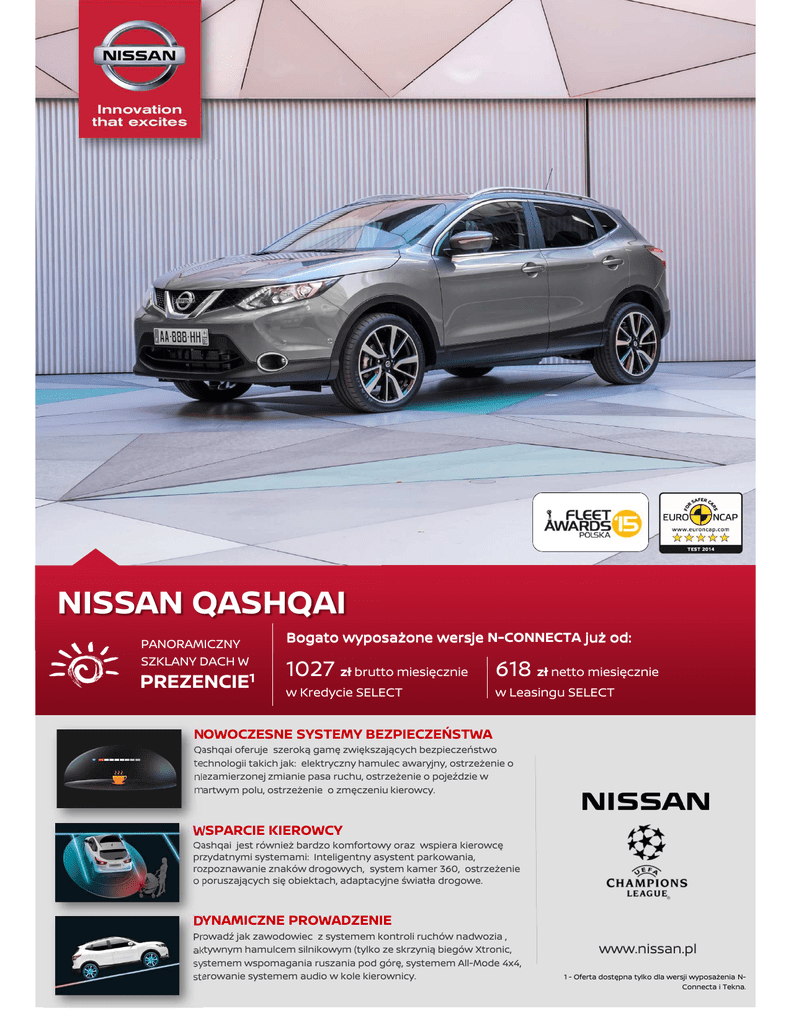 NISSAN QASHQAI PANORAMICZNY SZKLANY DACH W PREZENCIE1 Bogato wyposażone wersje N-CONNECTA już od: 1027 zł brutto miesięcznie 618 zł netto miesięcznie w Kredycie SELECT w Leasingu SELECT NOWOCZESNE SYSTEMY BEZPIECZEŃSTWA Qashqai oferuje szeroką gamę zwiększających bezpieczeństwo technologii takich jak: elektryczny hamulec awaryjny, ostrzeżenie o niezamierzonej zmianie pasa ruchu, ostrzeżenie o pojeździe w martwym polu, ostrzeżenie o zmęczeniu kierowcy. WSPARCIE KIEROWCY Qashqai jest również bardzo komfortowy oraz wspiera kierowcę przydatnymi systemami: Inteligentny asystent parkowania, rozpoznawanie znaków drogowych, system kamer 360, ostrzeżenie o poruszających się obiektach, adaptacyjne światła drogowe. DYNAMICZNE PROWADZENIE Prowadź jak zawodowiec z systemem kontroli ruchów nadwozia , aktywnym hamulcem silnikowym (tylko ze skrzynią biegów Xtronic, systemem wspomagania ruszania pod górę, systemem All-Mode 4x4, sterowanie systemem audio w kole kierownicy. www.nissan.pl 1 - Oferta dostępna tylko dla wersji wyposażenia NConnecta i Tekna. CENNIK PROMOCYJNY - PRODUKCJA 2016 Silniki benzynowe VISIA ACENTA N-CONNECTA TEKNA 73 300 80 100 89 850 97 950 DIG-T 115 (190 Nm) 5.6 l/100 km DIG-T 115 Xtronic (165 Nm) 5.6 l/100 km 81 700 88 500 98 250 106 350 5.8 l/100 km 82 100 88 900 98 650 106 750 dCi 110 (260 Nm) 3.8 l/100 km 82 800 89 600 99 350 107 450 dCi 130 (320 Nm) 4.4 l/100 km 90 100 96 900 106 650 114 750 dCi 130 Xtronic (CVT) (320 Nm) 4.7 l/100 km 98 100 104 900 114 650 122 750 dCi 130 All Mode 4x4-i (320 Nm) 4.9 l/100 km 97 700 104 500 114 250 122 350 DIG-T 160 (240 Nm) Silnik diesla WYPOSAŻENIE OPCJONALNE VISIA ACENTA N-CONNECTA TEKNA 3 600 3 600 S S Nissan Connect 1- Zintegrowany system nawigacji z 7" dotykowym wyświetlaczem Łącze USB, MP3 oraz iPod, system Bluetooth Teraz z 3-letnim programem aktualizacji map GRATIS! - 5 250 S S Pakiet PREMIUM Panoramiczne okno dachowe Relingi dachowe - 3 400 18” felgi ze stopu metali lekkich Przyciemniane szyby - 2 000 Pakiet Bezpieczeństwa Pakiet Look (Możliwy do zamówienia wyłączenie z pakietem Premium) 3400 GRATIS - 2700 Panoramiczne okno dachowe z elektryczną roletą - - - Podgrzewana przednia szyba - - - 800 Skórzane siedzenia 2- - - - 2 500 - - 1 500 - - - - 2 500 Pakiet zimowy Podgrzewane przednie siedzenia Podgrzewana szyba przednia Siedzenia obite jasną tkaniną typu Alcantara oraz czarna podsufitka Lakier metalizowany 2 400 Biały perłowy (QAB) 2 700 1 200 Lakier specjalny (326) 3- Nissan 5★ Rozszerzona Gwarancja GRATIS do 4 lat lub 100 000 km do 5 lat lub 100 000 km do 5 lat lub 150 000 km 905 1 910 2 365 1 - Niektóre zdalne funkcje mogą wymagać zsynchronizowanego telefonu lub urządzenia, ktore nie są na wyposażeniu samochodu. Sieci komórkowe są dostarczane przez operatorów sieci mobilnych i są poza kontrolą Nissana. Informujemy, że system ten umożliwia połączenie z internetem za pomocą telefonu zsynchronizowanego z systemem Bluetooth. Przy korzystaniu z sieci bezprzewodowej zastosowane będzie standardowe minutowe naliczanie. Niektóre z usług mogą być niedostępnie, zgodnie z zasadami obowiązującymi na danym rynku. Pokrycie systemu nawigacji nie jest w pełni zweryfikowane w przypadku dróg lokalnych. W celu uzyskania szczegółowych informacji prosimy kontaktować się z Dealerem firmy Nissan. Nissan Connect jest kompatybilny z systemami iOS oraz Android. Darmowa aktualizacja rocznego oprogramowania nawigacji przez 3 lata. 2 - Tak, jak praktykuje się wśród producentów samochodów, niektóre części skórzanych foteli mogą zawierać syntetyczną skórę. Skóra syntetyczna ma wiele zalet względem prawdziwej (brak tworzenia się zmarszczek w miarę starzenia, łatwiejsze czyszczenie, podwyższona odporność na zarysowania), co pozwala na zaoferowanie bardziej wytrzymałego produktu dla naszych Klientów. 3 - Nissan 5★ Rozszerzona Gwarancja Umowa Ubezpieczenia Grupowego jest produktem ubezpieczeniowym; w celu uzyskania bliższych informacji prosimy zapoznać się z broszurą informacyjną oraz Ogólnymi Warunkami Ubezpieczenia dostępnymi u Autoryzowanych Dealerów. Wszystkie ceny wyrażone są w złotych polskich i zawierają podatek VAT według obowiązującej stawki oraz podatek akcyzowy. - Oferta dostępna tylko dla dealerów biorących udział w programie. CENNIK PODSTAWOWY - PRODUKCJA 2016 Silniki benzynowe VISIA ACENTA N-CONNECTA TEKNA 5.6 l/100 km 76 900 83 700 93 450 101 550 DIG-T 115 Xtronic (165 Nm) 5.6 l/100 km 85 300 92 100 101 850 109 950 DIG-T 160 (240 Nm) 5.8 l/100 km 85 700 92 500 102 250 110 350 dCi 110 (260 Nm) 3.8 l/100 km 86 400 93 200 102 950 111 050 dCi 130 (320 Nm) 4.4 l/100 km 93 700 100 500 110 250 118 350 dCi 130 Xtronic (CVT) (320 Nm) 4.7 l/100 km 101 700 108 500 118 250 126 350 4.9 l/100 km 101 300 108 100 117 850 125 950 VISIA ACENTA N-CONNECTA TEKNA DIG-T 115 (190 Nm) Silnik diesla dCi 130 All Mode 4x4-i (320 Nm) WYPOSAŻENIE OPCJONALNE 3 600 3 600 S S Nissan Connect 1- Zintegrowany system nawigacji z 7" dotykowym wyświetlaczem Łącze USB, MP3 oraz iPod, system Bluetooth Teraz z 3-letnim programem aktualizacji map GRATIS! - 5 250 S S Pakiet PREMIUM Panoramiczne okno dachowe Relingi dachowe - 3 400 3 400 - 18” felgi ze stopu metali lekkich Przyciemniane szyby - 2 000 - - Panoramiczne okno dachowe z elektryczną roletą - - - 2 700 Podgrzewana przednia szyba - - - 800 - - - 2 500 - - 1 500 - - - - 2 500 Pakiet Bezpieczeństwa Pakiet Look (Możliwy do zamówienia wyłączenie z pakietem Premium) Skórzane siedzenia 2- Pakiet zimowy Podgrzewane przednie siedzenia Podgrzewana szyba przednia Siedzenia obite jasną tkaniną typu Alcantara oraz czarna podsufitka Lakier metalizowany 2 400 Biały perłowy (QAB) 2 700 1 200 Lakier specjalny (326) Nissan 5★ 3Rozszerzona Gwarancja do 4 lat lub 100 000 km do 5 lat lub 100 000 km do 5 lat lub 150 000 km 905 1 910 2 365 1 - Niektóre zdalne funkcje mogą wymagać zsynchronizowanego telefonu