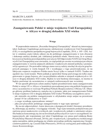 Nr 9 ROCZNIK INTEGRACJI EUROPEJSKIEJ 2015 DOI : 10.14746/rie.2015.9.11 MARCIN LASOÑ Krakowska Akademia im. Andrzeja Frycza Modrzewskiego Zaanga¿owanie Polski w misje wojskowe Unii Europejskiej w Afryce w drugiej dekadzie XXI wieku Wstêp W poprzednim numerze „Rocznika Integracji Europejskiej” ukaza³ siê interesuj¹cy tekst Andrzeja Ciupiñskiego poœwiêcony zdolnoœciom wojskowym Unii Europejskiej (UE), w szczególnoœci perspektyw¹ grup bojowych (Ciupiñski, 2014, s. 105–120). Autor w ostatniej czêœci tekstu odnosi siê do polskiego zaanga¿owania w tym obszarze i dokonuje analizy dzia³añ, jak i deklaracji polskich w³adz. Stawia tezê, ¿e w sytuacji kryzysowej bardziej prawdopodobne jest u¿ycie Si³ Odpowiedzi NATO ni¿ Grup Bojowych Unii Europejskiej oraz stwierdza, ¿e rz¹d polski po swoim wczeœniejszym silnym zaanga¿owaniu w rozwój unijnych zdolnoœci wojskowych zmieni³ politykê i postanowi³ je ograniczyæ. Do powodów takiego stanu rzeczy nale¿y niechêæ do u¿ycia grup bojowych panuj¹ca w wielu krajach UE i wynikaj¹ce z tego przeœwiadczenie, ¿e na faktyczne wsparcie wojskowe Polska mo¿e liczyæ tylko w ramach NATO. Trudno nie zgodziæ siê z tymi tezami. Warto jednak je sprawdziæ bior¹c pod uwagê nie tylko zaanga¿owanie w grupy bojowe, ale i na przyk³adzie udzia³u w misjach wojskowych w Afryce w drugiej dekadzie XXI wieku. Bêdzie to tym bardziej interesuj¹ce, ¿e mo¿na to bêdzie porównaæ do uczestnictwa w misjach realizowanych tam wczeœniej. W ten sposób g³ównym celem analizy bêdzie przedstawienie stanu zaanga¿owania Polski w misje UE w Afryce w kontekœcie prowadzonej przez ni¹ polityki bezpieczeñstwa i uczestnictwa w rozwoju Wspólnej Polityki Bezpieczeñstwa i Obrony UE. Dlatego g³ówny problem badawczy zamyka siê w pytaniu: jakie jest zaanga¿owanie Polski w misje wojskowe UE w drugiej dekadzie XXI wieku? Problemy szczegó³owe zaœ to: – jak zmieni³o siê polskie zaanga¿owanie w afrykañskie misje unijne na przestrzeni ponad 10 lat cz³onkostwa w Unii? – z czego wynikaj¹ wprowadzone zmiany? – jaka jest przysz³oœæ polskiego zaanga¿owania w tego typu operacje? By na nie odpowiedzieæ, Autor skorzysta z dostêpnych Ÿróde³ i literatury przedmiotu, dokonuj¹c jej analizy i wyci¹gaj¹c wnioski. Tego typu tematyka podejmowana jest zarówno przez naukowców cywilnych, jak i wojskowych, jednak w zale¿noœci od profilu badacza koncentruj¹ siê oni na kwestiach politycznych (w tym w szczególnoœci integracyjnych, jak wspomniany ju¿ tekst Ciupiñskiego czy praca pod redakcj¹ Beaty Przybylskiej-Maszner (Poznañ, 2014)), jak i wojskowych, z perspektywy technicznego opisu narzêdzia, jakim pos³uguj¹ siê w³adze prowadz¹c politykê zagraniczn¹ i bezpieczeñstwa pañstwa, np. Leszek Elak (Warszawa, 2010) czy szereg prac pod redakcj¹ Dariusza Kozerawskiego. 174 Marcin Lasoñ RIE 9 ’15 Stan obecny Aktualne dane dotycz¹ce zaanga¿owania Wojska Polskiego w dzia³ania poza granicami kraju znaleŸæ mo¿na w stenogramie sprawozdania posiedzenia senackiej Komisji Obrony Narodowej z 5 lutego 2015 roku (Zapis stenograficzny, 5 II 2015). Zawiera on informacjê Ministra Obrony Narodowej (MON) za okres 2014 roku. Warto podkreœliæ, ¿e ju¿ na wstêpie referuj¹cy j¹ Podsekretarz Stanu w MON Maciej Jankowski podaje, ¿e Polska bierze aktywny udzia³ w misjach NATO, UE oraz Organizacji Narodów Zjednoczonych. W wypadku Unii wskazuje, ¿e Polska bierze lub bra³a aktywny udzia³ w szczególnoœci w misji w Boœni i Hercegowinie, ale i w Republice Œrodkowoafrykañskiej (w tym we wczeœniejszej fazie zaanga¿owania si³ miêdzynarodowych poprzez wsparcie si³ francuskich w zakresie wsparcia logistycznego) oraz w zakoñczonej w 2014 roku misji w Mali. Warto dodaæ, ¿e podano tak¿e i¿ Polska obsadzi³a 20 stanowisk w strukturach unijnych, przede wszystkim w sztabie wojskowym. Jest to zdecydowanie mniejsza skala ni¿ w wypadku NATO, co w tym wypadku nie mo¿e budziæ zdziwienia, bior¹c pod uwagê charakter i specyfikê obu organizacji. Zdecydowanie ciekawsze jest to, ¿e w 2014 roku polscy ¿o³nierze wziêli udzia³ tylko w jednych æwiczeniach wojskowych pod auspicjami UE, ale ju¿ 10 natowskich. To fakt, który prowadzi do wniosków dotycz¹cych nie tylko stanu wojskowej wspó³pracy pañstw Unii, ale i znaczenia, jakie dla Polski ma bezpieczeñstwo militarne i zwi¹zane z nimi znaczenie obu organizacji. Je¿eli zaœ chodzi o zaanga¿owanie polskie w kontyngenty wojskowe (PKW) w Afryce, to podchodz¹c do rzeczy systematycznie i syntetycznie podaæ nale¿y, ¿e (Zapis stenograficzny, 5 II 2015): – PKW w Republice Œrodkowoafrykañskiej, dzia³a³ od 1 lutego do 25 kwietnia 2014 roku. Nie by³ kontyngentem skierowanym na misjê UE, ale wspiera³ dzia³ania wojsk francuskich w tym pañstwie poprzez us³ugi transportowe. Kontyngent liczy³ 34 ¿o³nierzy stacjonuj¹cych we Francji, z której wykonywano loty do Republiki Œrodkowoafrykañskiej samolotem C-130 Hercules. Zrealizowano ich siedem. Koszty jego funkcjonowania oszacowano na ok. 2 mln pln. Trzeba podkreœliæ, ¿e misja by³a realizowana w ramach wspó³pracy dwustronnej z Francj¹, mia³a zatem inny charakter, celowa³a w pomoc wa¿nemu dla Polski sojusznikowi europejskiemu, którego ranga jest podnoszona przez w³adze pañstwowe; – w kwietniu 2014 roku rozpoczê³a siê misja wojskowa UE w Republice Œrodkowoafrykañskiej (EUFOR RCA). PKW skierowany tam zosta³ zgodnie z postanowieniem Prezydenta RP z 12 grudnia 2014 roku z mandatem do 15 marca 2015 roku i okreœleniem liczebnoœci na 50 ¿o³nierzy (Monitor Polski, 15 XII 2014). G³ównym jego trzonem zosta³ pluton ¿andarmerii wojskowej realizuj¹cy zadania patrolowe i prewencyjne, a celem misji jest zapewnienie warunków do udzielania pomocy humanitarnej. Wydatki na PKW oszacowano na ok. 6 mln pln, a koniec obecnoœci nast¹pi³ w lutym 2015 roku. Zdecydowano jednak o dalszym zaanga¿owaniu w tym pañstw