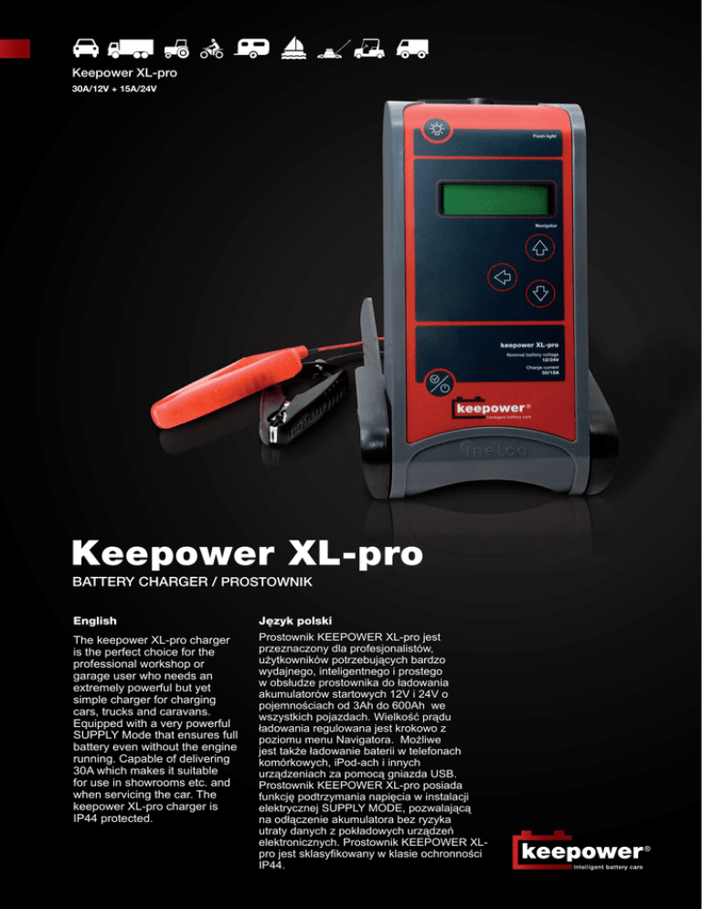 Keepower XL-pro 30A/12V + 15A/24V Keepower XL-pro BATTERY CHARGER / Prostownik English The keepower XL-pro charger is the perfect choice for the professional workshop or garage user who needs an extremely powerful but yet simple charger for charging cars, trucks and caravans. Equipped with a very powerful SUPPLY Mode that ensures full battery even without the engine running. Capable of delivering 30A which makes it suitable for use in showrooms etc. and when servicing the car. The keepower XL-pro charger is IP44 protected. Język polski Prostownik KEEPOWER XL-pro jest przeznaczony dla profesjonalistów, użytkowników potrzebujących bardzo wydajnego, inteligentnego i prostego w obsłudze prostownika do ładowania akumulatorów startowych 12V i 24V o pojemnościach od 3Ah do 600Ah we wszystkich pojazdach. Wielkość prądu ładowania regulowana jest krokowo z poziomu menu Navigatora. Możliwe jest także ładowanie baterii w telefonach komórkowych, iPod-ach i innych urządzeniach za pomocą gniazda USB. Prostownik KEEPOWER XL-pro posiada funkcję podtrzymania napięcia w instalacji elektrycznej SUPPLY MODE, pozwalającą na odłączenie akumulatora bez ryzyka utraty danych z pokładowych urządzeń elektronicznych. Prostownik KEEPOWER XLpro jest sklasyfikowany w klasie ochronności IP44. Keepower XL-pro 30A/12V + 15A/24V The intelligent charging curve / Inteligentna krzywa ładowania The Keepower Charger kit / prostownik Keepower Flash light / Latarka Flash light bottom / Włacznik latarki Navigation Selection bottom / Auswahlknopf Keepower charger / Keepower Testing / Testowanie Soft change / Ładowanie miękkie Desulphation / Odsiarczanianie Bulk charge / Ładowanie pełne Absorption / Nasycanie After charge / Ładowanie końcowe Testing / Testowanie Maintenance / Ładowanie zachowawcze Motorbike cable / Kabel motocyklowy Maintenance / Ładowanie zachowawcze Cigarette cable / Adaptor zapalniczkowy Mains cable / Kabel zasilający Minus clip - Black / Zacisk „minus”czarny Plus clips - Red / Zacisk „plus”czerwony The intelligent charging curve Inteligentna krzywa ładowania Soft charge (Indication: Discharged LED flashing): The “soft charge” phase is used when the battery is deep discharged. The battery is charged until it is ready to receive normal charging (12.0V) and then the normal charging is started. Ładowanie miękkie (sygnalizacja: miga dioda Akumulator rozładowany): Faza ładowania miękkiego stosowana jest w przypadku głębokiego rozładowania akumulatora. Akumulator ładowany jest prądem o niskim natężeniu do chwili, gdy będzie w stanie przyjmować prąd o natężeniu do 30A dla akumulatora 12V lub do 15A dla akumulatora 24V. Desulphation (Indication: Low LED flashing): The “desulphation” phase is used if the battery has not been used in a longer period. Odsiarczanie (sygnalizacja: miga dioda Naładowanie niskie): Faza odsiarczania stosowana jest w przypadku, gdy akumulator wykazuje cechy zasiarczenia. Bulk charging (Indication: Low LED flashing): The “bulk” phase is the phase where the battery under a constant current is charged up to app. 85% of the full capacity. Ładowanie pełne (sygnalizacja: miga dioda Naładowanie niskie): W tej fazie akumulator ładowany jest prądem o stałym natężeniu do 30A dla akumulatorów 12V lub do 15A dla akumulatorów 24V do chwili osiągnięcia 85% całkowitej pojemności. Wielkość maksymalnego prądu ładowania regulowana jest krokowo z poziomu menu Navigatora. Absorption (Indication: Medium LED flashing): The “absorption” phase is the phase where the battery under a constant voltage is charged up to app. 98% of the full capacity. Nasycanie (sygnalizacja: miga dioda Naładowanie średnie): Jest to faza podczas której akumulator ładowany jest przy utrzymywaniu stałej wartości napięcia do chwili osiągnięcia 98% całkowitej pojemności. After charging (Indication: Full LED flashing): The “after charging” phase is the phase where the battery under a constant voltage is charged up to app. 100% of the full capacity. The voltage is raised 0.4V compared to the Bulk charging phase. Ładowanie końcowe (sygnalizacja: miga dioda Naładowanie całkowite): Jest to faza podczas której akumulator ładowany jest w warunkach stałej wartości natężenia prądu ładowania, do chwili osiągnięcia 100% naładowania. Napięcie końcowe jest podwyższone w stosunku do fazy ładowania pełnego o 0,4 V. Testing (Indication: Full LED flashing): The “testing” phase is the phase where the battery is tested for a defect battery cell. Testowanie (sygnalizacja: miga dioda Naładowanie całkowite): Jest to faza podczas której prostownik sprawdza, czy wszystkie ogniwa w akumulatorze są sprawne. Maintenance (Indication: Full LED constant): The purpose with “maintenance” phase is to keep the battery at 100% over a long period of time. The charger is at all time measuring the voltage and when it goes below 12,6 / 25,2 V it will start charging the battery. Boost (Indication: Discharged LED flashing): The “Boost” phase is used to kick-start the battery if it has low power. This “Boost” is made as an intelligent boosting. This means that the charger is boosting the battery for ½ hour with maximum current and then there is made a test of the battery to see if it is ready for normal charging, if the battery voltage is not ready for normal charging, the charger will boost again. This process is repeated 4 times and if the battery is not ok after that the charger will indicate a fault. Supply Mode (Indication: Full LED constant): The “Supply mode” is used as a power supply when the car is fx in a showroom and the cars facilities is used without the motor running. Incase of overload, the Warning LED flashes. If heavy overload, the charger switches off to protect it self. A battery has to be connected for activation of “Supply mode”. Please note that spark protection is not active when in supply mode. Ładowa