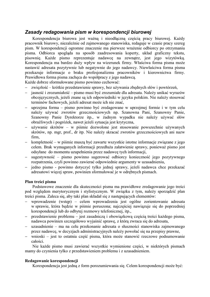 Zasady redagowania pism w korespondencji biurowej Korespondencja biurowa jest waŜną i nieodłączną częścią pracy biurowej. KaŜdy pracownik biurowy, niezaleŜnie od zajmowanego stanowiska, redaguje w czasie pracy szereg pism. W korespondencji ogromne znaczenie ma pierwsze wraŜenie odbiorcy po otrzymaniu pisma. Odbiorca spogląda na sposób zaadresowania koperty, układ graficzny tekstu, pisownię. KaŜde pismo reprezentuje nadawcę na zewnątrz, jest jego wizytówką. Korespondencja ma bardzo duŜy wpływ na wizerunek firmy. Właściwa forma pisma moŜe nastawić adresata pozytywnie lub negatywnie do jego nadawcy. Niewłaściwa forma pisma przekazuje informacje o braku profesjonalizmu pracowników i kierownictwa firmy. Prawidłowa forma pisma zachęca do współpracy z jego nadawcą. KaŜde dobrze sformułowane pismo powinno cechować: − zwięzłość – krótkie przedstawienie sprawy, bez uŜywania zbędnych słów i powtórzeń, − jasność i zrozumiałość – pismo musi być zrozumiałe dla adresata. NaleŜy unikać wyrazów obcojęzycznych, jeŜeli znane są ich odpowiedniki w języku polskim. Nie naleŜy stosować terminów fachowych, jeŜeli adresat moŜe ich nie znać, − uprzejma forma – pismo powinno być zredagowane w uprzejmej formie i w tym celu naleŜy uŜywać zwrotów grzecznościowych np. Szanowna Pani, Szanowny Panie, Szanowny Panie Dyrektorze itp., w Ŝadnym wypadku nie naleŜy uŜywać słów obraźliwych i pogróŜek, nawet jeŜeli sytuacja jest krytyczna, − uŜywanie skrótów – w piśmie dozwolone jest stosowanie powszechnie uŜywanych skrótów, np. mgr, prof., dr itp. Nie naleŜy skracać zwrotów grzecznościowych ani nazw firm, − kompletność – w piśmie muszą być zawarte wszystkie istotne informacje związane z jego celem. Brak wymaganych informacji przedłuŜa załatwienie sprawy, poniewaŜ pismo jest odsyłane do momentu uzupełnienia przez nadawcę tych informacji, − sugestywność – pismo powinno sugerować odbiorcy konieczność jego pozytywnego rozpatrzenia, czyli powinno zawierać odpowiednie argumenty w uzasadnieniu, − jedno pismo - powinno dotyczyć tylko jednej sprawy, jeŜeli nadawca chce przekazać adresatowi więcej spraw, powinien sformułować je w odrębnych pismach. Plan treści pisma Podstawowe znaczenie dla skuteczności pisma ma prawidłowe zredagowanie jego treści pod względem merytorycznym i stylistycznym. W związku z tym, naleŜy sporządzić plan treści pisma. Zaleca się, aby taki plan składał się z następujących elementów: − wprowadzenie (wstęp) – celem wprowadzenia jest ogólne zorientowanie adresata w sprawie, która będzie w piśmie poruszona; najczęściej nawiązuje się do poprzedniej korespondencji lub do odbytej rozmowy telefonicznej, itp., − przedstawienie problemu – jest zasadniczą i obowiązkową częścią treści kaŜdego pisma, nadawca powinien szczegółowo wyjaśnić sprawę, z którą zwraca się do adresata, − uzasadnienie – ma na celu przekonanie adresata o słuszności stanowiska zajmowanego przez nadawcę, w decyzjach administracyjnych naleŜy powołać się na przepisy prawne, − wnioski – jest to ostatnia część pisma, która moŜe stanowić rzeczowe podsumowanie całości. Nie kaŜde pismo musi zawierać wszystkie wymienione części, w niektórych pismach mamy do czynienia tylko z przedstawieniem problemu i z uzasadnieniem. Redagowanie korespondencji Korespondencja jest jedną z form porozumiewania się. Celem korespondencji moŜe być: − przekazywanie informacji o przedsiębiorstwie, − potwierdzenie i uzupełnienie treści umów zawartych ustnie lub telefonicznie, − udokumentowanie postanowień lub decyzji, itp. Korespondencję biurową moŜna podzielić na: − wewnętrzną – słuŜy ona do porozumiewania się wewnątrz przedsiębiorstwa, − zewnętrzną – wpływającą i wychodzącą, stanowi ona więź między przedsiębiorstwem a otoczeniem zewnętrznym. Pisma mogą być redagowane na papierze bez nadruku lub na blankietach korespondencyjnych, do których zalicza się: − blankiet zwykły – BZ, − blankiet reklamowy – BR, − blankiet uproszczony – BU. NiezaleŜnie od tego, czy pismo sporządzane jest na blankiecie korespondencyjnym czy na papierze bez nadruku zwykle uŜywa się papieru formatu A4 (210 x 297 mm) w układzie pionowym lub A5 (210 x 148,5 mm). Przy redagowaniu pism wykorzystuje się dwa róŜne układy graficzne: układ europejski lub układ amerykański. Układy te róŜnią się między sobą rozłoŜeniem poszczególnych elementów pisma na papierze. Elementy pisma: − pole nagłówkowe – zawiera nazwę i adres nadawcy pisma, − pole adresata – zawiera nazwę i siedzibę firmy lub miejsce zamieszkania adresata, − miejscowość i datę, − pole wpływu – miejsce na pieczątkę wpływu dokumentów do firmy, − w pismach urzędowych, w których występuje prośba o dokonanie czynności prawnej, powinno napisać się, czego dotyczy sprawa; określenie sprawy jest swoistym tytułem pisma, to na jego podstawie bez czytania tekstu, dokonuje się rozdzielenia pisma do załatwienia, − treść pisma, − formuła grzecznościowa zakończeniowa – tzw. zwroty poŜegnalne np. Z powaŜaniem, Z wyrazami szacunku, Załączam pozdrowienia, itp., − podpisy, − załączniki. NiŜej przedstawiono przykładowe pisma w układzie europejskim i amerykańskim. Miejsce i data sporządzenia pisma Pole nagłówkowe pieczątka wpływu Pole adresata Określenie sprawy Treść pisma załączniki Zwrot poŜegnalny i podpis Rys. 3. Układ pisma według wzoru europejskiego. Źródło: [Opracowanie własne]. Pomorski Zakład Ubezpieczeń w Szczecinie ul. Mrowia 25 47 – 598 Szczecin Szczecin, dnia 18-04-2006 Pan Tomasz Karwowski ul. Pucka 25/14 56 – 145 JAROCIN Sprawa: oferta ubezpieczeniowa Szanowni Państwo Cieszymy się, Ŝe docenili Państwo atrakcyjność gwarantowanego przez nas, osobistego pakietu ubezpieczeniowe