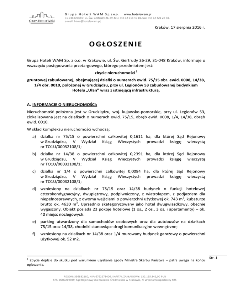 G r u p a H o t e l i W A M S p. z o.o. www.hotelewam.pl 31-048 Kraków, ul. Św. Gertrudy 26-29, tel.: +48 12 618 40 10, fax: +48 12 421 28 58, e-mail: [email protected], Kraków, 17 sierpnia 2016 r. OGŁOSZENIE Grupa Hoteli WAM Sp. z o.o. w Krakowie, ul. Św. Gertrudy 26-29, 31-048 Kraków, informuje o wszczęciu postępowania przetargowego, którego przedmiotem jest: zbycie nieruchomości 1 gruntowej zabudowanej, obejmującej działki o numerach ewid. 75/15 obr. ewid. 0008, 14/38, 1/4 obr. 0010, położonej w Grudziądzu, przy ul. Legionów 53 zabudowanej budynkiem Hotelu „Ułan” wraz z istniejącą infrastrukturą. A. INFORMACJE O NIERUCHOMOŚCI: Nieruchomość położona jest w Grudziądzu, woj. kujawsko-pomorskie, przy ul. Legionów 53, zlokalizowana jest na działkach o numerach ewid. 75/15, obręb ewid. 0008, 1/4, 14/38, obręb ewid. 0010. W skład kompleksu nieruchomości wchodzą: a) działka nr 75/15 o powierzchni całkowitej 0,1611 ha, dla której Sąd Rejonowy w Grudziądzu, V Wydział Ksiąg Wieczystych prowadzi księgę wieczystą nr TO1U/00032108/1; b) działka nr 14/38 o powierzchni całkowitej 0,2391 ha, dla której Sąd Rejonowy w Grudziądzu, V Wydział Ksiąg Wieczystych prowadzi księgę wieczystą nr TO1U/00032108/1; c) działka nr 1/4 o powierzchni całkowitej 0,0084 ha, dla której Sąd Rejonowy w Grudziądzu, V Wydział Ksiąg Wieczystych prowadzi księgę wieczystą nr TO1U/00032108/1; d) wzniesiony na działkach nr 75/15 oraz 14/38 budynek o funkcji hotelowej czterokondygnacyjny, dwupiętrowy, podpiwniczony, z wiatrołapem, z podjazdem dla niepełnosprawnych, z dwoma wejściami o powierzchni użytkowej ok. 743 m2, kubaturze brutto ok. 4630 m3. Uprzednio skategoryzowany jako hotel dwugwiazdkowy, obecnie wygaszony. Obiekt posiada 23 pokoje hotelowe (1 os., 2 os., 3 os. i apartamenty) – ok. 40 miejsc noclegowych. e) parking utwardzony dla samochodów osobowych oraz dla autobusów na działkach 75/15 oraz 14/38, chodniki stanowiące drogi komunikacyjne wewnętrzne; f) wzniesiony na działkach nr 14/38 oraz 1/4 murowany budynek garażowy o powierzchni użytkowej ok. 52 m2. 1 Zbycie dojdzie do skutku pod warunkiem uzyskania zgody Ministra Skarbu Państwa – patrz uwaga na końcu ogłoszenia. REGON: 356882180, NIP: 6762278406, KAPITAŁ ZAKŁADOWY: 132.155.842,00 PLN KRS: 0000219989, Sąd Rejonowy dla Krakowa-Śródmieścia w Krakowie, XI Wydział Gospodarczy KRS Str. 1 G r u p a H o t e l i W A M S p. z o.o. www.hotelewam.pl 31-048 Kraków, ul. Św. Gertrudy 26-29, tel.: +48 12 618 40 10, fax: +48 12 421 28 58, e-mail: [email protected], Stan techniczno-użytkowy nieruchomości W skład nieruchomości wchodzą trzy działki ewidencyjne nr 75/15, 1/4, 14/38 o łącznej powierzchni 4086 m2. Kształt całej nieruchomości regularny, prostokątny. Teren jest ogrodzony – ogrodzenie frontowe stalowe z dwiema bramami wjazdowymi (od ulicy Legionów), boczne – murowane, z tyłu posesji (od strony północnej) – z siatki w ramach. Na nieruchomości posadowiony jest murowany budynek hotelowy oraz murowane garaże w zabudowie szeregowej. Do nieruchomości doprowadzone są następujące sieci uzbrojenia terenu: elektroenergetyczna, gazowa, wodociągowa oraz kanalizacji sanitarnej. Centralne ogrzewanie budynku zasilane piecem gazowym znajdującym się w piwnicy. Teren wokół budynku jest zagospodarowany głównie zielenią (trawniki, brzozy), ciągi komunikacyjne wylane asfaltem lub utwardzone trylinką, betonem lub kostką. Z nieruchomością nie są związane żadne obciążenia i zobowiązania. Z nieruchomością związane są następujące umowy: - trzy umowy najmu na czas nieokreślony, okres wypowiedzenia 3-miesiące, - jedna umowa abonamentowa na miejsce parkingowe, z 1-miesięcznym okresem wypowiedzenia, - umowa o świadczenie usług ochroniarskich na czas nieokreślony, okres wypowiedzenia 3-miesiące. Przeznaczenie i sposób użytkowania nieruchomości Na dzień ukazania się niniejszego ogłoszenia nieruchomość nie jest objęta miejscowym planem zagospodarowania przestrzennego. Zgodnie ze Studium uwarunkowań i kierunków zagospodarowania przestrzennego miasta Grudziądza przedmiotowe działki stanowią teren z wiodącą funkcją mieszkaniową wielorodzinną. Aktualny sposób użytkowania przedmiotowej nieruchomości – teren zabudowany murowanym budynkiem hotelowym i murowanymi garażami w zabudowie szeregowej. Budynek hotelowy W budynku hotelowym znajdują się 23 pokoje (6 pokoi jednoosobowych, 13 pokoi dwuosobowych, 2 pokoje trzyosobowe) oraz dwa apartamenty. Apartament składa się z pokoju dziennego, sypialni, oraz łazienki z prysznicem. Ponadto, na parterze znajduje się recepcja i sala barowa z niewielkim zapleczem kuchennym. Rozmieszczenie pomieszczeń jest następujące: piwnica: kotłownia i inne pomieszczenia gospodarcze, parter – pięć pokoi, recepcja, sala barowa z zapleczem, I piętro – dziewięć pokoi, w tym apartament i jedno pomieszczenie gospodarcze, II piętro – dziewięć pokoi, w tym apartament i jedno pomieszczenie gospodarcze. Pokoje z łazienkami (umywalka, toaleta, prysznic). Budynek posiada zaplecze socjalno-biurowe, techniczne i gospodarcze, toalety ogólnodostępne, Str. 2 salę restauracyjną na ok. 30 osób z zapleczem gastronomicznym. REGON: 356882180, NIP: 6762278406, KAPITAŁ ZAKŁADOWY: 132.155.842,00 PLN KRS: 0000219989, Sąd Rejonowy dla Krakowa-Śródmieścia w Krakowie, XI Wydział Gospodarczy KRS G r u p a H o t e l i W A M S p. z o.o. www.hotelewam.pl 31-048 Kraków, ul. Św. Gertrudy 26-29, tel.: +48 12 618 40 10, fax: +48 12 421 28 58, e-mail: [email protected], Obecnie budynek nie posiada wyposażenia hotelowo-gastronomicznego. Opis techniczny budynku hotelowego Powierzchnia użytkowa - 743 m2 Parametry powierzchniowe Kubatura brutto - 4630 m3 Układ konstrukcyjny Budynek wybudowany w 1953 r., wykonany w technologii tradycyjnej murowanej. Posadowiony na ławach fundamentowych zbrojonych wylewanych z b