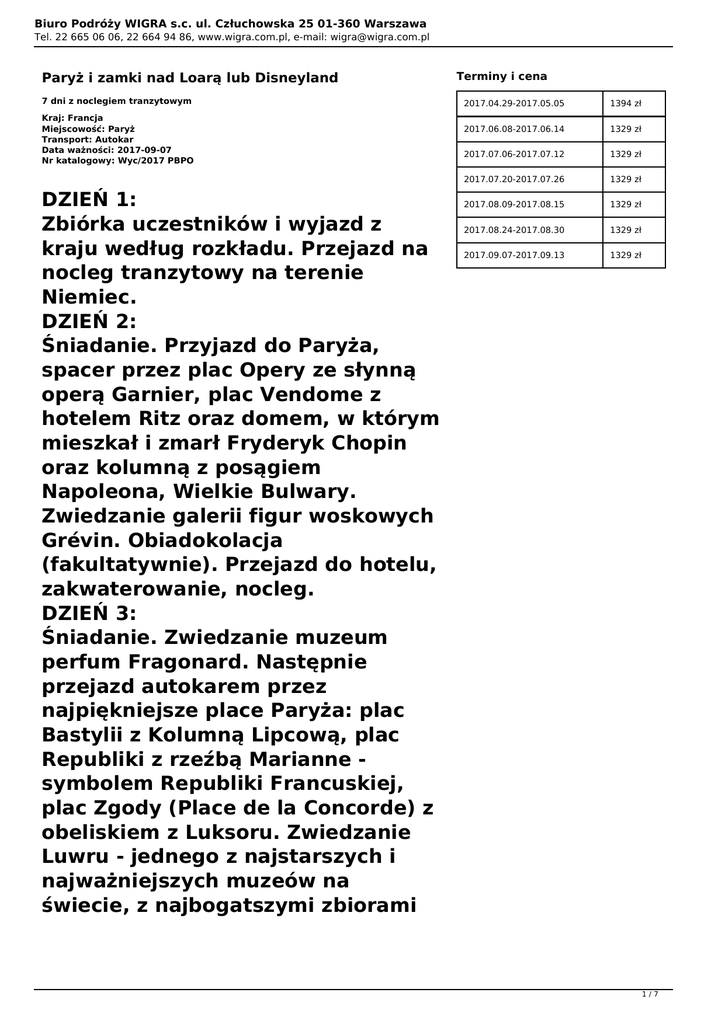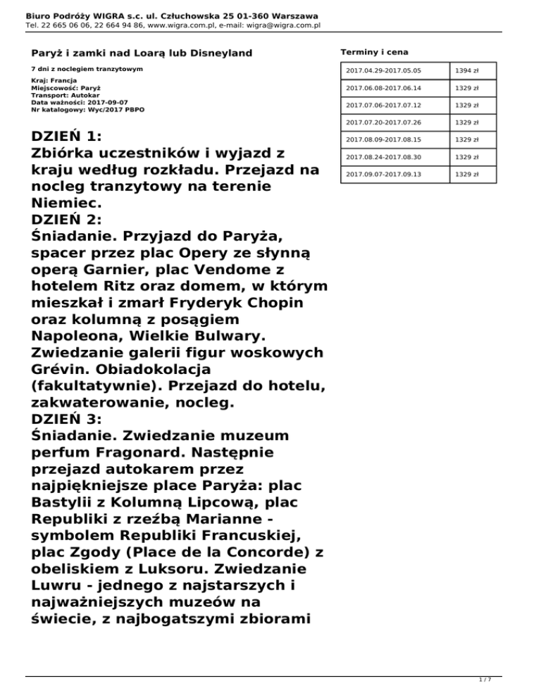 Biuro Podróży WIGRA s.c. ul. Człuchowska 25 01-360 Warszawa Tel. 22 665 06 06, 22 664 94 86, www.wigra.com.pl, e-mail: [email protected] Paryż i zamki nad Loarą lub Disneyland 7 dni z noclegiem tranzytowym Kraj: Francja Miejscowość: Paryż Transport: Autokar Data ważności: 2017-09-07 Nr katalogowy: Wyc/2017 PBPO DZIEŃ 1: Zbiórka uczestników i wyjazd z kraju według rozkładu. Przejazd na nocleg tranzytowy na terenie Niemiec. DZIEŃ 2: Śniadanie. Przyjazd do Paryża, spacer przez plac Opery ze słynną operą Garnier, plac Vendome z hotelem Ritz oraz domem, w którym mieszkał i zmarł Fryderyk Chopin oraz kolumną z posągiem Napoleona, Wielkie Bulwary. Zwiedzanie galerii figur woskowych Grévin. Obiadokolacja (fakultatywnie). Przejazd do hotelu, zakwaterowanie, nocleg. DZIEŃ 3: Śniadanie. Zwiedzanie muzeum perfum Fragonard. Następnie przejazd autokarem przez najpiękniejsze place Paryża: plac Bastylii z Kolumną Lipcową, plac Republiki z rzeźbą Marianne symbolem Republiki Francuskiej, plac Zgody (Place de la Concorde) z obeliskiem z Luksoru. Zwiedzanie Luwru - jednego z najstarszych i najważniejszych muzeów na świecie, z najbogatszymi zbiorami Terminy i cena 2017.04.29-2017.05.05 1394 zł 2017.06.08-2017.06.14 1329 zł 2017.07.06-2017.07.12 1329 zł 2017.07.20-2017.07.26 1329 zł 2017.08.09-2017.08.15 1329 zł 2017.08.24-2017.08.30 1329 zł 2017.09.07-2017.09.13 1329 zł 1/7 Biuro Podróży WIGRA s.c. ul. Człuchowska 25 01-360 Warszawa Tel. 22 665 06 06, 22 664 94 86, www.wigra.com.pl, e-mail: [email protected] sztuki francuskiej i światowej. Następnie zwiedzanie muzeum d’Orsay z obrazami największych impresjonistów m.in. Van Gogha, Gaugina, Degasa. Obiadokolacja (fakultatywnie). Wieczorem spacer po Polach Elizejskich oraz wejście na Łuk Triumfalny. Powrót do hotelu, nocleg. DZIEŃ 4: Śniadanie. Wycieczka do Wersalu, miejsca rezydencji królów francuskich - zwiedzanie kompleksu pałacowo - ogrodowego. Powrót do Paryża, wizyta w jednej z najsłynniejszych galerii handlowych Paryża Lafayette z przepiękną secesyjną kopułą. Wejście do Hôtel des Invalides z grobowcem Napoleona Bonaparte. Awangardowe Centrum Pompidou, fontanna Strawińskiego potem spacer na wyspę Cité z katedrą Notre Dame, Pałacem Sprawiedliwości, św. Kaplicą. Pont Neuf – najstarszy most w mieście. Następnie Dzielnica Łacińska: Sorbona, Panteon z grobem m. in. Marii Skłodowskiej - Curie, Ogród Luksemburski. Wjazd na wieżę Eiffla, Pole Marsowe. Obiadokolacja (fakultatywnie). Rejs statkiem po Sekwanie. Powrót do hotelu, nocleg. DZIEŃ 5: OPCJA Z ZAMKAMI: Śniadanie we 2/7 Biuro Podróży WIGRA s.c. ul. Człuchowska 25 01-360 Warszawa Tel. 22 665 06 06, 22 664 94 86, www.wigra.com.pl, e-mail: [email protected] wczesnych godzinach rannych. Przejazd w Dolinę Loary. Zwiedzanie zamków:największego zamku CHAMBORD, z bogato zdobionymi wnętrzami zamku CHEVERNY oraz najczęściej odwiedzanego przez królów zamku BLOIS. Możliwość zakupu wina z Doliny Loary.Powrót do Paryża, spotkanie z grupą przebywającą w Disneylandzie, późna obiadokolacja (fakultatywnie). Powrót do hotelu, nocleg. OPCJA Z DISNEYLANDEM: Śniadanie we wczesnych godzinach rannych, dowóz do stacji kolejki RER jadącej do Disneylandu. Przejazd i pobyt w Disneylandzie bez opieki pilota. Wieczorem powrót do Paryża, spotkanie z grupą przebywającą w Dolinie Loary, obiadokolacja (fakultatywnie). Powrót do hotelu, nocleg. DZIEŃ 6: Śniadanie. Zwolnienie pokoi w hotelu. Przejazd środkami komunikacji miejskiej do centrum. Spacer po dzielnicy Montmartre – bazylika Sacre Coeur, plac Artystów – Place du Tertre, kabaret Moulin Rouge oraz plac Pigalle. Czas wolny. Po południu wyjazd z Paryża. W drodze powrotnej do Polski krótkie zwiedzanie Brukseli m.in.: stare miasto z Grand Place, symbol Brukseli Manneken Pis (siusiający 3/7 Biuro Podróży WIGRA s.c. ul. Człuchowska 25 01-360 Warszawa Tel. 22 665 06 06, 22 664 94 86, www.wigra.com.pl, e-mail: [email protected] chłopiec) oraz Dzielnica Europejska. Nocny przejazd przez Niemcy w kierunku Polski. DZIEŃ 7: Przyjazd do Polski. Powrót do poszczególnych miejscowości. Program wycieczki jest ramowy. Kolejność zwiedzania może ulec zmianie. ZAREZERWUJ JUŻ DZIŚ, TEL. 22 665 06 06, 22 664 94 86 DOPŁATY OPCJONALNE: Dopłata do pokoju 1 - os.: 480 zł Dopłata do 4 kolacji: 280 zł CENA IMPREZY OBEJMUJE: - przejazd komfortowym autokarem (klimatyzacja, dvd, barek, wc) - 5 noclegów w hotelach**/***, w pokojach 2 - osobowych z łazienką - 5 śniadań - program turystyczny - opiekę pilota - ubezpieczenie Signal Iduna (KL 10.000 EUR, NNW 15.000 PLN, bagaż 1.000 PLN) DODATKOWO PŁATNE: - pakiet do realizacji programu: Opcja z zamkami: osoby powyżej 26 lat: 150 EUR, osoby poniżej 26 lat: 115 EUR. 4/7 Biuro Podróży WIGRA s.c. ul. Człuchowska 25 01-360 Warszawa Tel. 22 665 06 06, 22 664 94 86, www.wigra.com.pl, e-mail: [email protected] Opcja z Disneylandem: osoby powyżej 26 lat: 180 EUR, osoby poniżej 26 lat: 140 EUR (rezerwacje i wstępy do zwiedzanych obiektów, usługi przewodnickie, wjazd na wieżę Eiffla, rejs statkiem po Sekwanie, bilety komunikacji miejskiej, zestaw sluchawkowy Tour Guide). Pakiet płatny obligatoryjnie pilotowi wycieczki. WAŻNE INFORMACJE: 1.Wycieczki będą realizowane w zależności od ilości uczestników w grupie: wygodnymi autokarami lub wygodnymi busami. 2.Niektóre połączenia krajowe mogą być realizowane innymi środkami transportu niż autokar (bus, samochód osobowy, autokar liniowy, pociąg). Trasy antenowe obsługiwane są bez pilota. 3.Wyjazd *antenkowy za dopłatą z wybranego miasta organizowany przy minimum 6 os. wsiadających. W przypadku braku wymaganego min. 6 osób PBP OLSZTYN ma prawo anulować wyjazd z danej miejscowości. Anulacja wyjazdu nie upoważnia do bezkosztowej rezygnacji z wycieczki. W takim przypadku Klient wybiera wyjazd z innej miejscowości gwarantowanej. 4.Podczas przejazd
