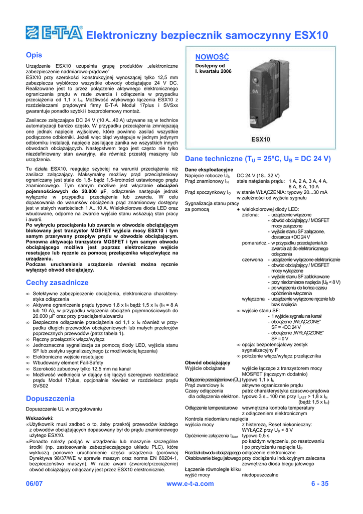 Elektroniczny bezpiecznik samoczynny ESX10 Opis NOWOŚĆ Urządzenie ESX10 uzupełnia grupę produktów „elektroniczne zabezpieczenie nadmiarowo-prądowe” ESX10 przy szerokości konstrukcyjnej wynoszącej tylko 12,5 mm zabezpiecza wybiórczo wszystkie obwody obciąŜające 24 V DC. Realizowane jest to przez połączenie aktywnego elektronicznego ograniczenia prądu w razie zwarcia i odłączenia w przypadku przeciąŜenia od 1,1 x IN. MoŜliwość wtykowego łączenia ESX10 z rozdzielaczami prądowymi firmy E-T-A Moduł 17plus i SVSxx gwarantuje ponadto szybki i bezproblemowy montaŜ. Dostępny od I. kwartału 2006 Zasilacze załączające DC 24 V (10 A...40 A) uŜywane są w technice automatyzacji bardzo często. W przypadku przeciąŜenia zmniejszają one jednak napięcie wyjściowe, które powinno zasilać wszystkie podłączone odbiorniki. JeŜeli więc błąd występuje w jednym jedynym odbiorniku instalacji, napięcie zasilające zanika we wszystkich innych obwodach obciąŜających. Następstwem tego jest często nie tylko niezdefiniowany stan awaryjny, ale równieŜ przestój maszyny lub urządzenia. Tu działa ESX10, reagując szybciej na warunki przeciąŜenia niŜ zasilacz załączający. Maksymalny moŜliwy prąd przeciąŜeniowy ograniczany jest stale do 1,8- bądź 1,5-krotności ustawionego prądu znamionowego. Tym samym moŜliwe jest włączanie obciąŜeń pojemnościowych do 20.000 µF, odłączenie następuje jednak wyłącznie w przypadku przeciąŜenia lub zwarcia. W celu dopasowania do warunków obciąŜenia prąd znamionowy dostępny jest w stałych wartościach 1 A...10 A. Wielokolorowa dioda LED oraz wbudowane, odporne na zwarcie wyjście stanu wskazują stan pracy i awarii. Po wykryciu przeciąŜenia lub zwarcia w obwodzie obciąŜającym blokowany jest tranzystor MOSFET wyjścia mocy ESX10 i tym samym przerywany przepływ prądu w obwodzie obciąŜającym. Ponowna aktywacja tranzystora MOSFET i tym samym obwodu obciąŜającego moŜliwa jest poprzez elektroniczne wejście resetujące lub ręcznie za pomocą przełącznika włącz/wyłącz na urządzeniu. Podczas uruchamiania urządzenia równieŜ moŜna ręcznie wyłączyć obwód obciąŜający. Cechy zasadnicze • Selektywne zabezpieczenie obciąŜenia, elektroniczna charakterystyka odłączenia • Aktywne ograniczenie prądu typowo 1,8 x IN bądź 1,5 x IN (IN = 8 A lub 10 A), w przypadku włączenia obciąŜeń pojemnościowych do 20.000 µF oraz przy przeciąŜeniu/zwarciu • Bezpieczne odłączenie przeciąŜenia od 1,1 x IN równieŜ w przypadku długich przewodów obciąŜeniowych lub małych przekrojów poprzecznych przewodów (patrz tabela 1). • Ręczny przełącznik włącz/wyłącz • Jednoznaczna sygnalizacja za pomocą diody LED, wyjścia stanu SF lub zestyku sygnalizacyjnego (z moŜliwością łączenia) • Elektroniczne wejście resetujące • Wbudowany element Fail-Safety • Szerokość zabudowy tylko 12,5 mm na kanał • MoŜliwość wetknięcia w dający się łączyć szeregowo rozdzielacz prądu Moduł 17plus, opcjonalnie równieŜ w rozdzielacz prądu SVS02 Dopuszczenia Dopuszczenie UL w przygotowaniu Wskazówki: • UŜytkownik musi zadbać o to, Ŝeby przekrój przewodów kaŜdego z obwodów obciąŜających dopasowany był do prądu znamionowego uŜytego ESX10. • Ponadto naleŜy podjąć w urządzeniu lub maszynie szczególne środki (np. zastosowanie zabezpieczającego układu PLC), które wykluczą ponowne uruchomienie części urządzenia (porównaj Dyrektywa 98/37/WE w sprawie maszyn oraz norma EN 60204-1, bezpieczeństwo maszyn). W razie awarii (zwarcie/przeciąŜenie) obwód obciąŜający odłączany jest przez ESX10 elektronicznie. 06/07 Dane techniczne (TU = 25ºC, UB = DC 24 V) Dane eksploatacyjne Napięcie robocze UB DC 24 V (18...32 V) Prąd znamionowy IN stałe natęŜenia prądu: 1 A, 2 A, 3 A, 4 A, 6 A, 8 A, 10 A Prąd spoczynkowy IO w stanie WŁĄCZENIA: typowy 20...30 mA w zaleŜności od wyjścia sygnału Sygnalizacja stanu pracy za pomocą ● wielokolorowej diody LED: zielona: - urządzenie włączone - obwód obciąŜający / MOSFET mocy załączone - wyjście stanu SF załączone, dostarcza +DC 24 V pomarańcz. - w przypadku przeciąŜenia lub zwarcia aŜ do elektronicznego odłączenia czerwona - urządzenie wyłączone elektronicznie - obwód obciąŜający / MOSFET mocy wyłączone - wyjście stanu SF zablokowane - przy niedomiarze napięcia (UB < 8 V) - po włączeniu do końca czasu opóźnienia włączenia wyłączona - urządzenie wyłączone ręcznie lub brak napięcia • wyjście stanu SF: - 1 wyjście sygnału na kanał - obciąŜenie „WŁĄCZONE” SF = +DC 24 V - obciąŜenie „WYŁĄCZONE” SF = 0 V • opcja: bezpotencjałowy zestyk sygnalizacyjny F • połoŜenie włącz/wyłącz przełącznika Obwód obciąŜający Wyjście obciąŜane wyjście łączące z tranzystorem mocy MOSFET (łączącym dodatnio) Odłączenie przeciąŜeniowe (ÜL) typowo 1,1 x IN Prąd zwarciowy IK aktywne ograniczenie prądu Czasy odłączenia patrz charakterystyka czasowo-prądowa dla odłączenia elektron. typowo 3 s...100 ms przy ILAST > 1,8 x IN (bądź 1,5 x IN) Odłączenie temperaturowe wewnętrzna kontrola temperatury z odłączeniem elektronicznym Kontrola niedomiaru napięcia wyjścia mocy z histerezą, Reset niekonieczny: WYŁĄCZ przy UB < 8 V Opóźnienie załączenia tStart typowo 0,5 s po kaŜdym włączeniu, po resetowaniu i po przyłoŜeniu napięcia UB Rozdział obwodu obciąŜającego odłączenie elektroniczne Okablowanie biegu jałowego przy obciąŜeniu indukcyjnym zalecana zewnętrzna dioda biegu jałowego Łączenie równoległe kilku wyjść mocy niedopuszczalne www.e-t-a.com 6 - 35 Elektroniczny bezpiecznik samoczynny ESX10 Dane techniczne (TU = 25ºC, UB = DC 24 V) Dane techniczne (TU = 25ºC, UB = DC 24 V) Wyjście stanu SF Dane elektryczne Wymagania w zakresie emisja zakłóceń: EN 50081-1 tolerancji elektromagnetycznej o