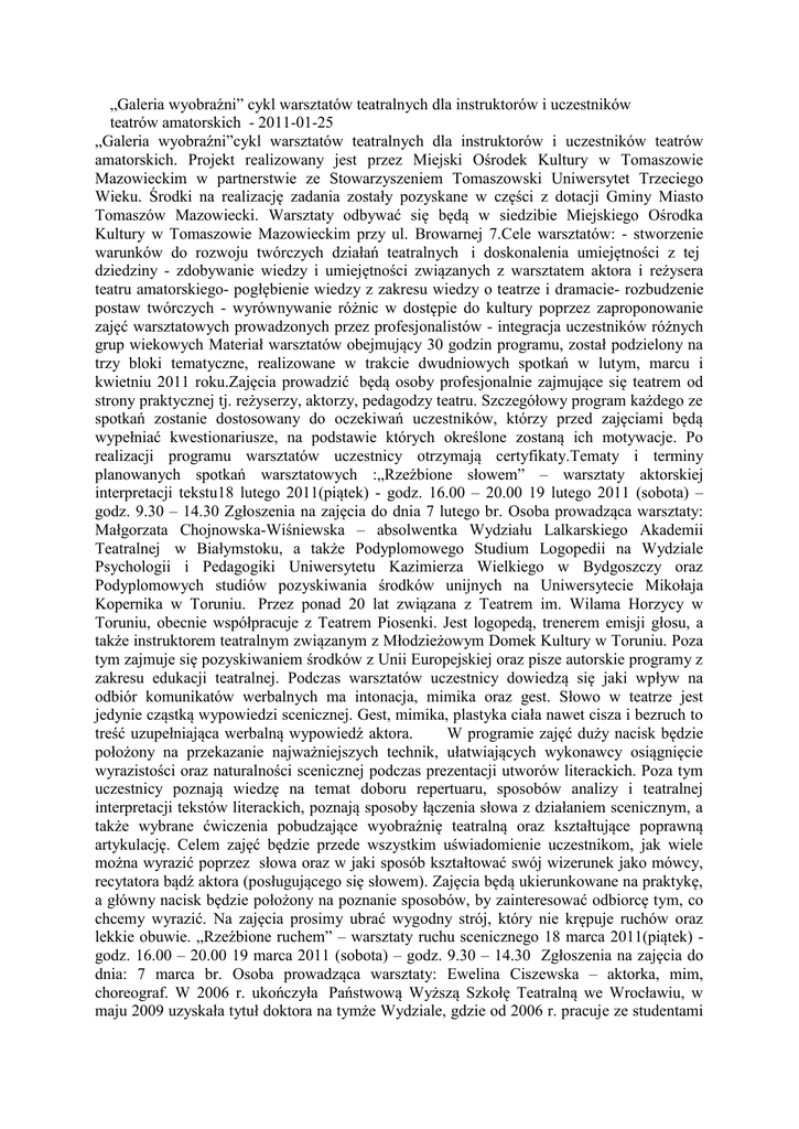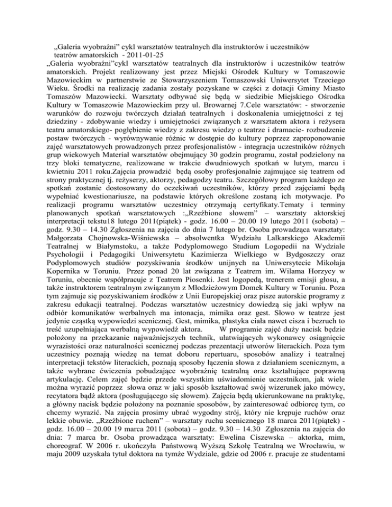 „Galeria wyobraźni” cykl warsztatów teatralnych dla instruktorów i uczestników teatrów amatorskich - 2011-01-25 „Galeria wyobraźni”cykl warsztatów teatralnych dla instruktorów i uczestników teatrów amatorskich. Projekt realizowany jest przez Miejski Ośrodek Kultury w Tomaszowie Mazowieckim w partnerstwie ze Stowarzyszeniem Tomaszowski Uniwersytet Trzeciego Wieku. Środki na realizację zadania zostały pozyskane w części z dotacji Gminy Miasto Tomaszów Mazowiecki. Warsztaty odbywać się będą w siedzibie Miejskiego Ośrodka Kultury w Tomaszowie Mazowieckim przy ul. Browarnej 7.Cele warsztatów: - stworzenie warunków do rozwoju twórczych działań teatralnych i doskonalenia umiejętności z tej dziedziny - zdobywanie wiedzy i umiejętności związanych z warsztatem aktora i reżysera teatru amatorskiego- pogłębienie wiedzy z zakresu wiedzy o teatrze i dramacie- rozbudzenie postaw twórczych - wyrównywanie różnic w dostępie do kultury poprzez zaproponowanie zajęć warsztatowych prowadzonych przez profesjonalistów - integracja uczestników różnych grup wiekowych Materiał warsztatów obejmujący 30 godzin programu, został podzielony na trzy bloki tematyczne, realizowane w trakcie dwudniowych spotkań w lutym, marcu i kwietniu 2011 roku.Zajęcia prowadzić będą osoby profesjonalnie zajmujące się teatrem od strony praktycznej tj. reżyserzy, aktorzy, pedagodzy teatru. Szczegółowy program każdego ze spotkań zostanie dostosowany do oczekiwań uczestników, którzy przed zajęciami będą wypełniać kwestionariusze, na podstawie których określone zostaną ich motywacje. Po realizacji programu warsztatów uczestnicy otrzymają certyfikaty.Tematy i terminy planowanych spotkań warsztatowych :„Rzeźbione słowem” – warsztaty aktorskiej interpretacji tekstu18 lutego 2011(piątek) - godz. 16.00 – 20.00 19 lutego 2011 (sobota) – godz. 9.30 – 14.30 Zgłoszenia na zajęcia do dnia 7 lutego br. Osoba prowadząca warsztaty: Małgorzata Chojnowska-Wiśniewska – absolwentka Wydziału Lalkarskiego Akademii Teatralnej w Białymstoku, a także Podyplomowego Studium Logopedii na Wydziale Psychologii i Pedagogiki Uniwersytetu Kazimierza Wielkiego w Bydgoszczy oraz Podyplomowych studiów pozyskiwania środków unijnych na Uniwersytecie Mikołaja Kopernika w Toruniu. Przez ponad 20 lat związana z Teatrem im. Wilama Horzycy w Toruniu, obecnie współpracuje z Teatrem Piosenki. Jest logopedą, trenerem emisji głosu, a także instruktorem teatralnym związanym z Młodzieżowym Domek Kultury w Toruniu. Poza tym zajmuje się pozyskiwaniem środków z Unii Europejskiej oraz pisze autorskie programy z zakresu edukacji teatralnej. Podczas warsztatów uczestnicy dowiedzą się jaki wpływ na odbiór komunikatów werbalnych ma intonacja, mimika oraz gest. Słowo w teatrze jest jedynie cząstką wypowiedzi scenicznej. Gest, mimika, plastyka ciała nawet cisza i bezruch to treść uzupełniająca werbalną wypowiedź aktora. W programie zajęć duży nacisk będzie położony na przekazanie najważniejszych technik, ułatwiających wykonawcy osiągnięcie wyrazistości oraz naturalności scenicznej podczas prezentacji utworów literackich. Poza tym uczestnicy poznają wiedzę na temat doboru repertuaru, sposobów analizy i teatralnej interpretacji tekstów literackich, poznają sposoby łączenia słowa z działaniem scenicznym, a także wybrane ćwiczenia pobudzające wyobraźnię teatralną oraz kształtujące poprawną artykulację. Celem zajęć będzie przede wszystkim uświadomienie uczestnikom, jak wiele można wyrazić poprzez słowa oraz w jaki sposób kształtować swój wizerunek jako mówcy, recytatora bądź aktora (posługującego się słowem). Zajęcia będą ukierunkowane na praktykę, a główny nacisk będzie położony na poznanie sposobów, by zainteresować odbiorcę tym, co chcemy wyrazić. Na zajęcia prosimy ubrać wygodny strój, który nie krępuje ruchów oraz lekkie obuwie. „Rzeźbione ruchem” – warsztaty ruchu scenicznego 18 marca 2011(piątek) godz. 16.00 – 20.00 19 marca 2011 (sobota) – godz. 9.30 – 14.30 Zgłoszenia na zajęcia do dnia: 7 marca br. Osoba prowadząca warsztaty: Ewelina Ciszewska – aktorka, mim, choreograf. W 2006 r. ukończyła Państwową Wyższą Szkołę Teatralną we Wrocławiu, w maju 2009 uzyskała tytuł doktora na tymże Wydziale, gdzie od 2006 r. pracuje ze studentami nad plastyką ruchu scenicznego oraz interpretacją wiersza. Prowadzi warsztaty pantomimy i ekspresji ruchowej w kraju i za granicą. Od kilku lat zajmuje się sztuką performance. Swoje umiejętności i myślenie o ciele wykorzystuje podczas pracy nad choreografią do spektakli dramatycznych, muzycznych i lalkowych. Współpracowała m.in. z lubelskim Andersenem (2008), wałbrzyskim Teatrem Lalki i Aktora (2009), szczecińską Pleciugą (2009) i warszawskim Bajem (2010) . Podczas zajęć uczestnicy poznają ćwiczenia rozwijające plastykę ciała, pogłębiające świadomość znaków pozawerbalnych oraz ułatwiające pokonanie wewnętrznych oporów związanych z ekspresją ruchową. Poza tym dowiedzą się, w jaki sposób budować proste układy choreograficzne oraz łączyć słowo z ruchem, tak aby komponować ciekawe i dynamiczne obrazy sceniczne. Uczestnicy dowiedzą się również, w jaki sposób rozwijać wyobraźnię teatralną, doskonalić wyczucie rytmu i tempa sceny, rozwijać umiejętność kreatywnego reagowania na impulsy płynące od partnera i grupy. Na zajęcia prosimy ubrać wygodny strój, który nie krępuje ruchów oraz lekkie obuwie. „Rzeźbione działaniem” – warsztaty teatru groteski 15 kwietnia 2011(piątek) - godz. 16.00 – 20.00 16 kwietnia 2011 (sobota) – godz. 9.30 – 14.30 Zgłoszenia na zajęcia do dnia 4 kwietnia br. Osoba prowadząca warsztaty: Aneta Głuch-Klucznik: absolwentka Wydziału Lalkarskiego Państwowej Wyższej Szkoły Teatralnej we Wrocławiu. Od 1992 aktorka Wrocławskieg