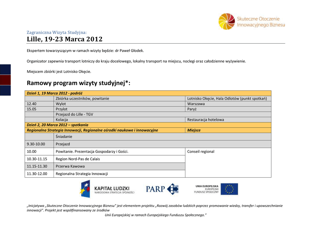 Zagraniczna Wizyta Studyjna: Lille, 19-23 Marca 2012 Ekspertem towarzyszącym w ramach wizyty będzie: dr Paweł Głodek. Organizator zapewnia transport lotniczy do kraju docelowego, lokalny transport na miejscu, noclegi oraz całodzienne wyżywienie. Miejscem zbiórki jest Lotnisko Okęcie. Ramowy program wizyty studyjnej*: Dzień 1, 19 Marca 2012 - podróż Zbiórka uczestników, powitanie 12.40 Wylot 15.05 Przylot Przejazd do Lille - TGV Kolacja Dzień 2, 20 Marca 2012 – spotkania Regionalna Strategia Innowacji, Regionalne ośrodki naukowe i innowacyjne Lotnisko Okęcie, Hala Odlotów (punkt spotkao) Warszawa Paryż Restauracja hotelowa Miejsce Śniadanie 9.30-10.00 Przejazd 10.00 Powitanie. Prezentacja Gospodarzy i Gości. 10.30-11.15 Region Nord-Pas de Calais 11.15-11.30 Przerwa Kawowa 11.30-12.00 Regionalna Strategia Innowacji Conseil regional „Inicjatywa „Skuteczne Otoczenie Innowacyjnego Biznesu” jest elementem projektu „Rozwój zasobów ludzkich poprzez promowanie wiedzy, transfer i upowszechnianie innowacji”. Projekt jest współfinansowany ze środków Unii Europejskiej w ramach Europejskiego Funduszu Społecznego.” 12.00-12.30 Rola i zadania sieci J’innove http://www.jinnove.net/ 12.30-14.00 Lunch 14.00-15.15 Prezentacja głównych projektów i programów B+R w regionie 15.15-15.30 Przerwa kawowa 15.30-16.00 Prezentacja Regionalnego Systemu Transferu Technologii 16.00-16.30 Instytut Pasteur de Lille PRES http://www.univ-lille-nord-defrance.fr/PRESNPDC/index.html Przejazd do Hotelu Czas wolny Kolacja Dzień 3, 21 Marca 2012 – spotkania Haute Borne Science Park Miejsce Śniadanie 9.30-10.00 Przejazd 10.00-11.00 Haute Borne Science Park http://en.parc-haute-borne.fr/default_us.asp 11.00-11.30 Przejazd 11.30-12.30 Eurasanté Pôle Nutrition Santé Longevité bio-incubator http://www.eurasante.com/en/eurasante/who-we-are.html Haute Borne Science Park Eurasanté „Inicjatywa „Skuteczne Otoczenie Innowacyjnego Biznesu” jest elementem projektu „Rozwój zasobów ludzkich poprzez promowanie wiedzy, transfer i upowszechnianie innowacji”. Projekt jest współfinansowany ze środków Unii Europejskiej w ramach Europejskiego Funduszu Społecznego.” 12.30-14.00 Lunch 14.00-14.30 EuraTechnologies http://www.euratechnologies.com/en/euratechnologiesdevelopment/mission 14.30-15.00 EuraTechnologies EuraRFID http://mathieuschatzler.prosite.com/3649/13468/portfolio/citceurarfid INRIA http://www.inria.fr/en/ 15.00-15.30 Przejazd 15.30-16.30 Plaine images http://www.plaine-images.fr/teaser/index.html Plaine images Przejazd do Hotelu Czas wolny Kolacja Dzień 4, 22 Marca 2012 – spotkania Miejsce Śniadanie 9.30-10.30 Przejazd 10.30-11.00 Valenciennes Technopole 11.00-11.15 University of Valenciennes 11.15-11.30 Przerwa kawowa Valenciennes Technopole „Inicjatywa „Skuteczne Otoczenie Innowacyjnego Biznesu” jest elementem projektu „Rozwój zasobów ludzkich poprzez promowanie wiedzy, transfer i upowszechnianie innowacji”. Projekt jest współfinansowany ze środków Unii Europejskiej w ramach Europejskiego Funduszu Społecznego.” 11.30-12.00 ARIA (automotive) cluster 12.00-12.30 I-TRANS (railway) competitiveness pôle 12.30-15.15 Lunch i podróż 15.15-16.30 Podsumowanie NFID (Nord France Innovation Développement) Przejazd do Hotelu Czas wolny Kolacja Dzień 5, 23 Marca 2012 – podróż Śniadanie Przejazd na lotnisko - TGV 16.00 Wylot Paryż 18.15 Przylot Warszawa Zakooczenie wizyty studyjnej, pożegnanie * Program może ulec jeszcze zmianom. „Inicjatywa „Skuteczne Otoczenie Innowacyjnego Biznesu” jest elementem projektu „Rozwój zasobów ludzkich poprzez promowanie wiedzy, transfer i upowszechnianie innowacji”. Projekt jest współfinansowany ze środków Unii Europejskiej w ramach Europejskiego Funduszu Społecznego.”