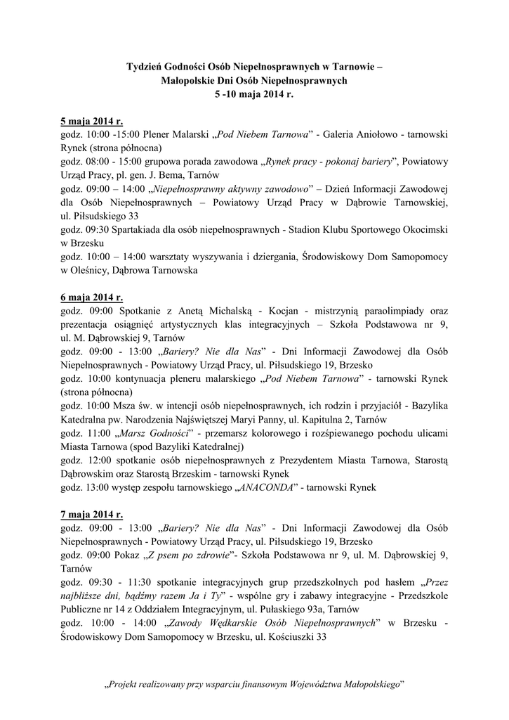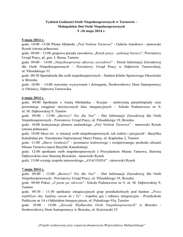 Tydzień Godności Osób Niepełnosprawnych w Tarnowie – Małopolskie Dni Osób Niepełnosprawnych 5 -10 maja 2014 r. 5 maja 2014 r. godz. 10:00 -15:00 Plener Malarski „Pod Niebem Tarnowa” - Galeria Aniołowo - tarnowski Rynek (strona północna) godz. 08:00 - 15:00 grupowa porada zawodowa „Rynek pracy - pokonaj bariery”, Powiatowy Urząd Pracy, pl. gen. J. Bema, Tarnów godz. 09:00 – 14:00 „Niepełnosprawny aktywny zawodowo” – Dzień Informacji Zawodowej dla Osób Niepełnosprawnych – Powiatowy Urząd Pracy w Dąbrowie Tarnowskiej, ul. Piłsudskiego 33 godz. 09:30 Spartakiada dla osób niepełnosprawnych - Stadion Klubu Sportowego Okocimski w Brzesku godz. 10:00 – 14:00 warsztaty wyszywania i dziergania, Środowiskowy Dom Samopomocy w Oleśnicy, Dąbrowa Tarnowska 6 maja 2014 r. godz. 09:00 Spotkanie z Anetą Michalską - Kocjan - mistrzynią paraolimpiady oraz prezentacja osiągnięć artystycznych klas integracyjnych – Szkoła Podstawowa nr 9, ul. M. Dąbrowskiej 9, Tarnów godz. 09:00 - 13:00 „Bariery? Nie dla Nas” - Dni Informacji Zawodowej dla Osób Niepełnosprawnych - Powiatowy Urząd Pracy, ul. Piłsudskiego 19, Brzesko godz. 10:00 kontynuacja pleneru malarskiego „Pod Niebem Tarnowa” - tarnowski Rynek (strona północna) godz. 10:00 Msza św. w intencji osób niepełnosprawnych, ich rodzin i przyjaciół - Bazylika Katedralna pw. Narodzenia Najświętszej Maryi Panny, ul. Kapitulna 2, Tarnów godz. 11:00 „Marsz Godności” - przemarsz kolorowego i rozśpiewanego pochodu ulicami Miasta Tarnowa (spod Bazyliki Katedralnej) godz. 12:00 spotkanie osób niepełnosprawnych z Prezydentem Miasta Tarnowa, Starostą Dąbrowskim oraz Starostą Brzeskim - tarnowski Rynek godz. 13:00 występ zespołu tarnowskiego „ANACONDA” - tarnowski Rynek 7 maja 2014 r. godz. 09:00 - 13:00 „Bariery? Nie dla Nas” - Dni Informacji Zawodowej dla Osób Niepełnosprawnych - Powiatowy Urząd Pracy, ul. Piłsudskiego 19, Brzesko godz. 09:00 Pokaz „Z psem po zdrowie”- Szkoła Podstawowa nr 9, ul. M. Dąbrowskiej 9, Tarnów godz. 09:30 - 11:30 spotkanie integracyjnych grup przedszkolnych pod hasłem „Przez najbliższe dni, bądźmy razem Ja i Ty” - wspólne gry i zabawy integracyjne - Przedszkole Publiczne nr 14 z Oddziałem Integracyjnym, ul. Pułaskiego 93a, Tarnów godz. 10:00 - 14:00 „Zawody Wędkarskie Osób Niepełnosprawnych” w Brzesku Środowiskowy Dom Samopomocy w Brzesku, ul. Kościuszki 33 „Projekt realizowany przy wsparciu finansowym Województwa Małopolskiego” godz. 10:00 - 14:00 „I Miting Pływacki” Warsztatów Terapii Zajęciowej w Dąbrowie Tarnowskiej - basen M-GOSIR, ul. Sportowa 4, Dąbrowa Tarnowska godz. 09:00 - 15:00 Impreza plenerowa na terenie Zamku w Dębnie – zwiedzanie obiektu 8 maja 2014 r. godz. 09:00 - 13:00 XII Powiatowy Integracyjny Konkurs Recytatorski im. J. Korczaka „Bajki, które uczą i bawią” - Zespół Szkół Ogólnokształcących nr 6, ul. Bandrowskiego 4, Tarnów godz. 9:00 „Integracyjny turniej tenisa stołowego” - Specjalny Ośrodek Szkolno Wychowawczy w Tarnowie, ul. Romanowicza 9 godz. 09:00 „Festiwal umiejętności” - zabawy i gry integracyjne, Specjalny Ośrodek Szkolno - Wychowawczy w Tarnowie, ul. Romanowicza 9 godz. 09:30 - 11:30 spotkanie integracyjnych grup przedszkolnych pod hasłem „Przez najbliższe dni, bądźmy razem Ja i Ty” - wspólne gry i zabawy integracyjne - Przedszkole Publiczne nr 14 z Oddziałem Integracyjnym, ul. Pułaskiego 93a, Tarnów godz. 09:30 - 12:30 „I Powiatowe Warsztaty Artystyczne dla Dzieci i Młodzieży”, Kupienin 35 godz. 10:00 - 13:00 Spotkanie rekreacyjno - turystyczne na terenie powiatu Dąbrowskiego (Zwiedzanie Ośrodka Spotkań Kultur w Dąbrowie Tarnowskiej, ul B. Joselewicza 6 oraz „Malowanej Wsi” w Zalipiu, warsztaty rękodzieła) godz. 10:00 - 14:00 „Majówka osób niepełnosprawnych” w Złotej - Specjalny Ośrodek Szkolno – Wychowawczy, Złota 292 godz. 11:00 - 14:00 Akcja społeczna „Niepełnosprawny - przekonaj się jak to jest!” – Stowarzyszenie Medycyna Polska, Tarnów - plac Sobieskiego, plac Szczepanika, plac przy UMT (fontanna przy ul. Mickiewicza). godz. 13:30 - 16:00 „Piknik Integracyjny w Centrum Polonii” - Ośrodku Kultury, Turystyki i Rekreacji w Brniu, Breń 1 9 maja 2014 r. godz. 09:00 - 11:00 „I ty możesz zostać mistrzem” - zajęcia integracyjne dla dzieci i młodzieży - Gimnazjum nr 1 w Zespole szkół Ogólnokształcących nr 5, Reymonta 30, Tarnów godz. 10:00 - 14:00 Konferencja „Mam Prawo”, dotycząca aspektów prawnych związanych z niepełnosprawnością z udziałem Prokuratora Generalnego Andrzeja Seremeta oraz Ministra Pracy i Polityki Społecznej Władysława Kosiniaka - Kamysza - Państwowa Wyższa Szkoła Zawodowa, ul. Mickiewicza 8, Tarnów (budynek C) godz. 10:00 - 14:00 „IV Ogólnopolski Mityng Pływacki Osób z Niepełną Sprawnością” basen Państwowej Wyższej Szkoły Zawodowej, ul. Mickiewicza 8, Tarnów godz. 17:00 Wernisaż wystawy poplenerowej „Pod Niebem Tarnowa” - Galeria Aniołowo, ul. Żydowska 2, Tarnów 10 maja 2014 r. godz. 13:00 Festyn w Parku Strzeleckim - plac zabaw: 1. Występy artystyczne na scenie: „Projekt realizowany przy wsparciu finansowym Województwa Małopolskiego” 2. 3. 4. 5. 6. 7. 8. 9. 10. 11. 12. 13. 14. 15. 16. zespół wokalno - taneczny DO-RE-MI, SOS -W w Tarnowie, grupa integracyjna Warsztat Terapii Zajęciowej im. Jana Pawła II Fundacji REPI i Pałacu Młodzieży “Albatros", grupa "Przyjaciele" WTZ PSOUU Koło w Tarnowie, prezentacja artystyczna Przedszkola Integracyjnego nr 14 w Tarnowie, grupa Warsztatów Terapii Zajęciowej w Brzesku, zespół teatralno – muzyczny „Zawadiaki” Warsztatów Terapii Zajęciowej w Zawadzie Uszewskiej, zespół teatralny „Tacy sami” Środowiskowego Domu Samopomocy w Brzesku. Animacje i zabawy. Konkurs taneczny “Do tanga trzeba dwojga”. Gry i zabawy ruchowo - sportowe. Foto - budka. Po