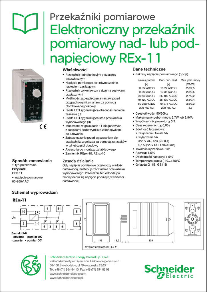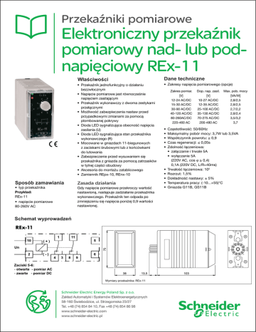 Przekaźniki pomiarowe Elektroniczny przekaźnik pomiarowy nad- lub podnapięciowy REx-11 W³aœciwoœci • Przekaźnik jednofunkcyjny o działaniu bezzwłocznym • Napięcie pomiarowe jest równocześnie napięciem zasilającym • Przekaźnik wykonawczy z dwoma zestykami przełącznymi • Możliwość zabezpieczenia nastaw przed przypadkowymi zmianami za pomocą plombowanej pokrywy • Dioda LED sygnalizująca obecność napięcia zasilania (U) • Dioda LED sygnalizująca stan przekaźnika wykonawczego (R) • Mocowane w gniazdach 11-biegunowych z zaciskami śrubowymi lub z końcówkami do lutowania • Zabezpieczenie przed wysuwaniem się przekaźnika z gniazda za pomocą zatrzasków w tylnej części obudowy • Akcesoria do montażu zatablicowego • Zamiennik REpx-10, REnx-10 Sposób zamawiania • typ przekaźnika Przykład: REx-11 • napięcie pomiarowe 80-260V AC Zasada działania Gdy napięcie pomiarowe przekroczy wartość nastawioną, następuje zadziałanie przekaźnika wykonawczego. Przekaźnik ten odpada po zmniejszeniu się napięcia poniżej 0,9 wartości nastawionej. Schemat wyprowadzeñ Wymiary przekaźnika: REx-11 Schneider Electric Energy Poland Sp. z o.o. Zakład Automatyki i Systemów Elektroenergetycznych 58-160 Świebodzice, ul. Strzegomska 23/27 Tel. +48 (74) 854 84 10, Fax +48 (74) 854 86 98 www.schneider-electric.com www.schneider-electric.pl Dane techniczne • Zakresy napięcia pomiarowego (opcje) Zakres pomiar. [V] 12-24 AC/DC 15-30 AC/DC 30-90 AC/DC 40-120 AC/DC 80-260AC/DC 220-460 AC • • • • • • • • • • Dop. nap. zasil. [V] 10-27 AC/DC 12-35 AC/DC 25-100 AC/DC 35-130 AC/DC 70-275 AC/DC 200-480 AC Max. pob. mocy [VA/W] 2,8/2,5 2,8/2,5 2,7/2,2 2,8/2,4 3,5/3,2 3,7 Częstotliwość: 50/60Hz Maksymalny pobór mocy: 3,7W lub 3,5VA Współczynnik powrotu: ≥ 0,9 Czas regeneracji: ≤ 0,05s Zdolność łączeniowa: • załączanie i trwale 5A • wyłączanie 5A (220V AC, cos j ≥ 0,4) 0,1A (220V DC, L/R=40ms) Trwałość łączeniowa: 105 Rozrzut: 1,5% Dokładność nastawy: ± 5% Temperatura pracy: (-10...+55)°C Gniazda G11B, GS11B