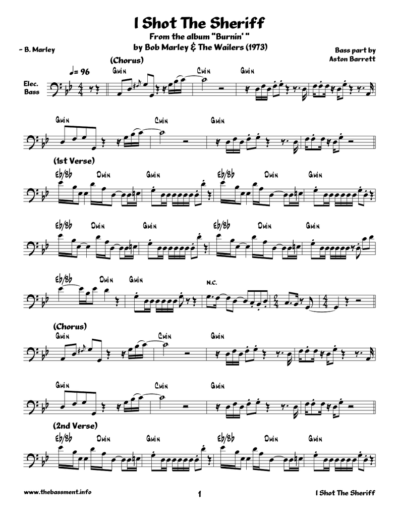 I Shot The Sheriff From the album "Burnin' " by Bob Marley & The Wailers (1973) - B. Marley (Chorus) G min œ Œ≈ œ œ œ ? b b 44 ‰ Œ ã 96 Elec. Bass G min ? bb œ œ œ œ (1st Verse) E b/B b Œ ≈ j #œ œœ œ C min œœœ ˙ C min ˙ Ó G min Bass part by Aston Barrett G min . .. . ≈ œ œ œ œ œ Œ ‰ . œ œ œ œ ≈ œ œ Œ ‰ . œr R . . . . ≈ œ œ œ œ œ Œ ‰. œ œ œ œ ≈ œ œ Ó R Ó b b G min D min G min . Eœ/B œ œ œ D min œ œ . . . œ ? bb œ œ œ œ œ œ n œ œ œ œ œ œ œ œ œ. Œ œ œ œ œ œ œ n œ œ œ œ œ œ œ œ œ œ. Œ E b/B b D min E b/B b œ œ œ D min œ G min E b/B b D min G min œ œ œ œ œ œœ œœ . . œ œ œ . . ? bb œ œ œ œ œ œœ n œ œœ œ œ œœ œ Œ œ œœ n œ œœœœœœ ‰. œ J ? bb ? bb œ G min (Chorus) Œ œ Œ ≈ œ œ œ j #œ G min ? bb œ œ œ E b/B b œ (2nd Verse) G min œ. œ. œ œ œ œ œ œ J ‰ Œ œ . œ œ œ œ œ. œ œ. 42 œ . œ ‰ œj 44 œ Œ Ó . œœ œ œœ œ Œ ≈ œ. C min ˙ C min ˙ N.C. G min . . . . ≈ œ œ œ œ œ Œ ‰ . œ œ œ œ ≈ œ œ Œ ‰ . œr R Ó G min . . . . ≈ œ œ œ œ œ Œ ‰. œ œ œ œ ≈ œ œ Ó R Ó b b G min D min G min . Eœ/B œ œ œ D min œ œ . . . œ ? bb œ œ œ œ œ œ n œ œ œ œ œ œ œ œ œ. Œ œ œ œ œ œ œ n œ œ œ œ œ œ œ œ œ œ. Œ www.thebassment.info 1 I Shot The Sheriff I Shot The Sheriff E b/B b b b G min D min G min . Eœ/B œ œ D min œœ œ œ œœ . . œ œ œ œ . ? bb œ œ œ œ œ œœ n œ œœ œ œ œœ œ Œ œ œœ n œ œœœœœœ ‰. œ J ? bb E b/B b œ D min œœœ œ G min œ œ. œ œ. œ œ ≈ œ œ. Œ œ . œ œ œ œ œ 2 œ. œ . 4 œ . œ ‰ œj 44 œ Œ Ó . Œ (Chorus) ? bb G min œ Œ ≈ œ œ œ j #œ G min ? bb œ œ œ E b/B b œ Œ ≈ N.C. œœ œ œœœ C min ˙ C min ˙ G min . . . . ≈ œ œ œ œ œ Œ ‰ . œ œ œ œ ≈ œ œ Œ ‰ . œr R Ó G min . . . . ≈ œ œ œ œ œ Œ ‰. œ œ œ œ ≈ œ œ Ó R Ó b b (3rd Verse) G min D min G min . Eœ/B œ œ œ D min œ œ . . . œ ? bb œ œ œ œ œ œ n œ œ œ œ œ œ œ œ œ. Œ œ œ œ œ œ œ n œ œ œ œ œ œ œ œ œ œ. Œ E b/B b b b G min E /B D min G min œ œ D min œœ œ. œ œ œ œ œœ . . œ œ . ? bb œ œ œ œ œ œœ n œ œœ œ œ œœ œ Œ œ œœ n œ œœœœœœ ‰. œ J ? bb E b/B b œ D min œœœ œ ? b b 44 œ www.thebassment.info Œ œ œ. œ œ. œ œ ≈ œ œ. Œ Œ œ. œ œ œ œ œ œ 2 œ ‰ j 4 . œ. . 4 . œ œ 4 N.C. ∑ Ó 2 42 ∑ 44 I Shot The Sheriff I Shot The Sheriff (Chorus) G min ? b b 44 œœ œ œ œŒ ≈ œœ œ G min œ ? bb œ œ œ Œ ≈ œ œ œ C min ˙ C min ˙ G min . . . . ≈ œ œ œ œ œ Œ ‰ . œ œ œ œ ≈ œ œ Œ ‰ . œr R Ó G min . . . . ≈ œ œ œ œ œ Œ ‰. œ œ œ œ ≈ œ œ Ó R Ó (4th Verse) E b/B b b b E b/B b b b G min D min G min . Eœ/B œ œ œ D min œ œ . . . œ ? bb œ œ œ œ œ œ n œ œ œ œ œ œ œ œ œ. Œ œ œ œ œ œœ n œ œ œ œ œ œ œ œ œ œ. Œ G min D min G min . Eœ/B œ œ œ D min œ œ œœ . . œ œ œ œ œ œ . ? bb œœ œœ œ œœnœ œœ œ œœ œ œ Œ œ œœnœ œœœœœœ œ ? bb E b/B b D min ˙ ˙ G min œ œ. œ œ. œ œ Ó (Outro Chorus) G min œ Œ ≈ ? b b .. œ œ œ j #œ G min ? bb œ œ œ Œ ≈ œ www.thebassment.info œœ œ œœ œ œ. œ œ œ œ œ. œ œ. 42 œ . œ ‰ œj 44 œ Œ Ó . N.C. C min ˙ C min ˙ G min . . . . ≈ œ œ œ œ œ Œ ‰ . œ œ œ œ ≈ œ œ Œ ‰ . œr R Ó G min . . . . ≈ œ œ œ œ œ Œ ‰. œ œ œ œ ≈ œ œ Ó Ó Repeat to fade R 3 .. I Shot The Sheriff I Shot The Sheriff ? bb ∑ ∑ ∑ ∑ ? bb ∑ ∑ ∑ ∑ ? bb ∑ ∑ ∑ ∑ ? bb ∑ ∑ ? bb ∑ ∑ ∑ ∑ ? bb ∑ ∑ ∑ ∑ ? bb ∑ ∑ ∑ ∑ www.thebassment.info 4 I Shot The Sheriff I Shot The Sheriff (3rd Verse) ? bb ∑ ∑ ∑ ∑ ? bb ∑ ∑ ∑ ∑ ? bb ∑ ∑ ∑ ∑ (Chorus) ? bb ∑ ∑ ∑ ∑ ? bb ∑ ∑ ∑ ∑ ? bb ∑ ∑ ∑ ∑ ? bb ∑ ∑ ∑ ∑ www.thebassment.info 5 I Shot The Sheriff I Shot The Sheriff ? bb ∑ ∑ ∑ ∑ ? bb ∑ ∑ ∑ ∑ ? bb ∑ ∑ ∑ ∑ ? bb ∑ ∑ ∑ ∑ ? bb ∑ ∑ ∑ ∑ ? bb ∑ ∑ ∑ ∑ ? bb ∑ ∑ ∑ ∑ (Outro) (Fade out) www.thebassment.info 6 I Shot The Sheriff I Shot The Sheriff ? bb ∑ ∑ ∑ ∑ ? bb ∑ ∑ ∑ ∑ ? bb ∑ ∑ ∑ ∑ ? bb ∑ ∑ ∑ ∑ ? bb ∑ ∑ ∑ ∑ ? bb ∑ ∑ ∑ ∑ ? bb ∑ ∑ ∑ ∑ I Shot The Sheriff ? bb ? bb ∑ ∑ ∑ ∑ ∑