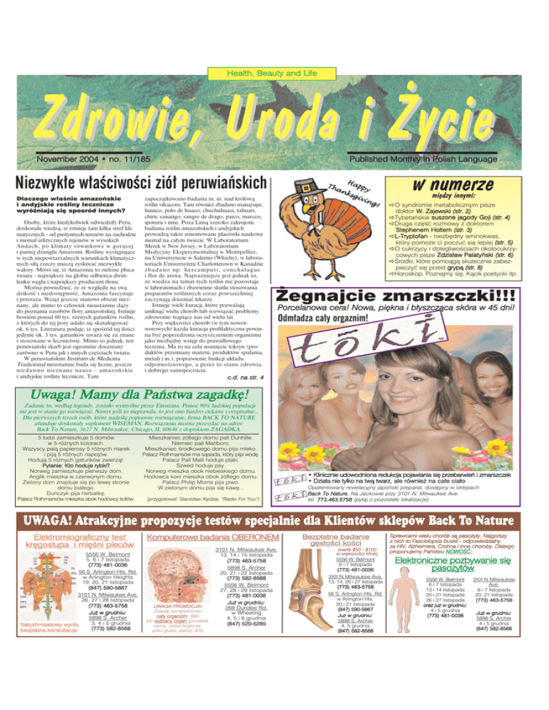 Health, Beauty and Life Zdrowie, Uroda i Życie Published Monthly in Polish Language November 2004 • no. 11/185 Niezwykłe właściwości ziół peruwiańskich Dlaczego właśnie amazońskie i andyjskie rośliny lecznicze wyróżniają się sposród innych? Osoby, które kiedykolwiek odwiedziły Peru, doskonale wiedzą, iż istnieje tam kilka stref klimatycznych - od pustynnych terenów na zachodzie i niemal arktycznych rejonów w wysokich Andach, po klimaty równikowe w gorącej i parnej dżunglii Amazonii. Rośliny występujące w tych niepowtarzalnych warunkach klimatycznych siłą rzeczy muszą zyskiwać niezwykłe walory. Mówi się, iż Amazonia to zielone płuca świata - największy na globie odbiorca dwutlenku węgla i największy producent tlenu. Można powiedzieć, że ze względu na swą dzikość i niedostępność, Amazonia fascynuje i przeraża. Wciąż jeszcze stanowi obszar nieznany, ale mimo to człowiek nieustannie dąży do poznania zasobów flory amazońskiej. Istnieje bowiem ponad 60 tys. różnych gatunków roślin, z których do tej pory udało się skatalogować ok. 6 tys. Literatura podaje, iż spośród tej ilości jedynie ok. 3 tys. gatunków uważa się za znane i stosowane w lecznictwie. Mimo to jednak, ten peruwiański skarb jest ogromnie doceniany zarówno w Peru jak i innych częściach świata. W peruwiańskim Instituto de Medicina Tradicional nieustannie bada się liczne, jeszcze niedawno nieznane nauce - amazońskie i andyjskie rośliny lecznicze. Tam zapoczątkowano badania m. in. nad królową roślin vilcacora. Tam również zbadano manayupe, huinco, polo de huaco, chuchuhuasi, tahuari, chiric sanango, sangre de drago, paico, marcco, iporuru i inne. Poza Limą szeroko zakrojone badania roślin amazońskich i andyjskich prowadzą także renomowane placówki naukowe niemal na całym świecie. W Laboratorium Merek w New Jersey, w Laboratorium Medycyny Eksperymentalnej w Montpellier, na Uniwersytecie w Salerno (Włochy), w laboratoriach Uniwersytetu Charlottetown w Kanadzie zbadano np. hercampuri, conchalague i flor de arena. Najważniejsze jest jednak to, że wiedza na temat tych roślin nie pozostaje w laboratoriach i zbawienne skutki stosowania preparatów roślinnych coraz powszechniej zaczynają doceniać lekarze. Istnieje wiele kuracji, które pozwalają uniknąć wielu chorób lub rozwiązać problemy zdrowotne trapiące nas od wielu lat. Przy większości chorób (w tym nowotworowych) każda kuracja profilaktyczna powinna być poprzedzona oczyszczeniem organizmu jako niezbędny wstęp do prawidłowego leczenia. Ma to na celu usunięcie toksyn (produktów przemiany materii, produktów spalania, metali i in.), poprawienie funkcji układu odpornościowego, a przez to stanu zdrowia i dobrego samopoczucia. Ha Th pp y an ksg ivi ng ! w numerze między innymi: O syndromie metabolicznym pisze doktor W. Zajewski (str. 2) Tybetańskie suszone jagody Goji (str. 4) Druga część rozmowy z doktorem Stephenem Holtem (str. 3) L-Tryptofan - niezbędny aminokwas, L który pomoże ci poczuć się lepiej (str. 5) O cukrzycy i dolegliwościach okołocukrzycowych pisze Zdzisław Palatyński (str. 6) Środki, które pomoągą skutecznie zabezpieczyć się przed grypą (str. 8) Horoskop, Poznajmy się, Kącik poetycki itp. Żegnajcie zmarszczki!!! Porcelanowa cera! Nowa, piękna i błyszcząca skóra w 45 dni! Odmładza cały orgaznim! c.d. na str. 4 Uwaga! Mamy dla Państwa zagadkę! Zadanie to, według legendy, zostało wymyślne przez Einsteina. Ponoć 90% ludzkiej populacji nie jest w stanie go rozwiązać. Nawet jeśli to nieprawda, to jest ono bardzo ciekawe i oryginalne... Dla pierwszych trzech osób, które nadeślą poprawne rozwiązanie, firma BACK TO NATURE ufunduje doskonały suplement WISEMAN. Rozwiązania można przesyłać na adres: Back To Nature, 5627 N. Milwaukee, Chicago, IL 60646 z dopiskiem ZAGADKA. 5 ludzi zamieszkuje 5 domów w 5 różnych kolorach. Wszyscy palą papierosy 5 różnych marek i piją 5 różnych napojów. Hodują 5 różnych gatunków zwierząt. Pytanie: Kto hoduje rybki? Norweg zamieszkuje pierwszy dom. Anglik mieszka w czerwonym domu. Zielony dom znajduje się po lewej stronie domu białego. Duńczyk pija herbatkę. Palacz Rothmansów mieszka obok hodowcy kotów. Mieszkaniec żółtego domu pali Dunhille. Niemiec pali Marlboro. Mieszkaniec środkowego domu pija mleko. Palacz Rothmansów ma sąsiada, który pija wodę. Palacz Pall Malli hoduje ptaki. Szwed hoduje psy. Norweg mieszka obok niebieskiego domu. Hodowca koni mieszka obok żółtego domu. Palacz Philip Morris pija piwo. W zielonym domu pija się kawę... (przygotował: Stanisław Kędzia, “Radio For You”) • Klinicznie udowodniona redukcja pojawiania się przebarwień i zmarszczek • Działa nie tylko na twą twarz, ale również na całe ciało Opatentowany rewelacyjny japoński preparat, dostępny w sklepach Back To Nature. Na Jackowie przy 3101 N. Milwaukee Ave. tel. 773.463.5758 (pytaj o pozostałe lokalizacje) UWAGA! Atrakcyjne propozycje testów specjalnie dla Klientów sklepów Back To Nature Elektromiograficzny test kręgosłupa i mięśni pleców Komputerowe badania OBERONEM 3101 N. Milwaukee Ave. 13, 14 i 15 listopada (773) 463-5758 5556 W. Belmont 5, 6 i 7 listopada (773) 481-0036 5898 S. Archer 20, 21 i 22 listopada (773) 582-8568 56 S. Arlington Hts. Rd. w Arlington Heights 19, 20, 21 listopada (847) 590-5667 3101 N. Milwaukee Ave. 26, 27 i 28 listopada (773) 463-5758 Już w grudniu: 5898 S. Archer 3, 4 i 5 grudnia Natychmiastowy wynik, (773) 582-8568 bezpłatna konsultacja! UWAGA PROMOCJA! Zbadaj kompleksowo cały organizm: $60 lub wybrany organ (prostata, serce, układ krążenia, jelito grube, piersi): $10 5556 W. Belmont 27, 28 i 29 listopada (773) 481-0036 Już w grudniu: 269 Dundee Rd. w Wheeling 4, 5 i 6 grudnia (847) 520-5285 Bezpłatne badanie gęstości kości (warte $50 - $100 w większości klinik) 5556 W. Belmont 6 i 7 listopada (773) 