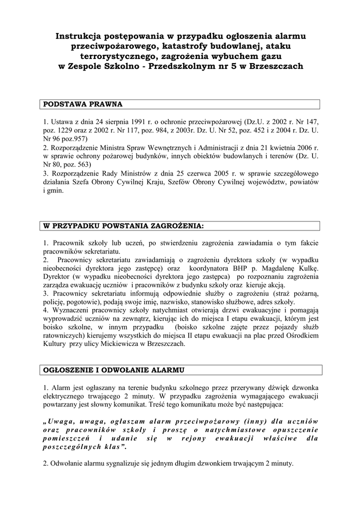 Instrukcja postępowania w przypadku ogłoszenia alarmu przeciwpożarowego, katastrofy budowlanej, ataku terrorystycznego, zagrożenia wybuchem gazu w Zespole Szkolno - Przedszkolnym nr 5 w Brzeszczach PODSTAWA PRAWNA 1. Ustawa z dnia 24 sierpnia 1991 r. o ochronie przeciwpożarowej (Dz.U. z 2002 r. Nr 147, poz. 1229 oraz z 2002 r. Nr 117, poz. 984, z 2003r. Dz. U. Nr 52, poz. 452 i z 2004 r. Dz. U. Nr 96 poz.957) 2. Rozporządzenie Ministra Spraw Wewnętrznych i Administracji z dnia 21 kwietnia 2006 r. w sprawie ochrony pożarowej budynków, innych obiektów budowlanych i terenów (Dz. U. Nr 80, poz. 563) 3. Rozporządzenie Rady Ministrów z dnia 25 czerwca 2005 r. w sprawie szczegółowego działania Szefa Obrony Cywilnej Kraju, Szefów Obrony Cywilnej województw, powiatów i gmin. W PRZYPADKU POWSTANIA ZAGROŻENIA: 1. Pracownik szkoły lub uczeń, po stwierdzeniu zagrożenia zawiadamia o tym fakcie pracowników sekretariatu. 2. Pracownicy sekretariatu zawiadamiają o zagrożeniu dyrektora szkoły (w wypadku nieobecności dyrektora jego zastępcę) oraz koordynatora BHP p. Magdalenę Kulkę. Dyrektor (w wypadku nieobecności dyrektora jego zastępca) po rozpoznaniu zagrożenia zarządza ewakuację uczniów i pracowników z budynku szkoły oraz kieruje akcją. 3. Pracownicy sekretariatu informują odpowiednie służby o zagrożeniu (straż pożarną, policję, pogotowie), podają swoje imię, nazwisko, stanowisko służbowe, adres szkoły. 4. Wyznaczeni pracownicy szkoły natychmiast otwierają drzwi ewakuacyjne i pomagają wyprowadzić uczniów na zewnątrz, kierując ich do miejsca I etapu ewakuacji, którym jest boisko szkolne, w innym przypadku (boisko szkolne zajęte przez pojazdy służb ratowniczych) kierujemy wszystkich do miejsca II etapu ewakuacji na plac przed Ośrodkiem Kultury przy ulicy Mickiewicza w Brzeszczach. OGŁOSZENIE I ODWOŁANIE ALARMU 1. Alarm jest ogłaszany na terenie budynku szkolnego przez przerywany dźwięk dzwonka elektrycznego trwającego 2 minuty. W przypadku zagrożenia wymagającego ewakuacji powtarzany jest słowny komunikat. Treść tego komunikatu może być następująca: „Uwaga, uwaga, ogłaszam alarm przeciwpożarowy (inny) dla uczniów oraz pracowników szkoły i proszę o natychmiastowe opuszczenie pomieszczeń i udanie się w rejony ewakuacji właściwe dla poszczególnych klas”. 2. Odwołanie alarmu sygnalizuje się jednym długim dzwonkiem trwającym 2 minuty. DROGI I PUNKTY EWAKUACYJNE SZKOŁY 1. Opuszczając budynek należy stosować się do znaków informacyjnych stanowiących o kierunku dróg ewakuacji i wyjściach ewakuacyjnych ze szkoły (strzałki na ścianach). 2. W trakcie opuszczania budynku należy zadbać, o sprawne i szybkie przemieszczanie się uczniów w kierunku wyjść ewakuacyjnych, w miarę możliwości prawą stroną klatki schodowej – umożliwi to swobodne poruszanie się po kondygnacjach służbom ratunkowym np. straż pożarna z wężami gaśniczymi. 3. W razie ewakuacji jest bezwzględny zakaz schodzenia do szatni np. celem zabrania odzieży! 4. Ewakuacja odbywa się w następujący sposób i kolejności: Sutereny: Uczniowie uczący się w salach nr 18, 19 wraz z nauczycielami, przebywający w jadalni, pracownicy kuchni, konserwatorzy, wychodzą wyjściem ewakuacyjnym nr 5 - wyjście przez kuchnię. Pawilon A- dół: Uczniowie uczący się w salach nr 1, 2, 3 wraz z nauczycielami oraz pracownicy przebywający w sekretariacie, gabinecie dyrektora, wicedyrektora, w gabinecie pielęgniarki, toalecie dla nauczycieli wychodzą wyjściem ewakuacyjnym nr 1 - wyjście główne. Pawilon A- góra: Uczniowie uczący się w salach nr 4, 5, 6, 7, 8 wraz z nauczycielami oraz pedagog szkolny, nauczyciele i uczniowie świetlicy, wychodzą wyjściem ewakuacyjnym nr 2 – wyjście na dziedziniec od strony sekretariatu. Pawilon C: Uczniowie świetlicy, sali katechetycznej wraz z nauczycielami wychodzą wyjściem ewakuacyjnym nr 2 – wyjście na dziedziniec od strony sekretariatu. Pawilon B- góra: Uczniowie uczący się w salach nr 13, 14, 15, 16, 17 wraz z nauczycielami oraz pracownicy przebywający w pokoju nauczycielskim, małej świetlicy, bibliotece wychodzą wyjściem ewakuacyjnym nr 3 – wyjście na dziedziniec od strony pokoju nauczycielskiego. Pawilon B- dół: Uczniowie uczący się w salach nr 9, 10, 11, 12, sali gimnastycznej wraz z nauczycielami wychodzą wyjściem ewakuacyjnym nr 4 – wyjście przewiązką od strony sali gimnastycznej 5. Pierwszym miejscem zbiórki jest boisko szkolne, a drugim miejscem zbiórki jest plac przed Ośrodkiem Kultury przy ulicy Mickiewicza w Brzeszczach. OGÓLNE ZASADY EWAKUACJI 1. Ściśle stosować się do poleceń przełożonych lub prowadzących akcję ratowniczą. 2. Wyłączyć i zabezpieczyć urządzenia elektryczne i gazowe. 3. Zakończyć pracę sprzętu komputerowego. 4. Otworzyć wszystkie pomieszczenia gospodarcze. 5. Sprawdzić pomieszczenia czy nie pozostały w nich jakieś osoby. 6. Wytypowane osoby do działań zabezpieczających ewakuację winny przystąpić do wykonywania przypisanych im zadań. 7. Wszystkie osoby opuszczające szkołę powinny zabrać rzeczy osobiste i przystąpić do ewakuacji postępując zgodnie z zaleceniami i udać się na wyznaczone miejsce zbiórki (boisko szkolne). 8. W trakcie opuszczania budynku swoim zachowaniem wpływać na sprawny i spokojny przebieg akcji, w sposób nie wywołujący paniki. 9. Na miejscu ewakuacji nauczyciel z uczniami i pozostali pracownicy przebywają do czasu otrzymania stosownej informacji, co do powrotu do budynku i dalszej pracy i nauki. 9. Klucze do pomieszczeń gospodarczych znajdują się na portierni. OSOBY PRZEBYWAJĄCE NA TERENIE BUDYNKU SZKOŁY OPUSZCZAJĄ POMIESZCZENIA I BUDYNEK ZGODNIE Z NASTĘPUJĄCYMI USTALENIAMI: 1. Nauczyciel prowadzący zajęcia w danej sali nakazuje uczniom opuścić salę i budynek szkoły informując o kierunku ewakuacji (zgodnie ze schematem dróg ewakuacji). 2. Nauczyciel wył